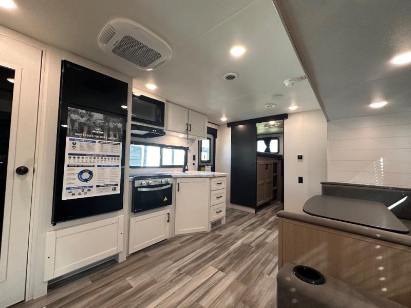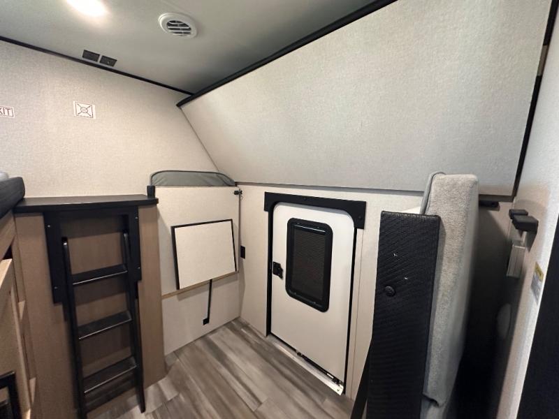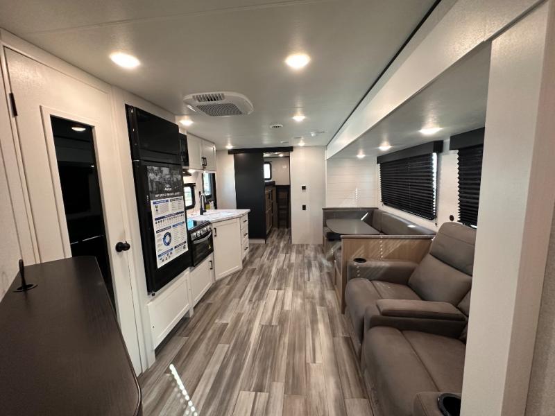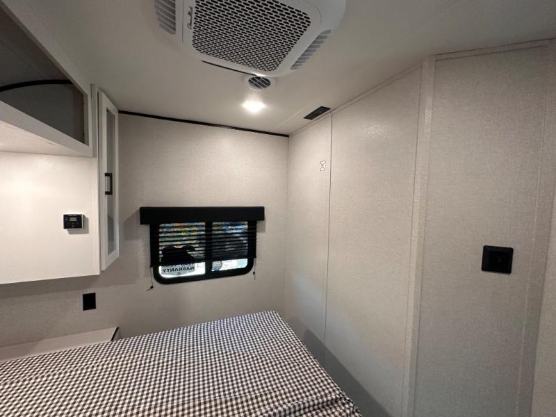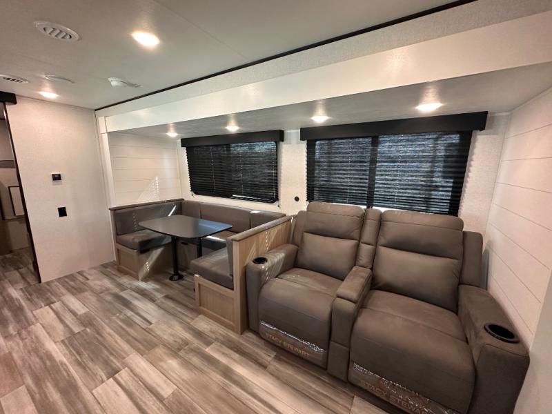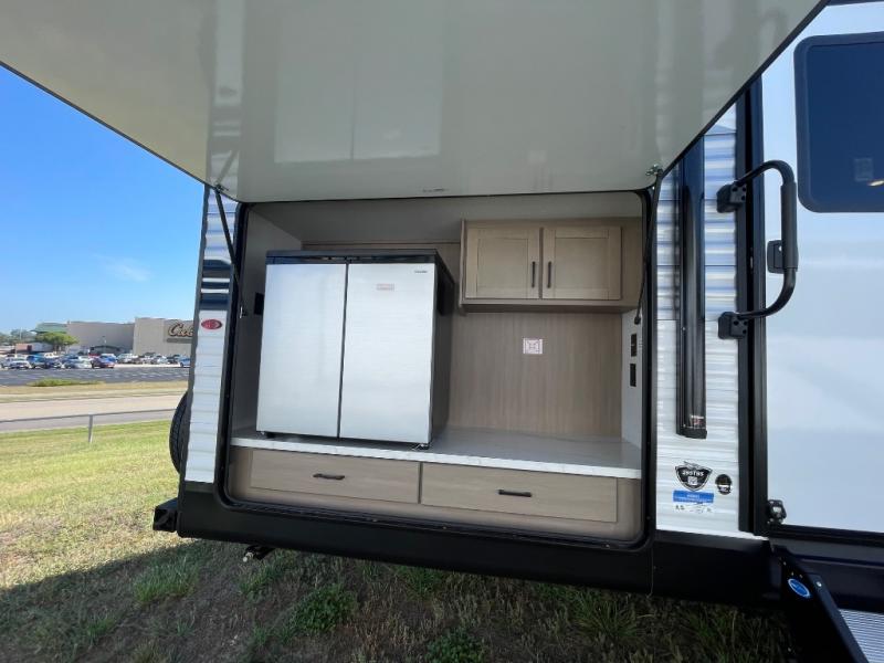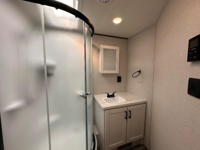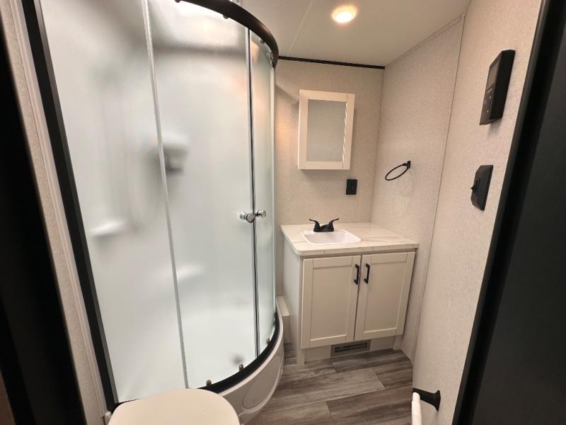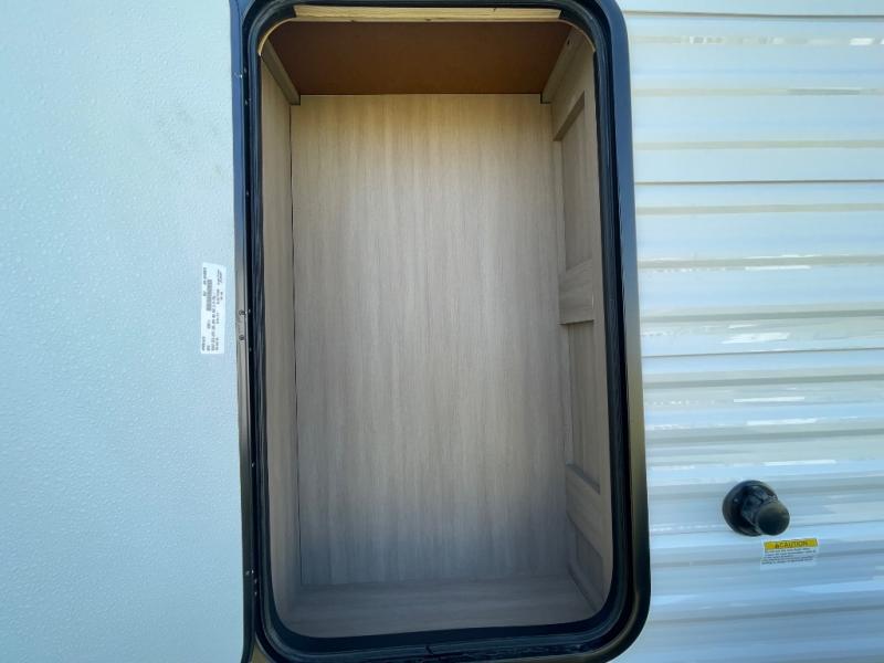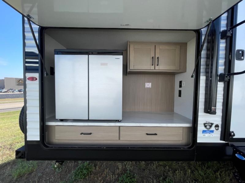 It's time to ditch that old tent and upgrade to this spacious travel trailer! There is a rear private bunkhouse includes a flip-up bunk over a 28" x 76" bunk, plus a bunk across the room and a wardrobe. You'll enjoy the front private bedroom all to yourselves with a queen bed and dual wardrobes, and the full bath is close by for easy nighttime use. A U-shaped dinette slide and sofa in the main living area provide your crew with space to relax and dine together, and the fully equipped kitchen lets you cook up your best meals. Outside, you'll find exterior storage, an 18' power awning, plus an outdoor refrigerator, shelf, and TV prep!
