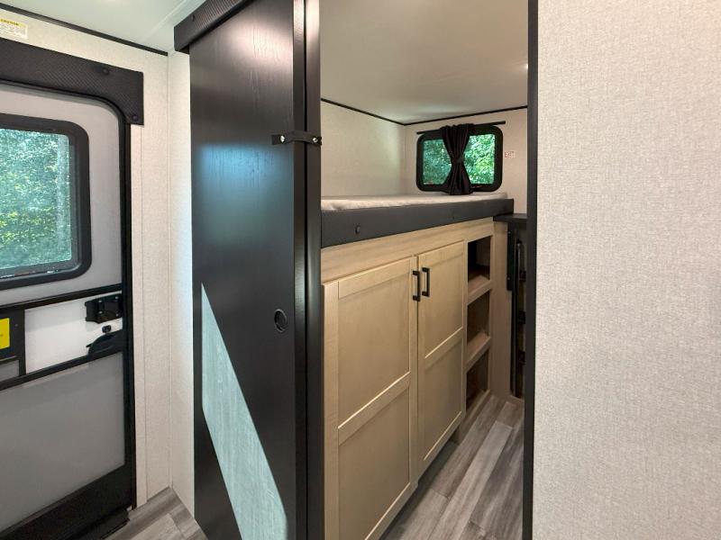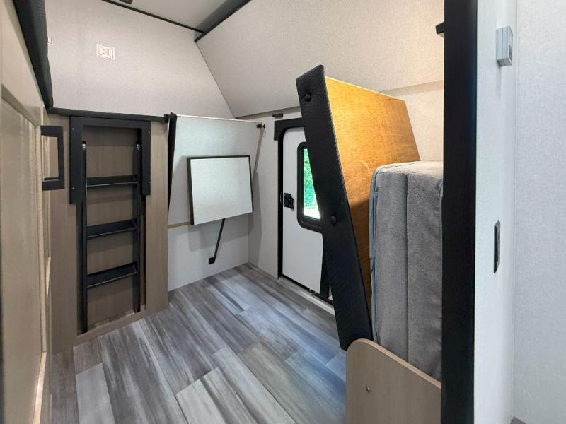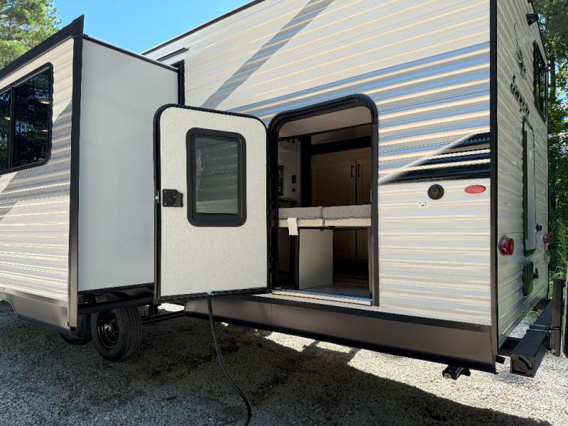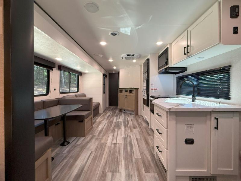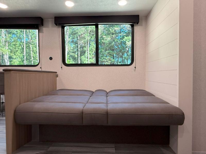 It's time to ditch that old tent and upgrade to this spacious travel trailer! There is a rear private bunkhouse includes a flip-up bunk over a 28" x 76" bunk, plus a bunk across the room and a wardrobe. You'll enjoy the front private bedroom all to yourselves with a queen bed and dual wardrobes, and the full bath is close by for easy nighttime use. A U-shaped dinette slide and sofa in the main living area provide your crew with space to relax and dine together, and the fully equipped kitchen lets you cook up your best meals. Outside, you'll find exterior storage, an 18' power awning, plus an outdoor refrigerator, shelf, and TV prep!