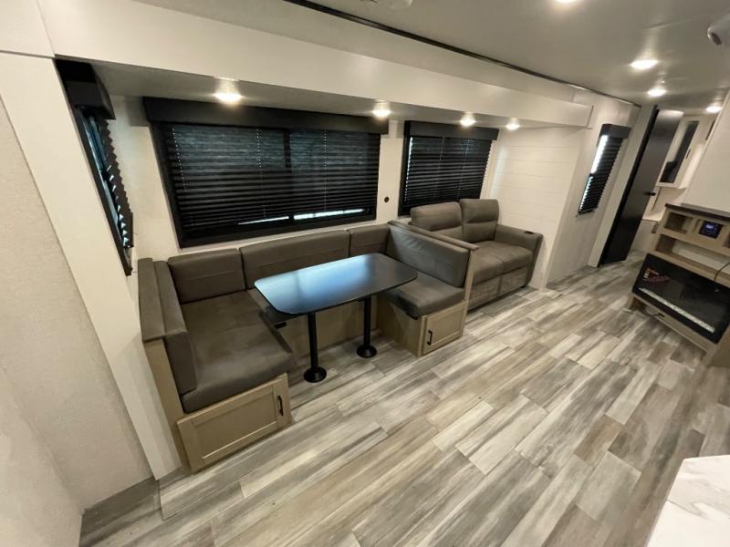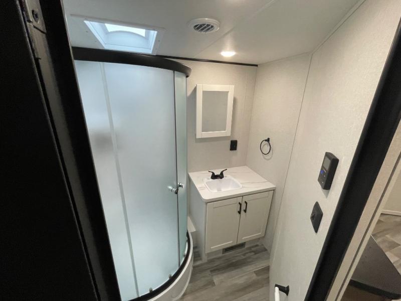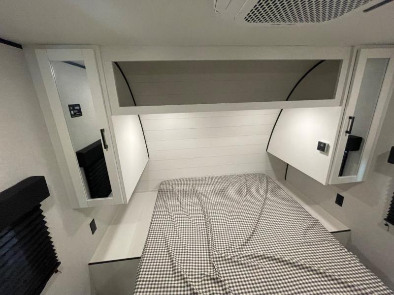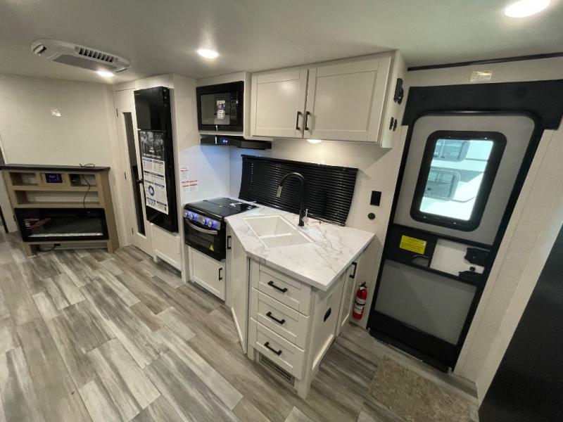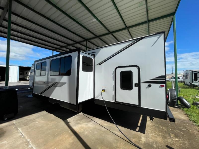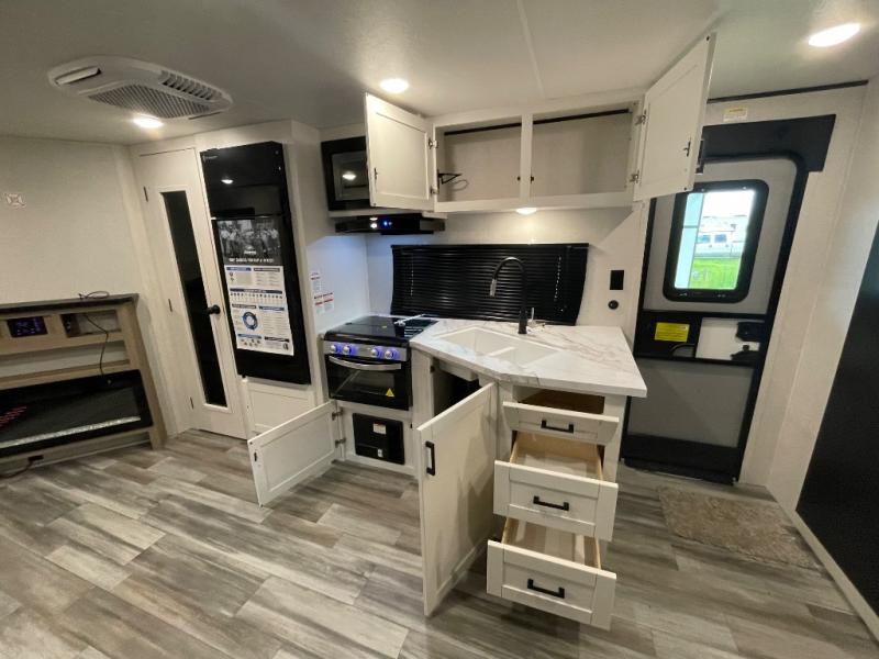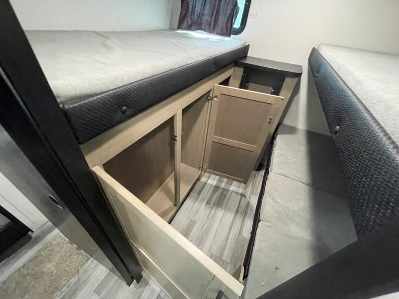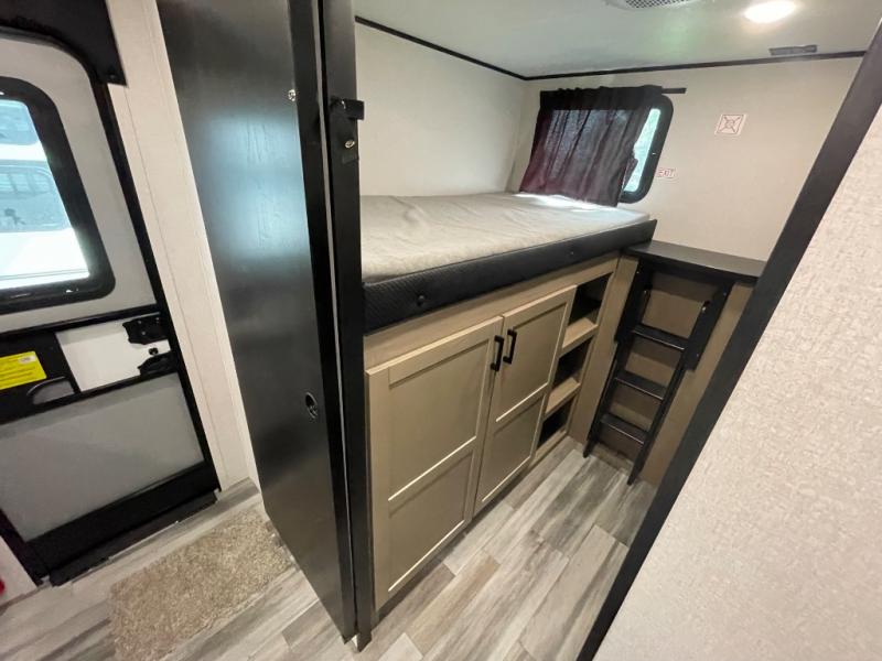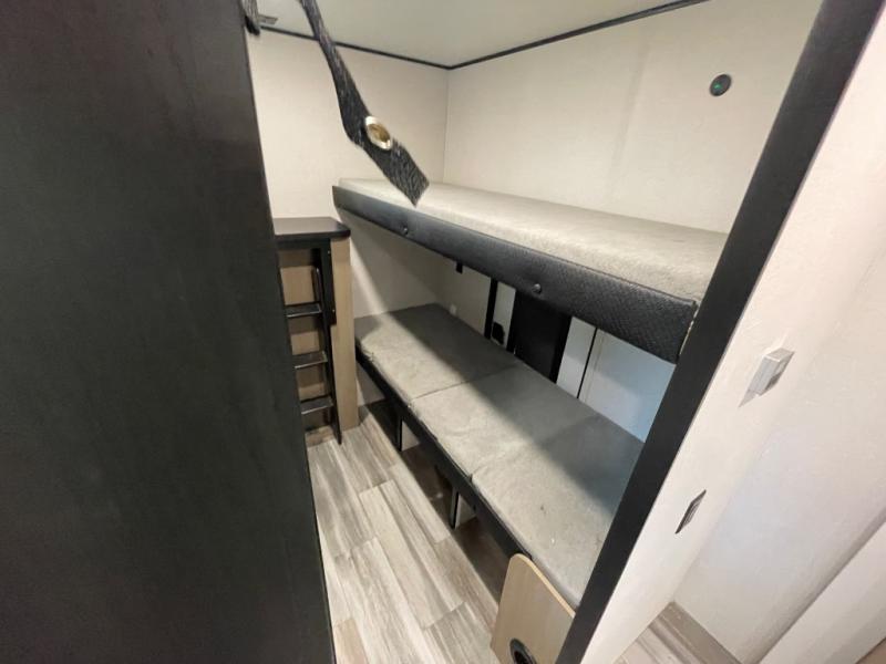 It's time to ditch that old tent and upgrade to this spacious travel trailer! There is a rear private bunkhouse includes a flip-up bunk over a 28" x 76" bunk, plus a bunk across the room and a wardrobe. You'll enjoy the front private bedroom all to yourselves with a queen bed and dual wardrobes, and the full bath is close by for easy nighttime use. A U-shaped dinette slide and sofa in the main living area provide your crew with space to relax and dine together, and the fully equipped kitchen lets you cook up your best meals. Outside, you'll find exterior storage, an 18' power awning, plus an outdoor refrigerator, shelf, and TV prep!