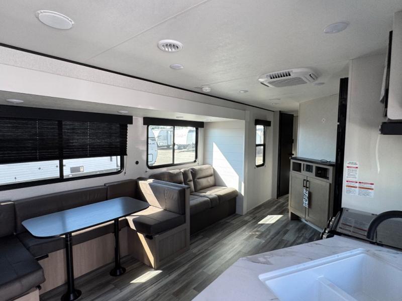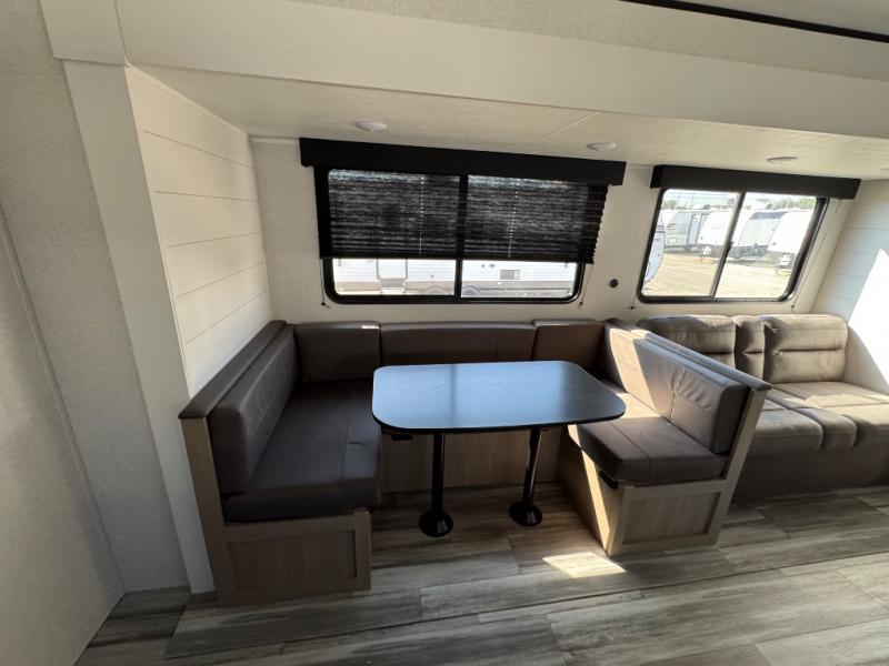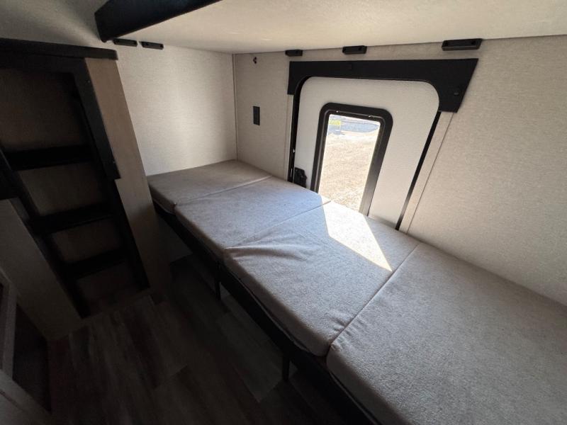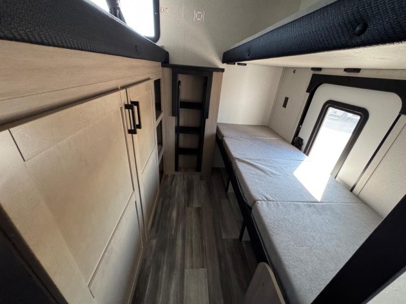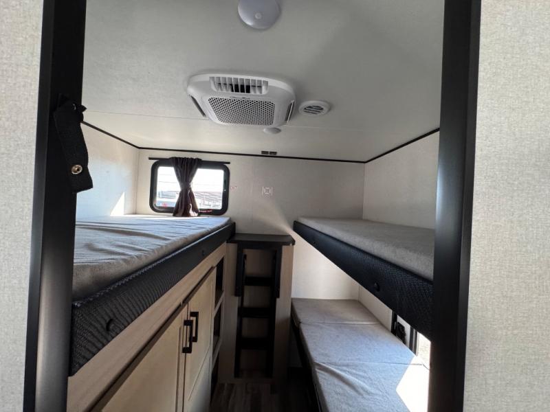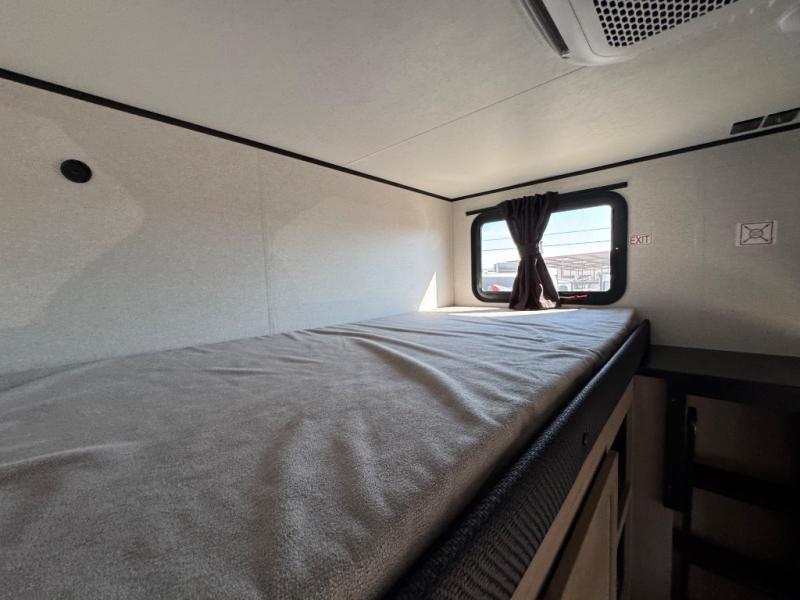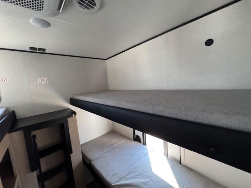 It's time to ditch that old tent and upgrade to this spacious travel trailer! There is a rear private bunkhouse includes a flip-up bunk over a 28" x 76" bunk, plus a bunk across the room and a wardrobe. You'll enjoy the front private bedroom all to yourselves with a queen bed and dual wardrobes, and the full bath is close by for easy nighttime use. A U-shaped dinette slide and sofa in the main living area provide your crew with space to relax and dine together, and the fully equipped kitchen lets you cook up your best meals. Outside, you'll find exterior storage, an 18' power awning, plus an outdoor refrigerator, shelf, and TV prep!