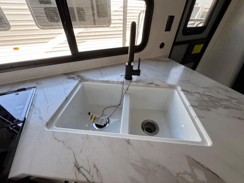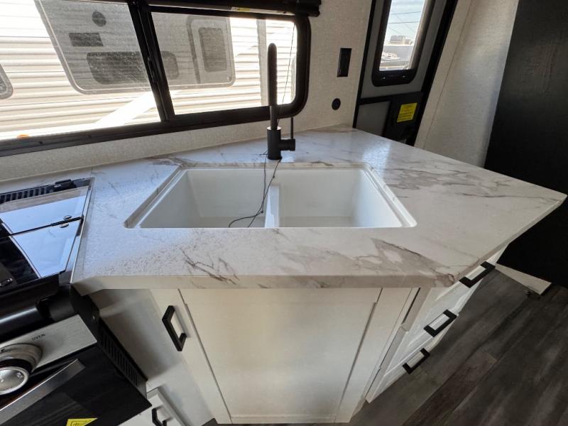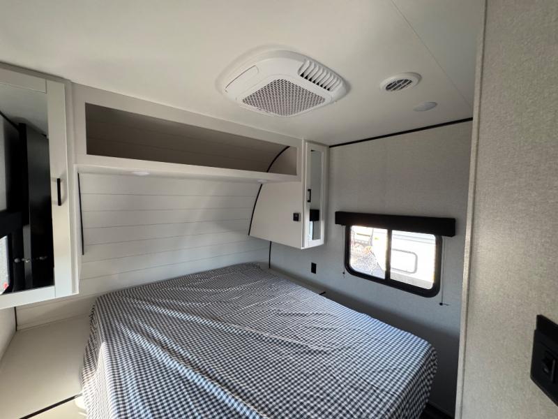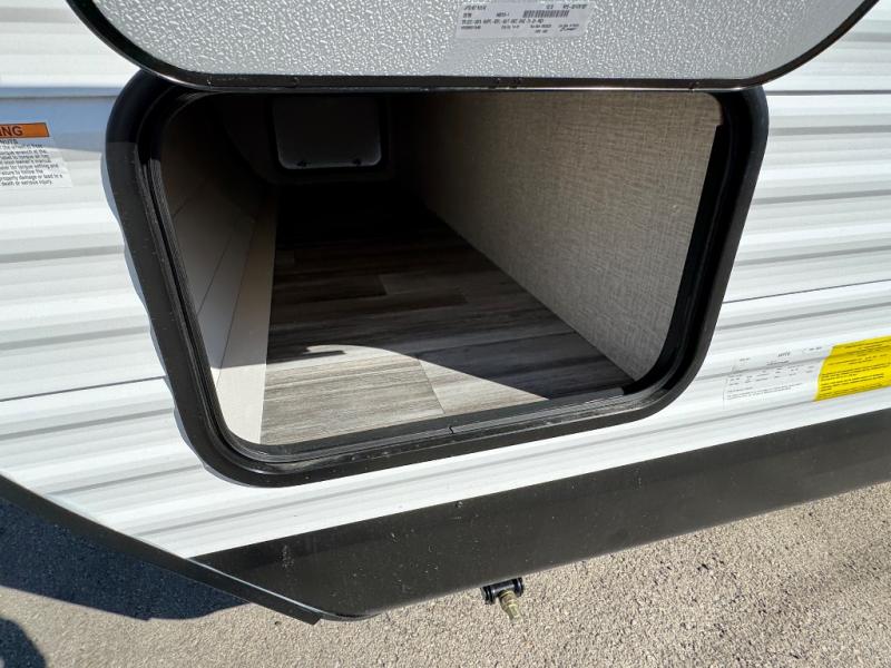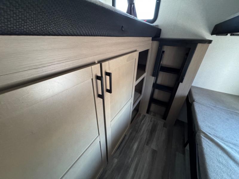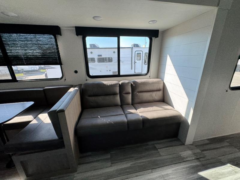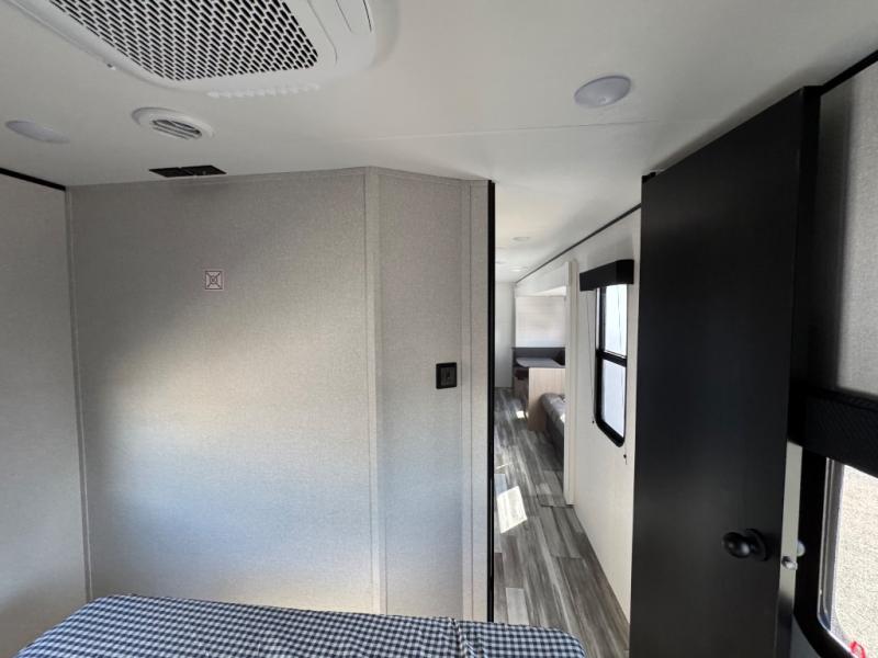It's time to ditch that old tent and upgrade to this spacious travel trailer! There is a rear private bunkhouse includes a flip-up bunk over a 28" x 76" bunk, plus a bunk across the room and a wardrobe. You'll enjoy the front private bedroom all to yourselves with a queen bed and dual wardrobes, and the full bath is close by for easy nighttime use. A U-shaped dinette slide and sofa in the main living area provide your crew with space to relax and dine together, and the fully equipped kitchen lets you cook up your best meals. Outside, you'll find exterior storage, an 18' power awning, plus an outdoor refrigerator, shelf, and TV prep!
