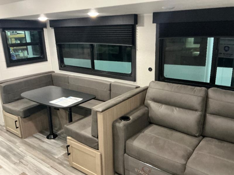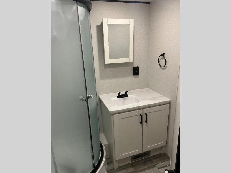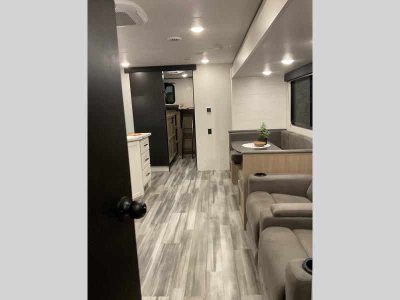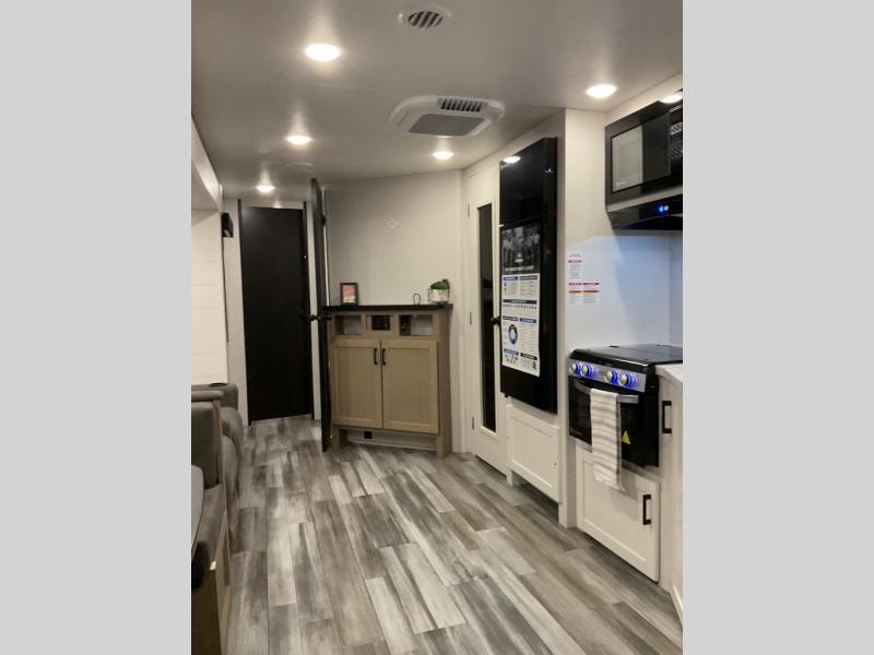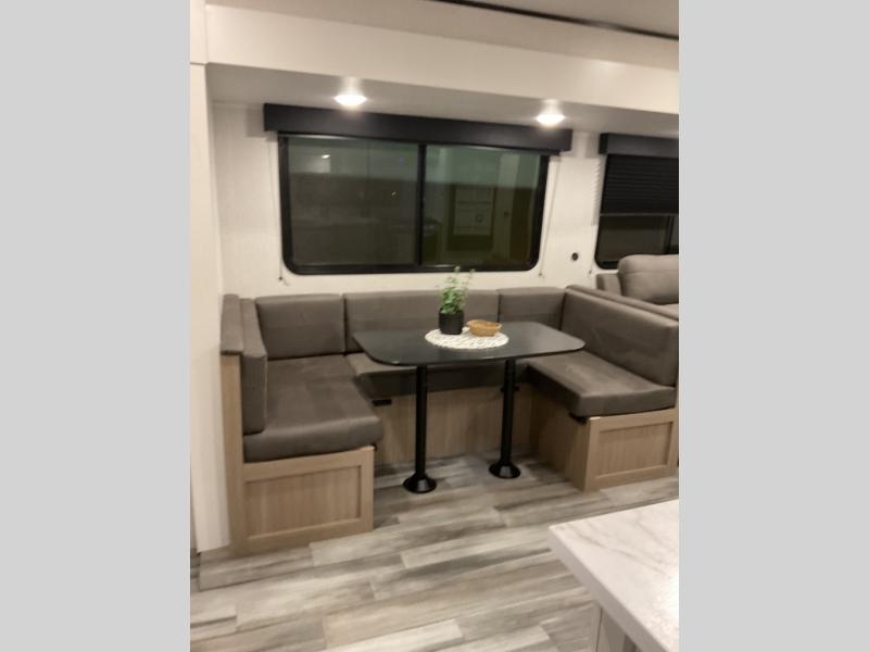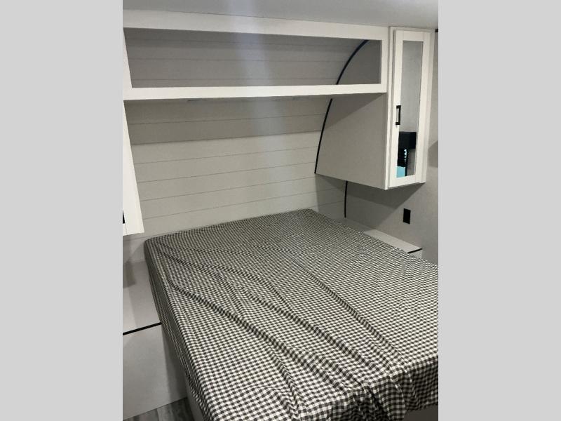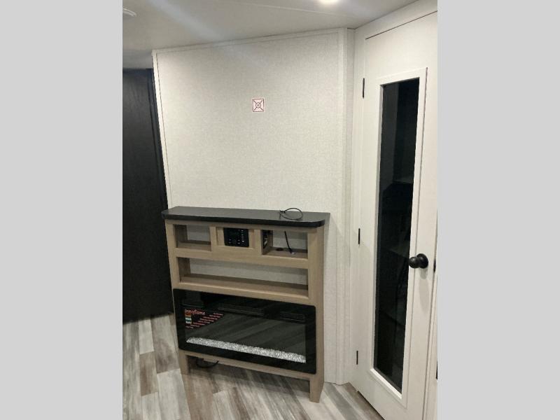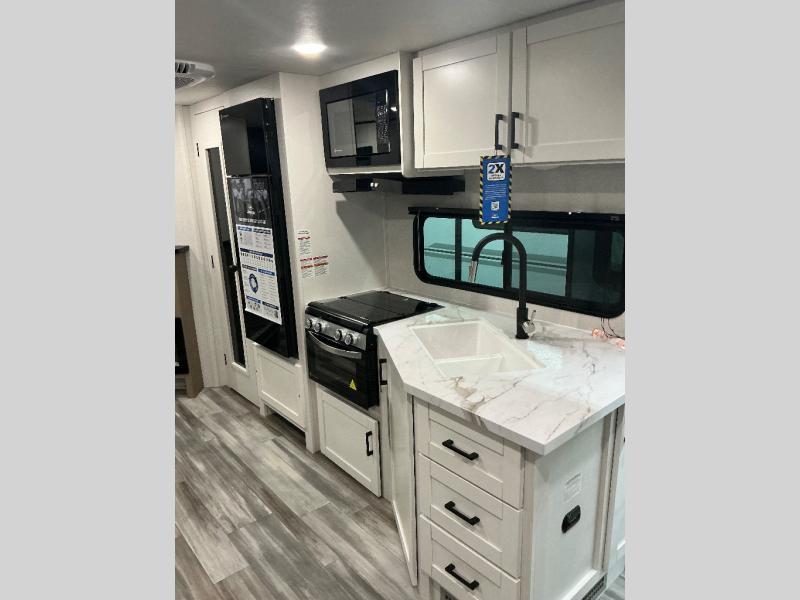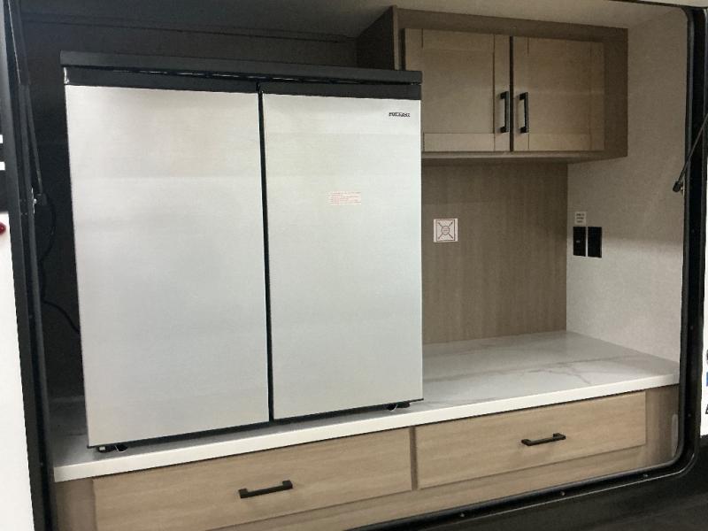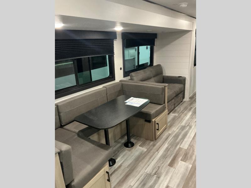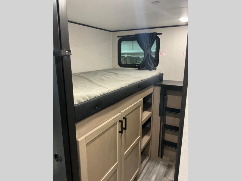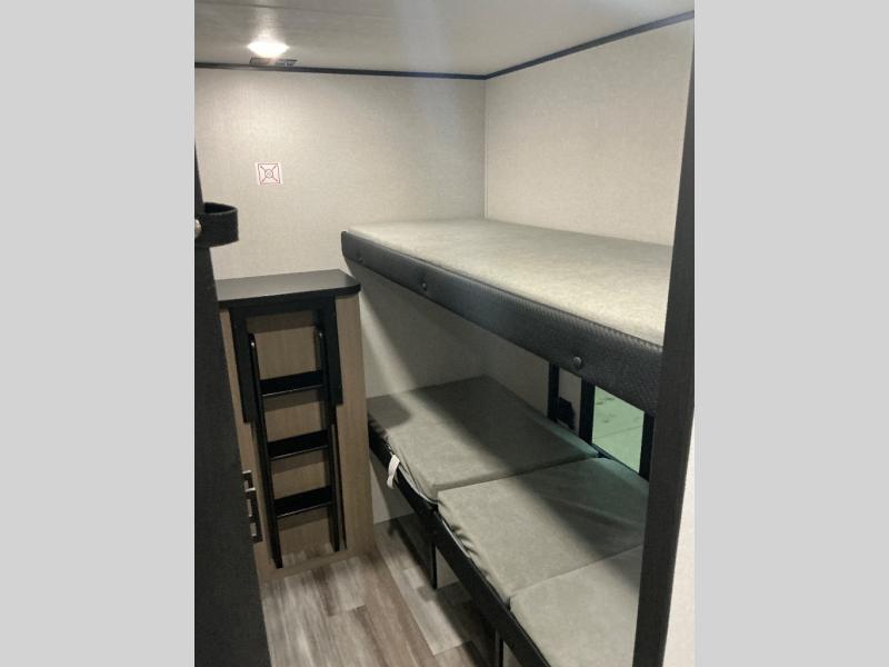 It's time to ditch that old tent and upgrade to this spacious travel trailer! There is a rear private bunkhouse includes a flip-up bunk over a 28" x 76" bunk, plus a bunk across the room and a wardrobe. You'll enjoy the front private bedroom all to yourselves with a queen bed and dual wardrobes, and the full bath is close by for easy nighttime use. A U-shaped dinette slide and sofa in the main living area provide your crew with space to relax and dine together, and the fully equipped kitchen lets you cook up your best meals. Outside, you'll find exterior storage, an 18' power awning, plus an outdoor refrigerator, shelf, and TV prep!