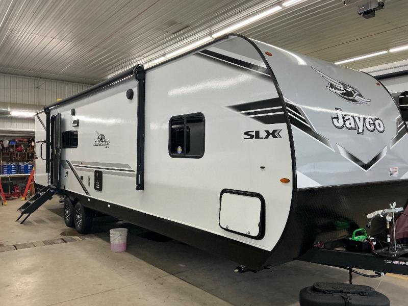 The Jayco Jay Flight SLX travel trailer is quite easy to own because it is lightweight for an easier towing experience. Built on a fully integrated A-frame with galvanized-steel, impact-resistant wheel wells, the Jay Flight SLX has quality at its very foundation. That quality continues on to the electric self-adjusting brakes, easy-lube hubs, Magnum Truss roof system, and LP quick connect. Some of what the mandatory Customer Value Package includes is backup camera prep, Keyed-Alike entry and baggage doors, and an on-demand tankless water heater.