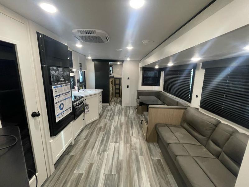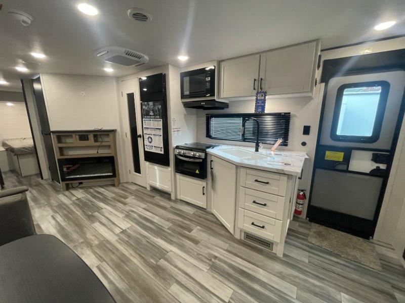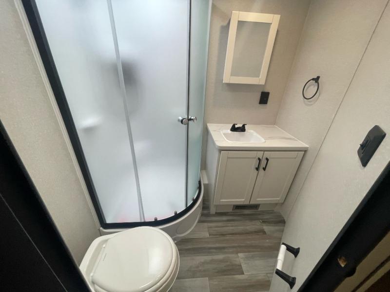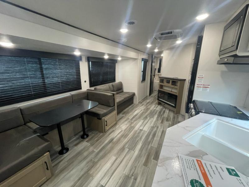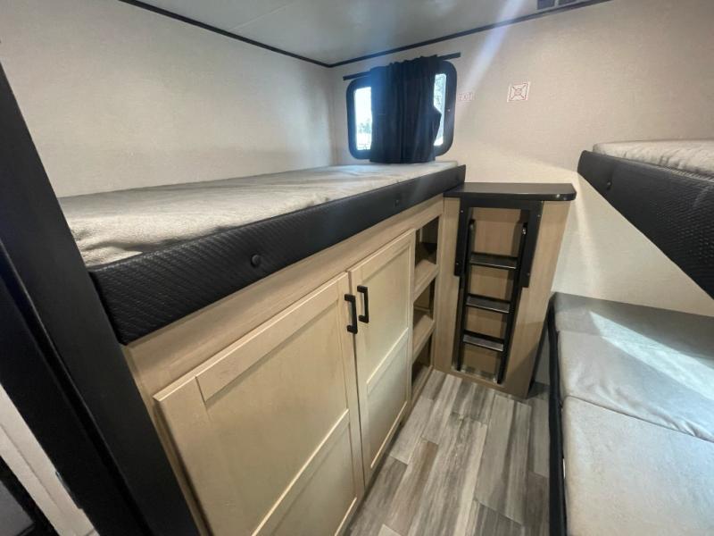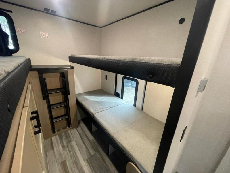It's time to ditch that old tent and upgrade to this spacious travel trailer! There is a rear private bunkhouse includes a flip-up bunk over a 28" x 76" bunk, plus a bunk across the room and a wardrobe. You'll enjoy the front private bedroom all to yourselves with a queen bed and dual wardrobes, and the full bath is close by for easy nighttime use. A U-shaped dinette slide and sofa in the main living area provide your crew with space to relax and dine together, and the fully equipped kitchen lets you cook up your best meals. Outside, you'll find exterior storage, an 18' power awning, plus an outdoor refrigerator, shelf, and TV prep!
