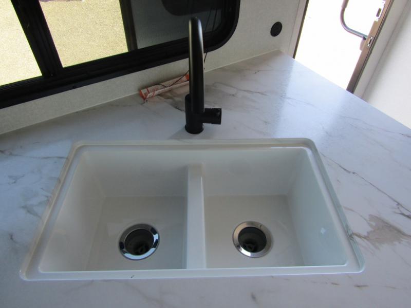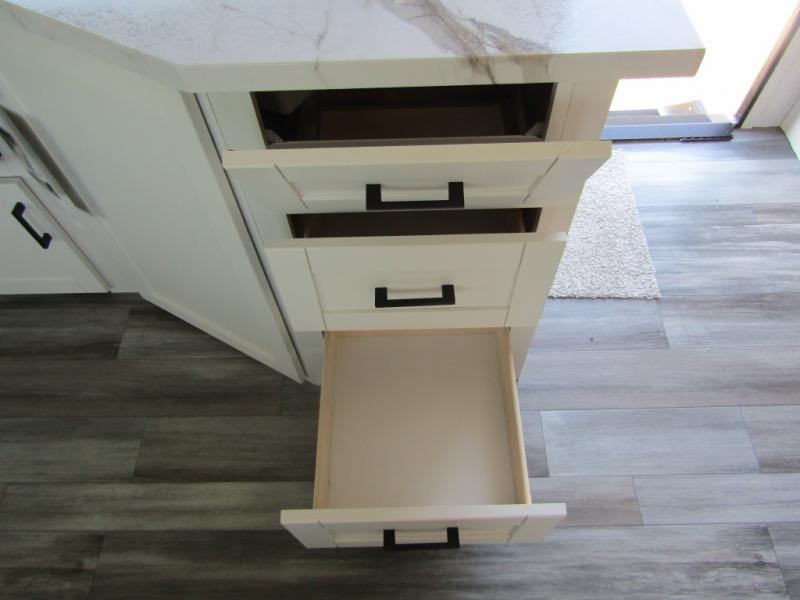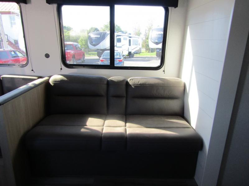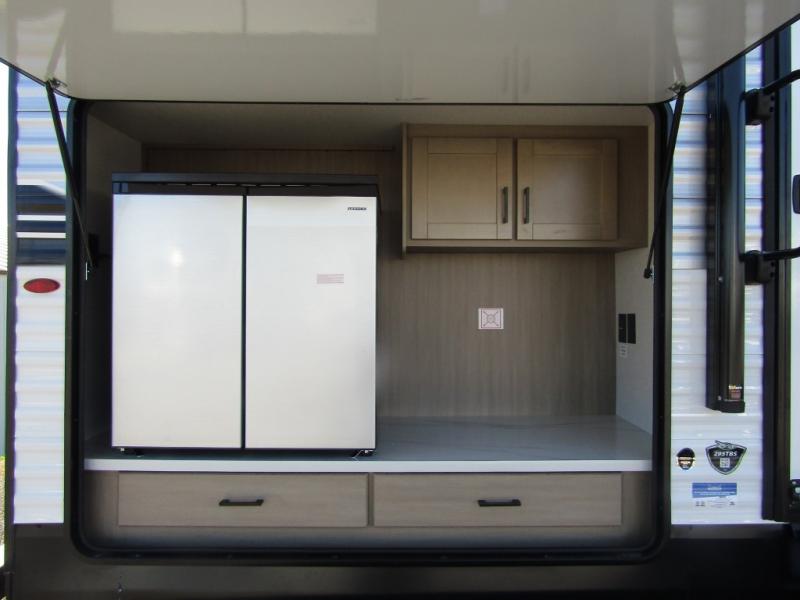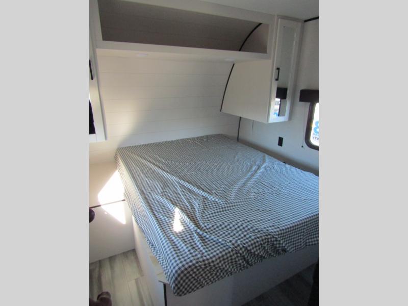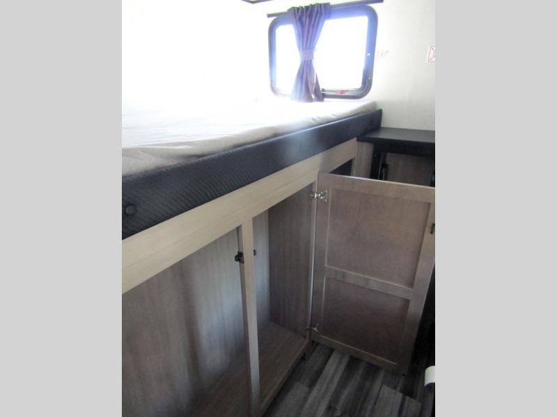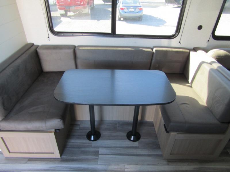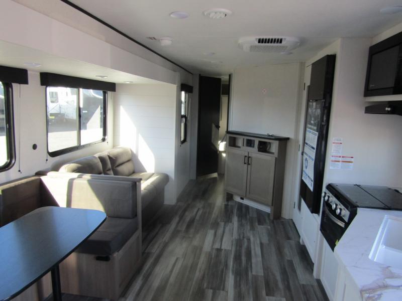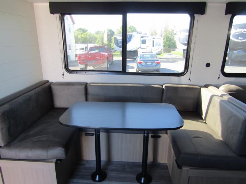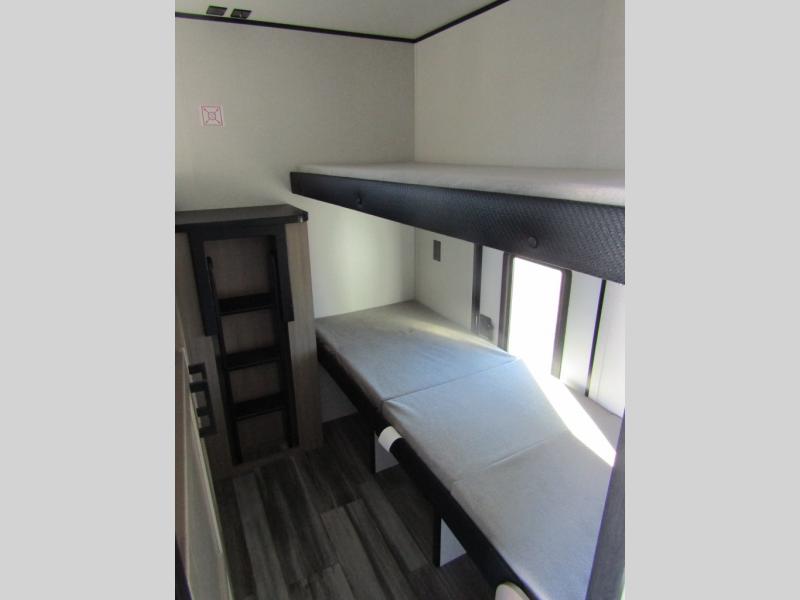It's time to ditch that old tent and upgrade to this spacious travel trailer! There is a rear private bunkhouse includes a flip-up bunk over a 28" x 76" bunk, plus a bunk across the room and a wardrobe. You'll enjoy the front private bedroom all to yourselves with a queen bed and dual wardrobes, and the full bath is close by for easy nighttime use. A U-shaped dinette slide and sofa in the main living area provide your crew with space to relax and dine together, and the fully equipped kitchen lets you cook up your best meals. Outside, you'll find exterior storage, an 18' power awning, plus an outdoor refrigerator, shelf, and TV prep!