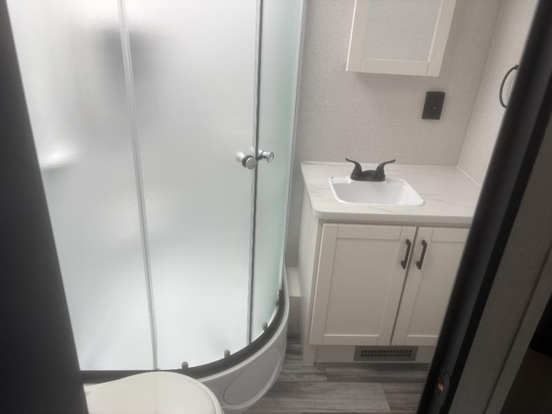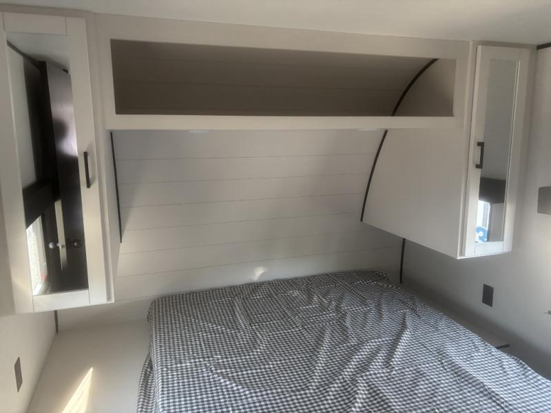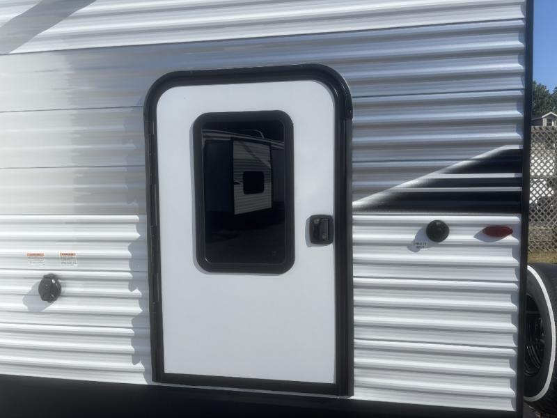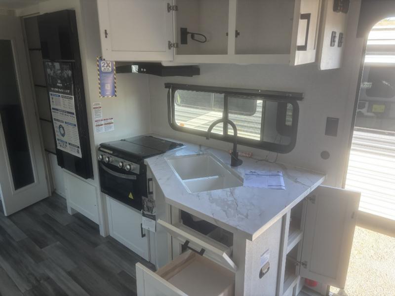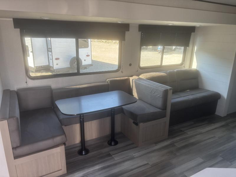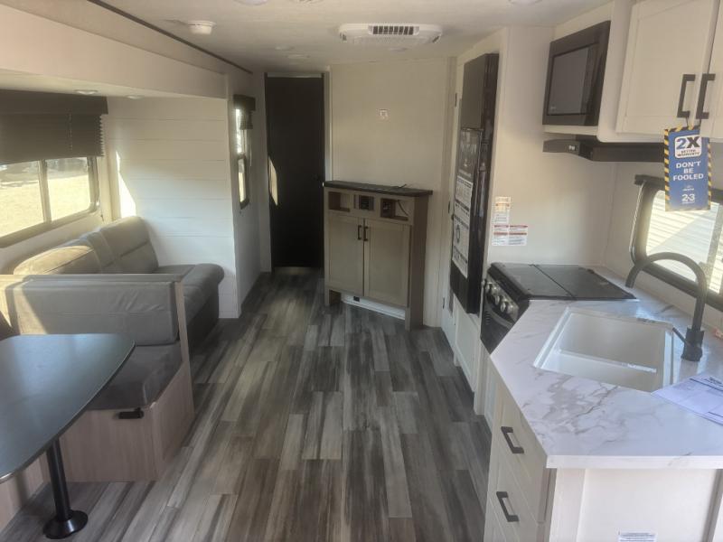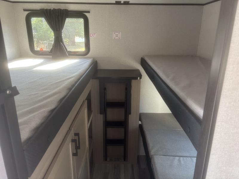 It's time to ditch that old tent and upgrade to this spacious travel trailer! There is a rear private bunkhouse includes a flip-up bunk over a 28" x 76" bunk, plus a bunk across the room and a wardrobe. You'll enjoy the front private bedroom all to yourselves with a queen bed and dual wardrobes, and the full bath is close by for easy nighttime use. A U-shaped dinette slide and sofa in the main living area provide your crew with space to relax and dine together, and the fully equipped kitchen lets you cook up your best meals. Outside, you'll find exterior storage, an 18' power awning, plus an outdoor refrigerator, shelf, and TV prep!