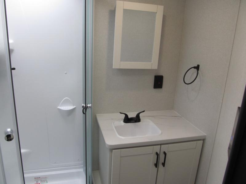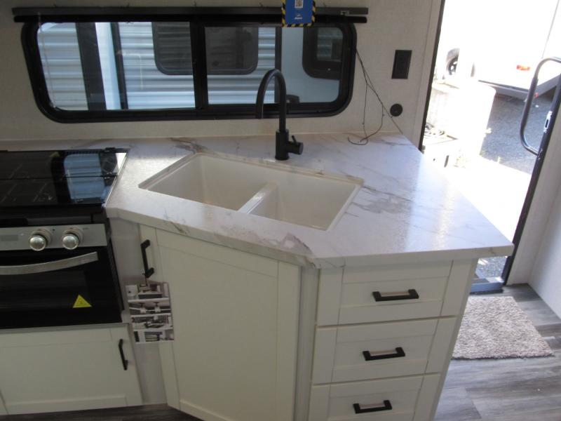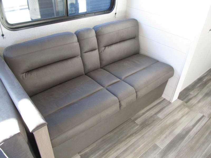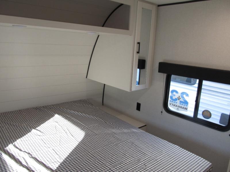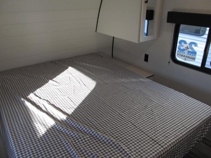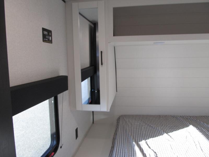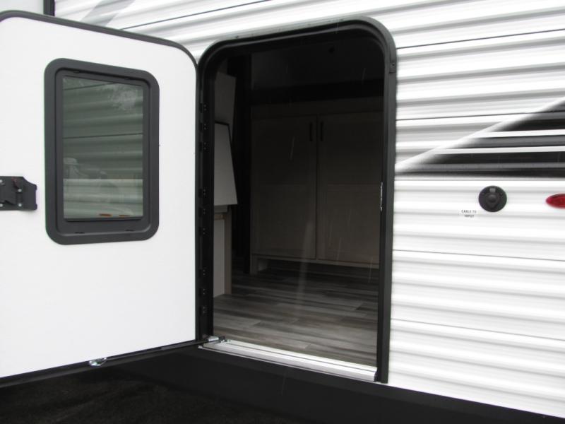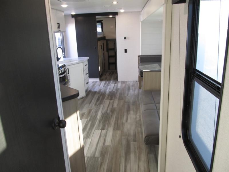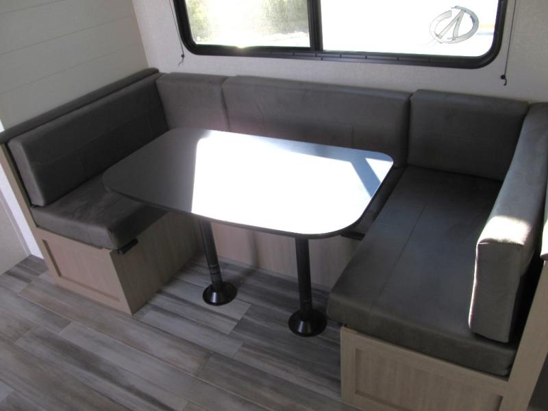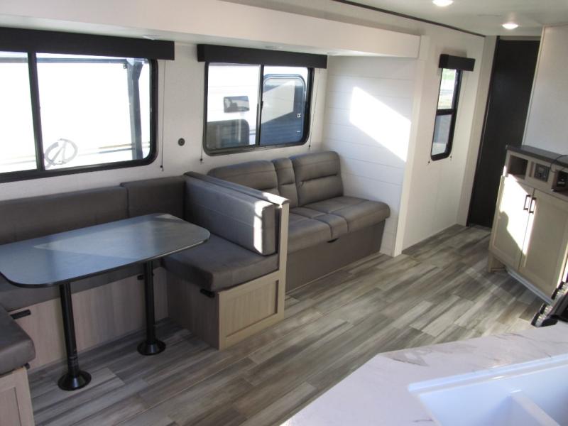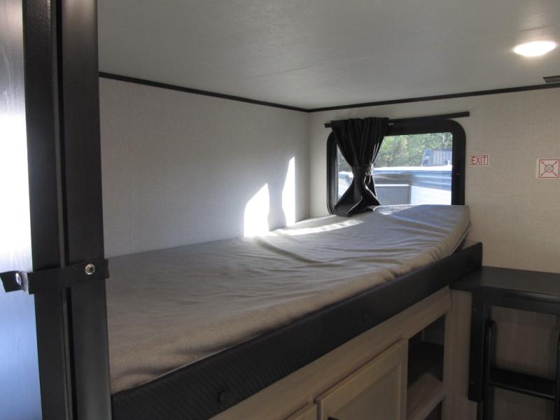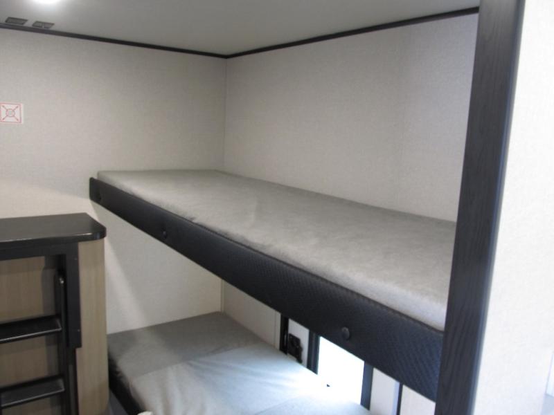 It's time to ditch that old tent and upgrade to this spacious travel trailer! There is a rear private bunkhouse includes a flip-up bunk over a 28" x 76" bunk, plus a bunk across the room and a wardrobe. You'll enjoy the front private bedroom all to yourselves with a queen bed and dual wardrobes, and the full bath is close by for easy nighttime use. A U-shaped dinette slide and sofa in the main living area provide your crew with space to relax and dine together, and the fully equipped kitchen lets you cook up your best meals. Outside, you'll find exterior storage, an 18' power awning, plus an outdoor refrigerator, shelf, and TV prep!