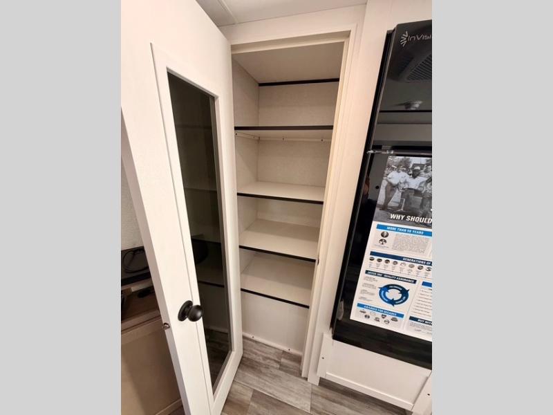 Outside, you’ll find generous exterior storage compartments, an 18' power awning with LED lights for shaded outdoor living, plus an outdoor refrigerator, shelf, and TV prep for the ultimate campsite setup.