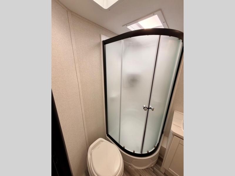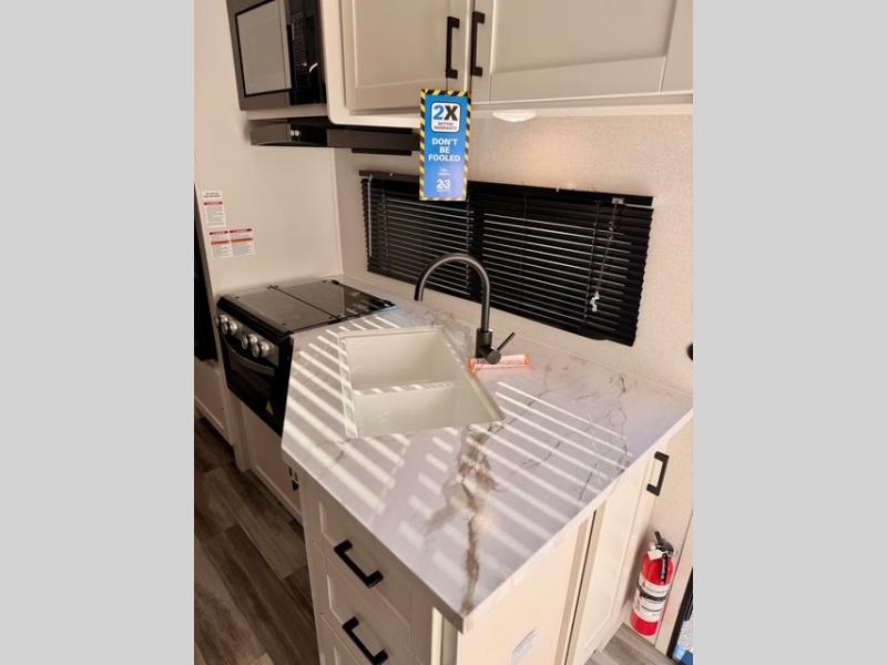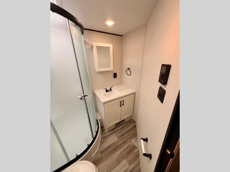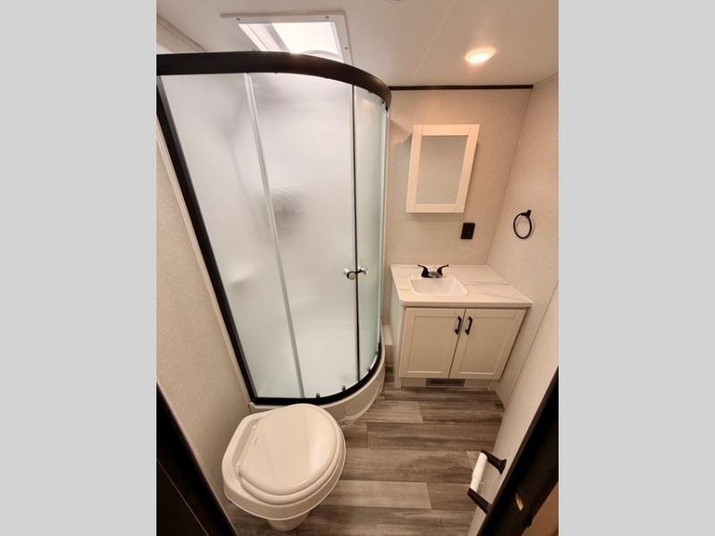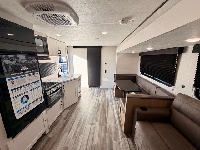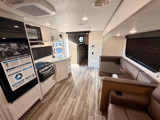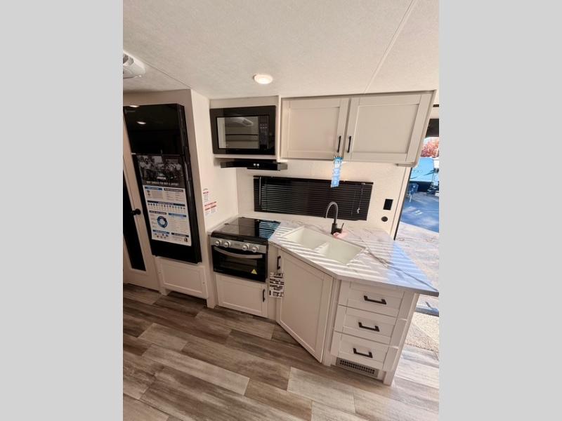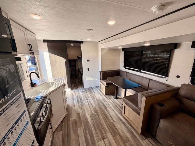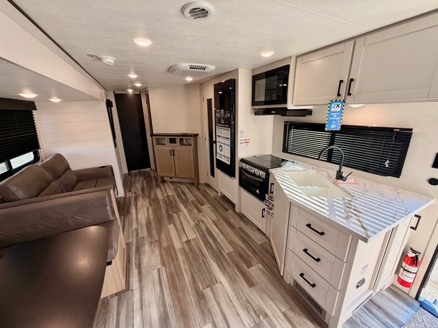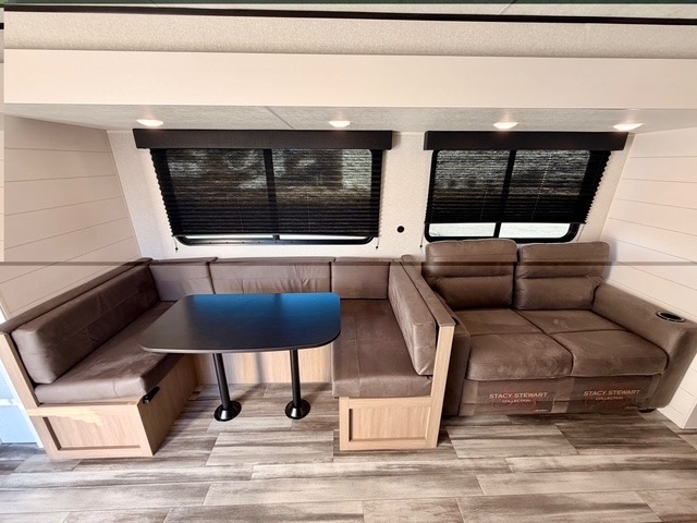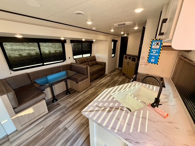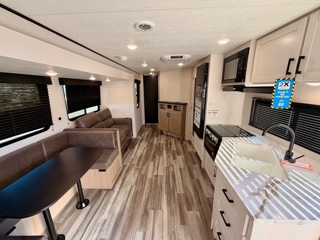 Up front, you’ll enjoy the privacy of your own bedroom featuring a queen bed, dual wardrobes, overhead storage, and nightstands for added convenience. The full bath is centrally located for easy access and includes a tub/shower surround, toilet, sink with vanity, and linen storage for towels and toiletries. In the main living area, a large U-shaped dinette slide and sofa provide plenty of seating for meals, game nights, or relaxing after a day outdoors. The fully equipped kitchen offers a three-burner cooktop, microwave, 8 cu. ft. 12V refrigerator, and ample cabinet space to store cookware and pantry items.