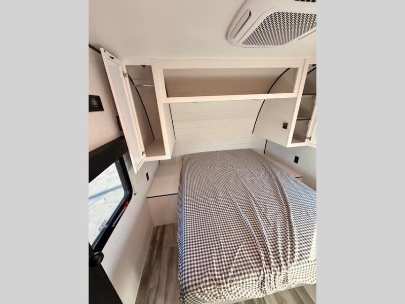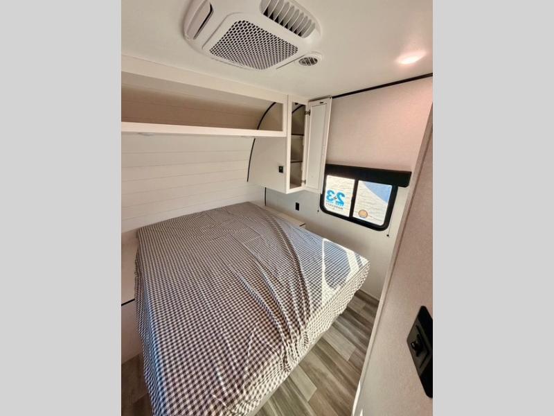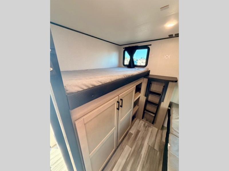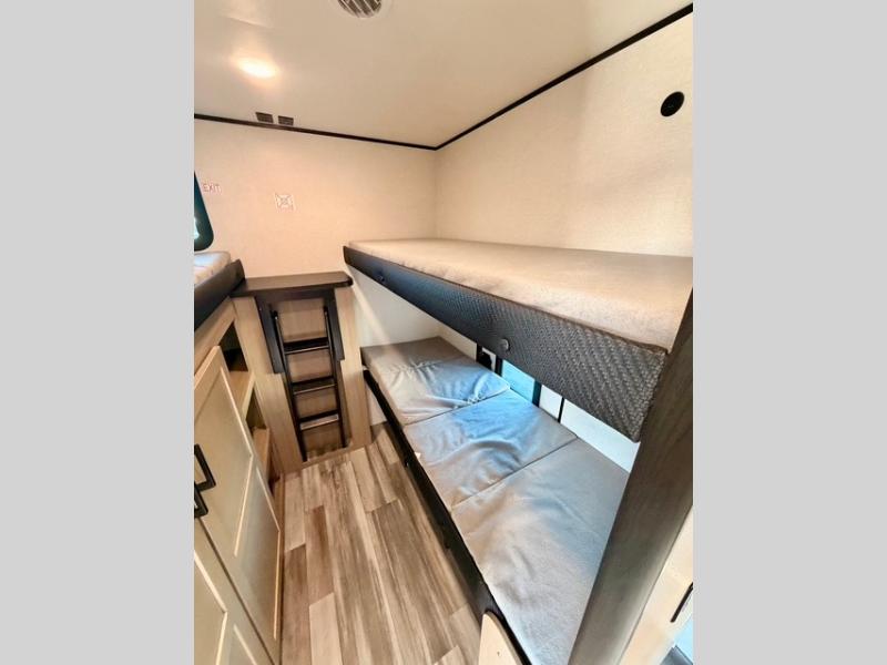 It's time to ditch that old tent and upgrade to this spacious, family-friendly travel trailer built for comfort and convenience. The rear private bunkhouse is perfect for kids or guests and includes a flip-up bunk over a 28" x 76" bunk with a convenient cargo door underneath for bikes, coolers, or larger gear. Across the room, you’ll find an additional bunk and a wardrobe to keep clothes and essentials organized, making this space both practical and comfortable.