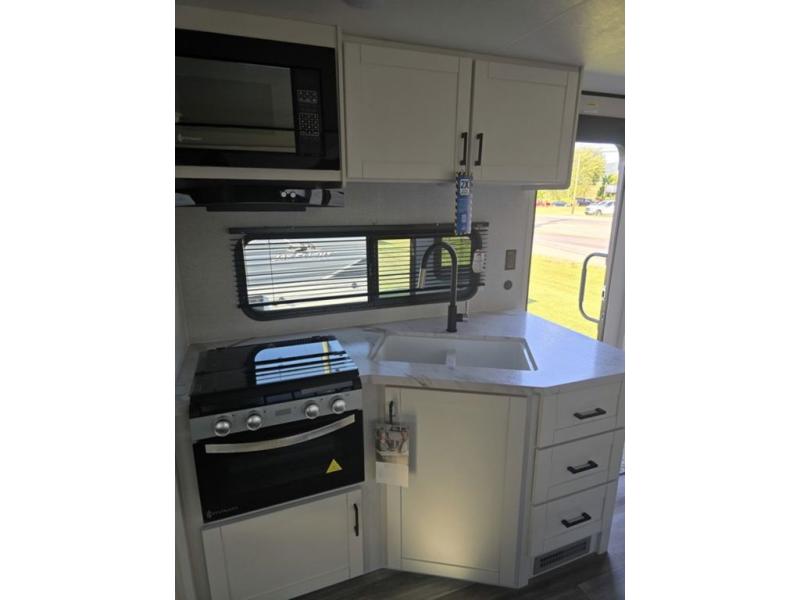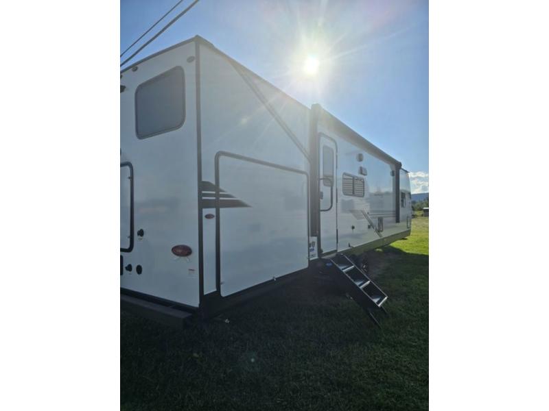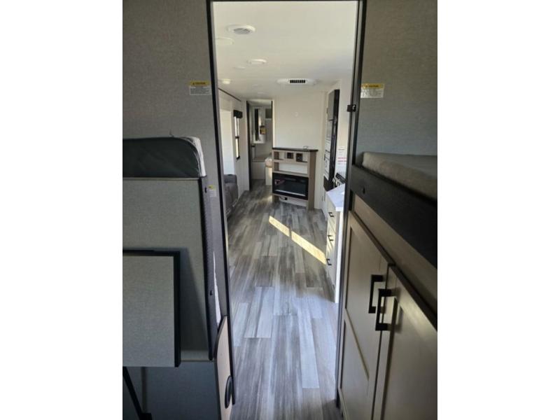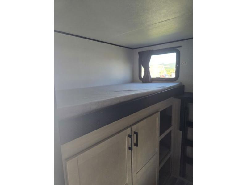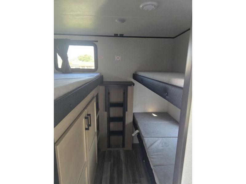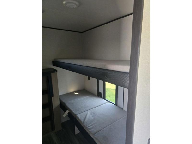 It's time to ditch that old tent and upgrade to this spacious travel trailer! There is a rear private bunkhouse includes a flip-up bunk over a 28" x 76" bunk, plus a bunk across the room and a wardrobe. You'll enjoy the front private bedroom all to yourselves with a queen bed and dual wardrobes, and the full bath is close by for easy nighttime use. A U-shaped dinette slide and sofa in the main living area provide your crew with space to relax and dine together, and the fully equipped kitchen lets you cook up your best meals. Outside, you'll find exterior storage, an 18' power awning, plus an outdoor refrigerator, shelf, and TV prep!