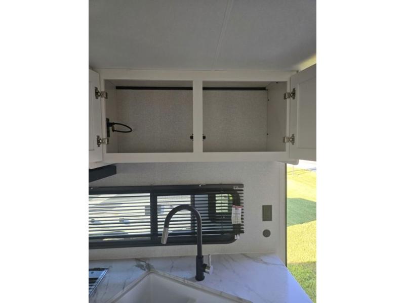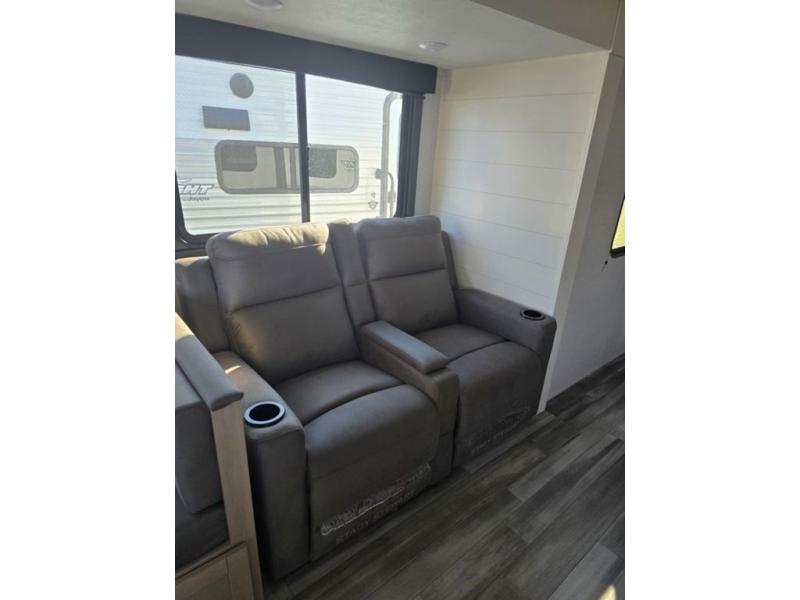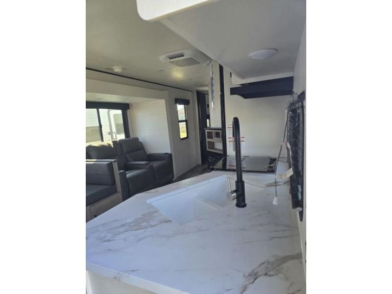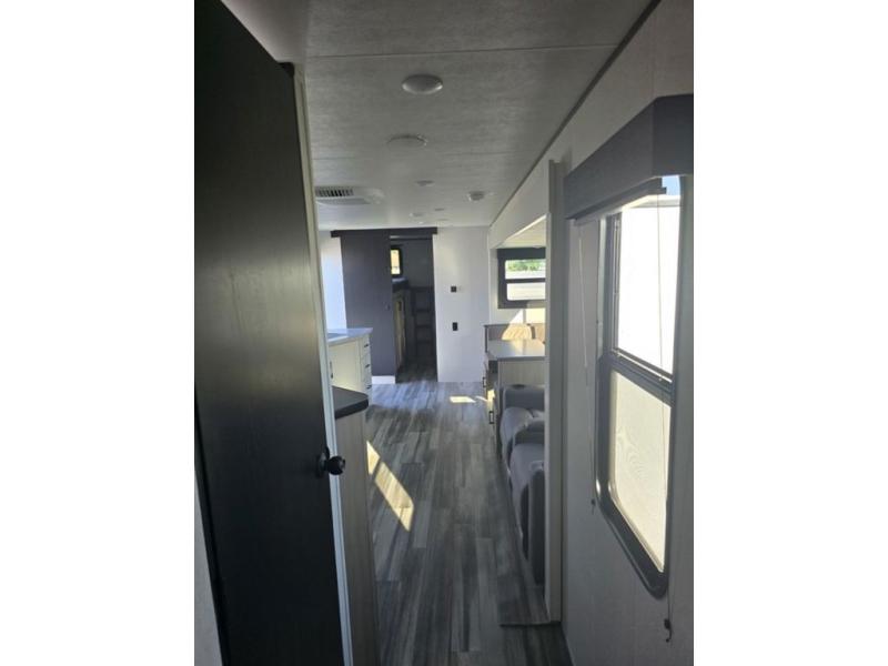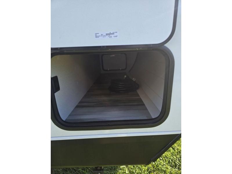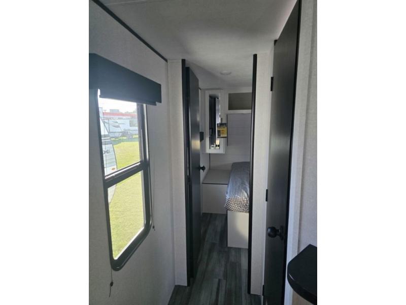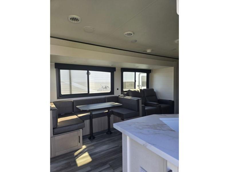 It's time to ditch that old tent and upgrade to this spacious travel trailer! There is a rear private bunkhouse includes a flip-up bunk over a 28" x 76" bunk, plus a bunk across the room and a wardrobe. You'll enjoy the front private bedroom all to yourselves with a queen bed and dual wardrobes, and the full bath is close by for easy nighttime use. A U-shaped dinette slide and sofa in the main living area provide your crew with space to relax and dine together, and the fully equipped kitchen lets you cook up your best meals. Outside, you'll find exterior storage, an 18' power awning, plus an outdoor refrigerator, shelf, and TV prep!