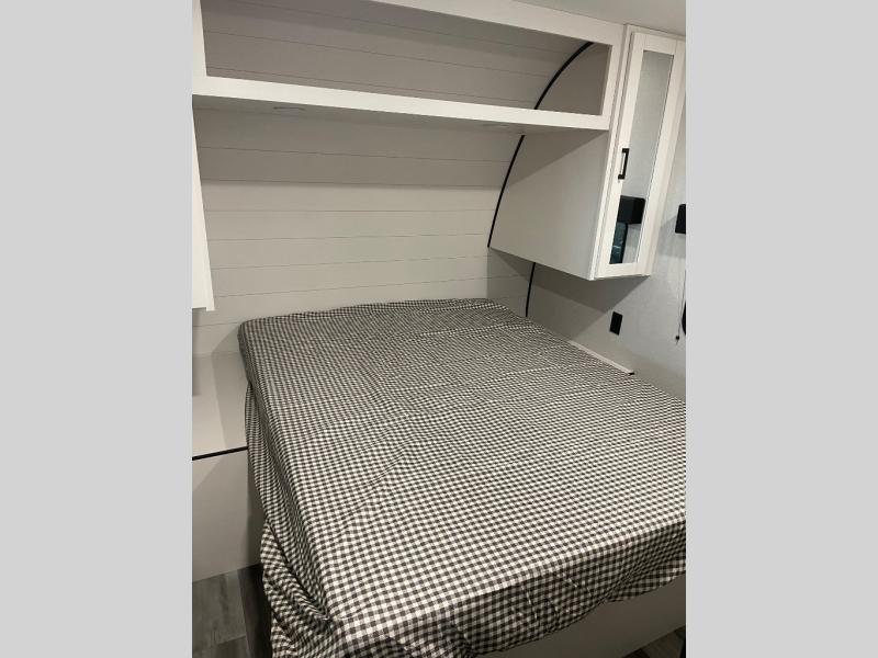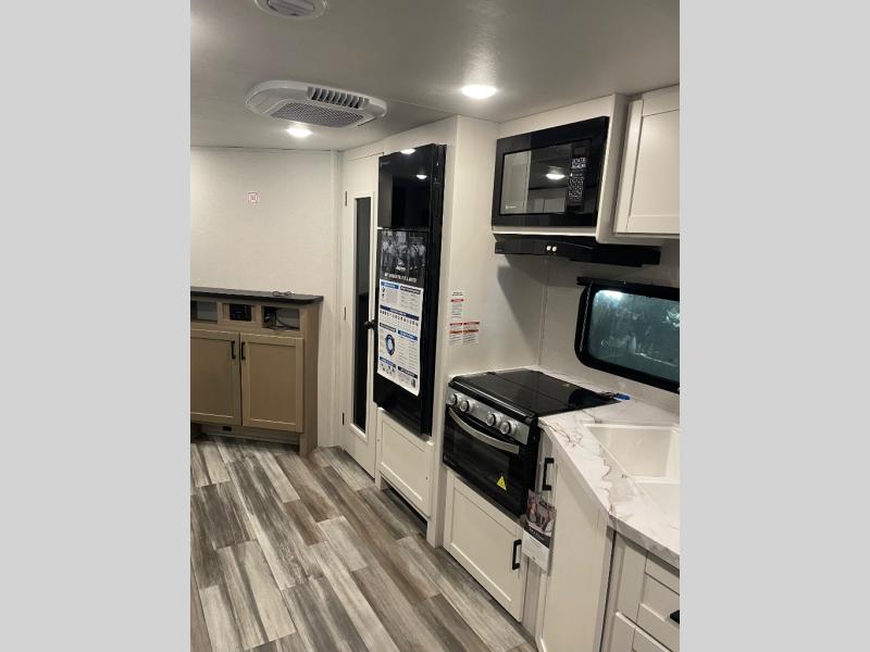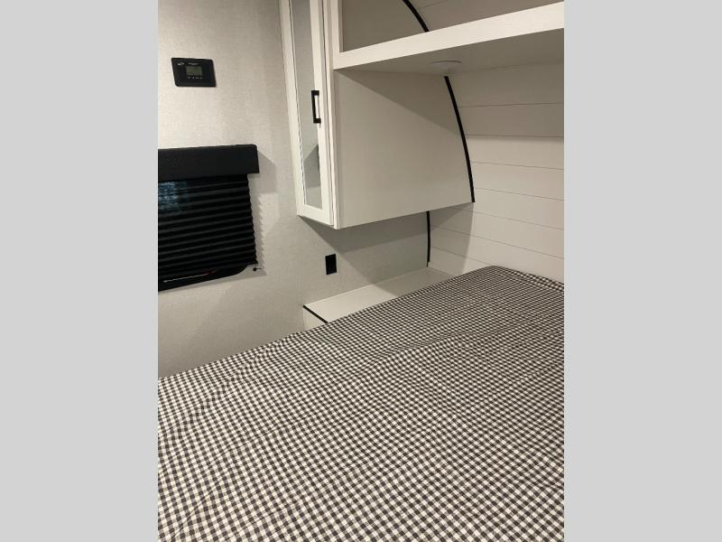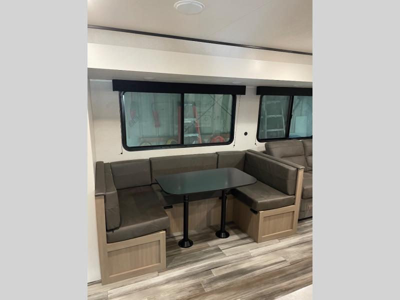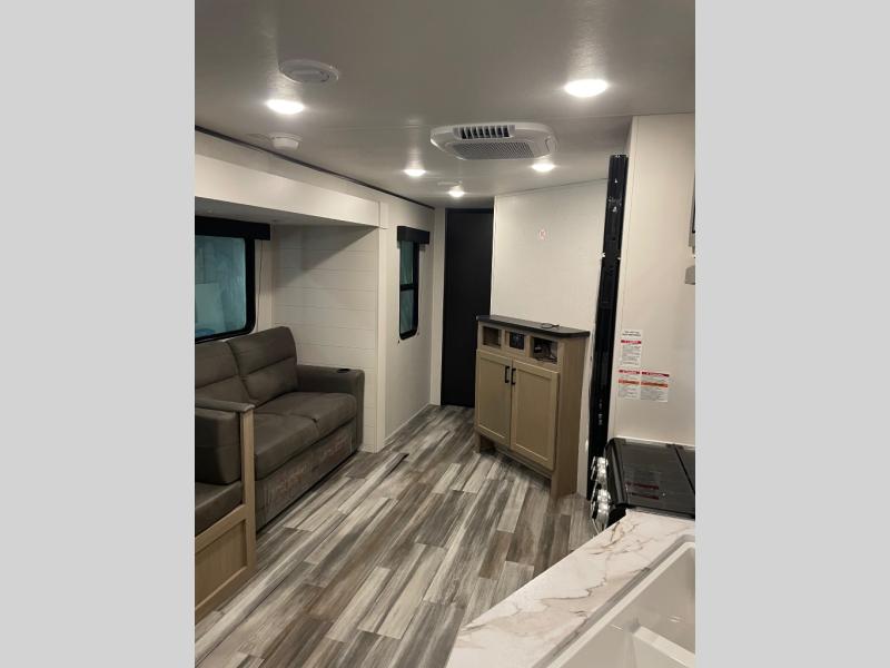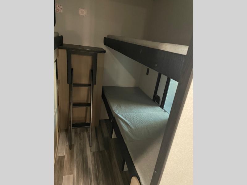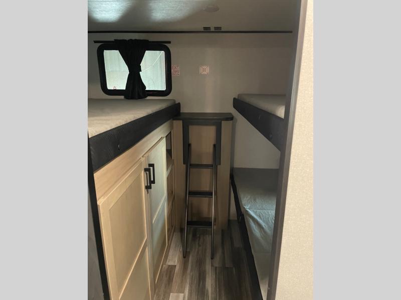 It's time to ditch that old tent and upgrade to this spacious travel trailer! There is a rear private bunkhouse includes a flip-up bunk over a 28" x 76" bunk, plus a bunk across the room and a wardrobe. You'll enjoy the front private bedroom all to yourselves with a queen bed and dual wardrobes, and the full bath is close by for easy nighttime use. A U-shaped dinette slide and sofa in the main living area provide your crew with space to relax and dine together, and the fully equipped kitchen lets you cook up your best meals. Outside, you'll find exterior storage, an 18' power awning, plus an outdoor refrigerator, shelf, and TV prep!