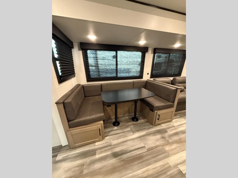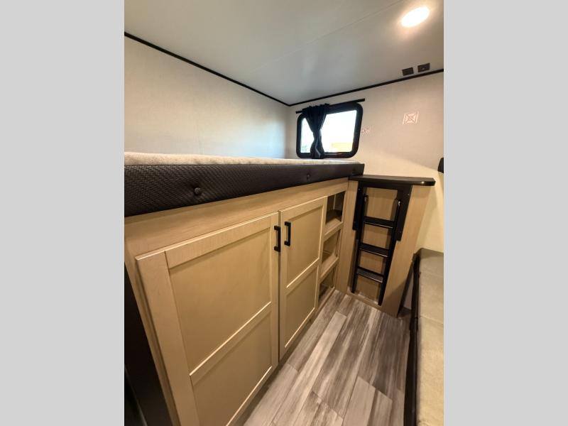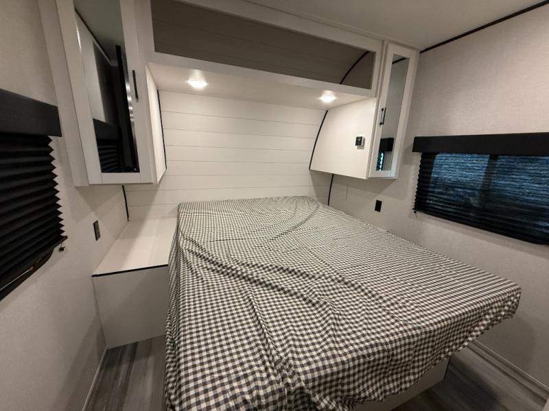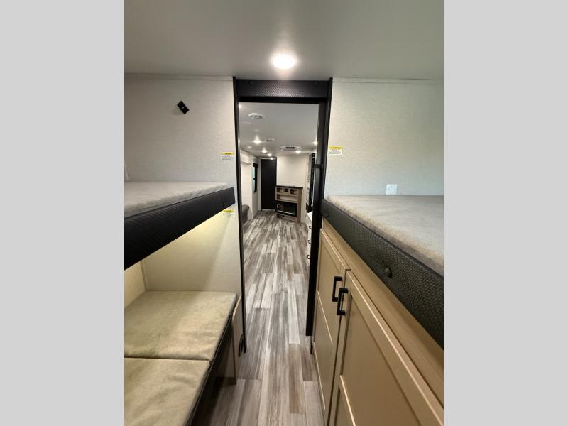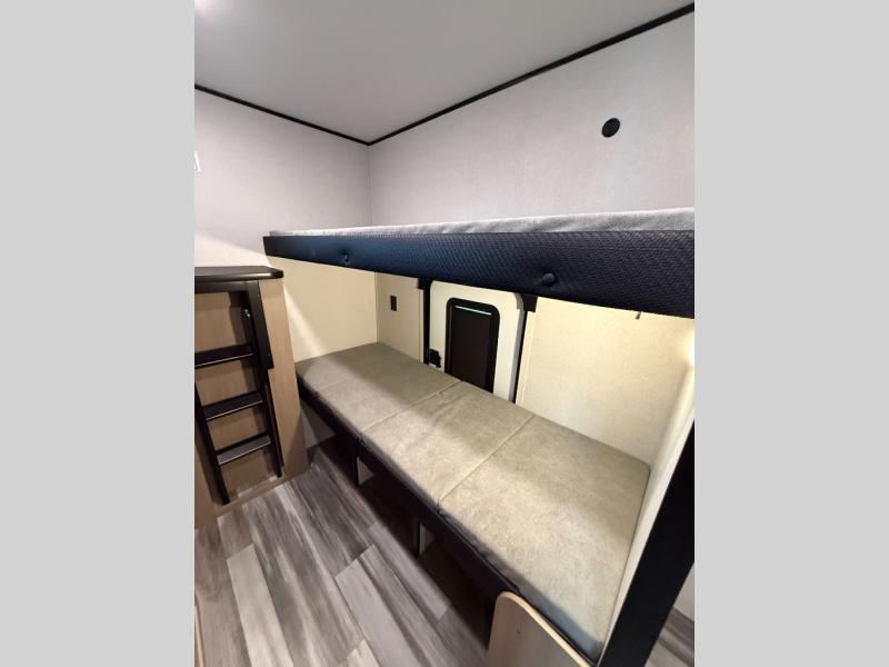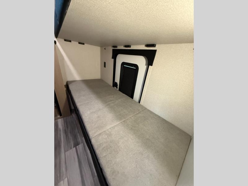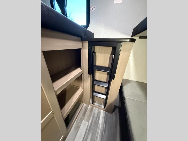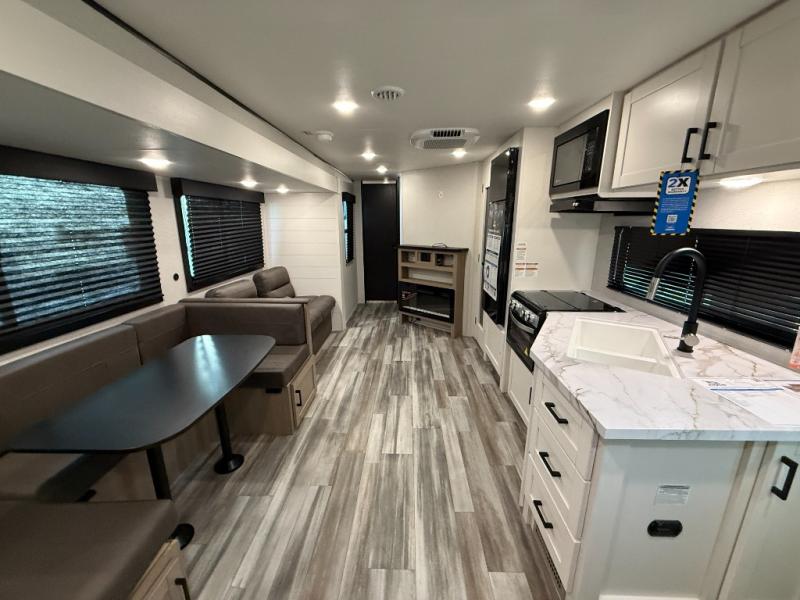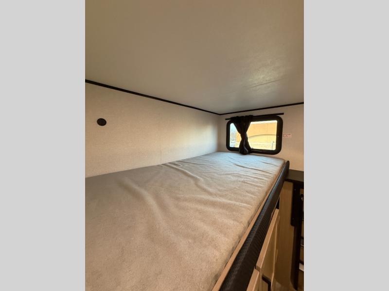 It's time to ditch that old tent and upgrade to this spacious travel trailer! There is a rear private bunkhouse includes a flip-up bunk over a 28" x 76" bunk, plus a bunk across the room and a wardrobe. You'll enjoy the front private bedroom all to yourselves with a queen bed and dual wardrobes, and the full bath is close by for easy nighttime use. A U-shaped dinette slide and sofa in the main living area provide your crew with space to relax and dine together, and the fully equipped kitchen lets you cook up your best meals. Outside, you'll find exterior storage, an 18' power awning, plus an outdoor refrigerator, shelf, and TV prep!