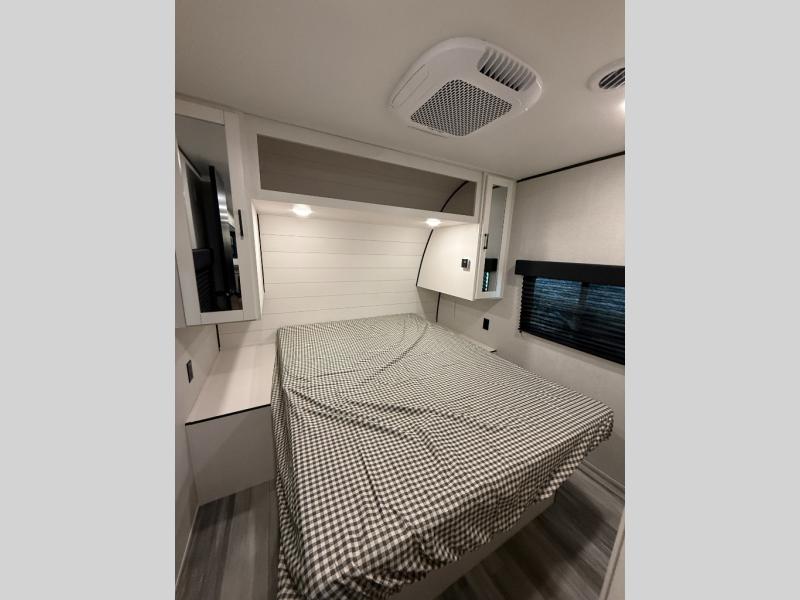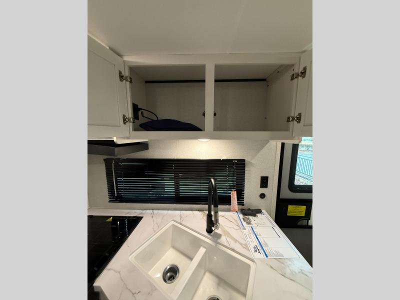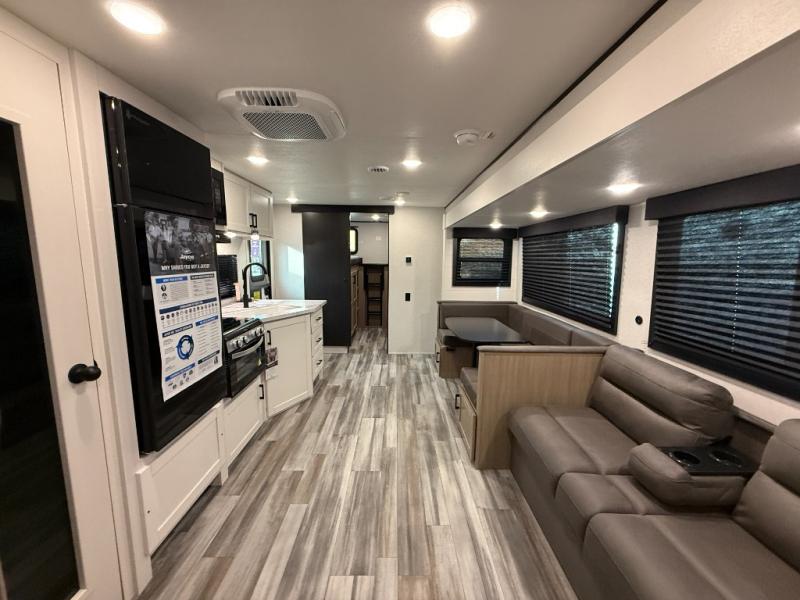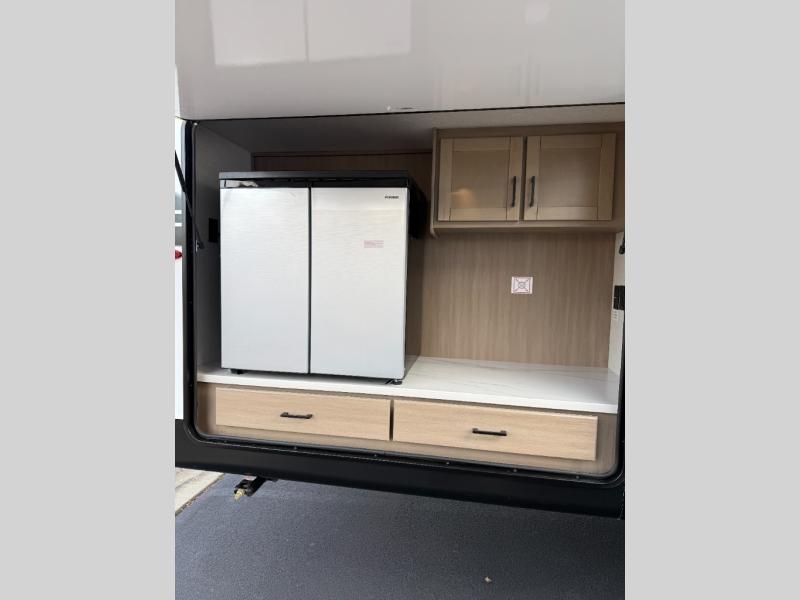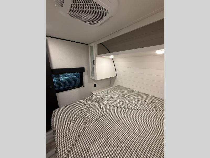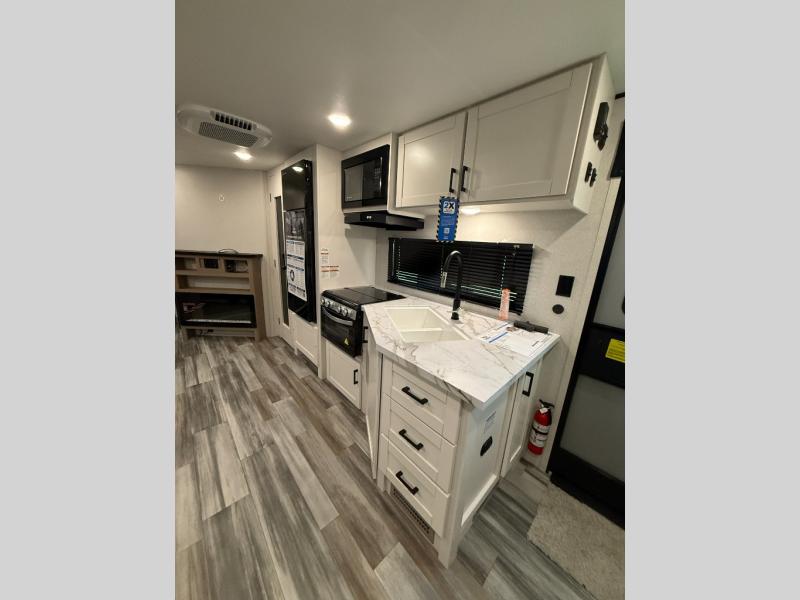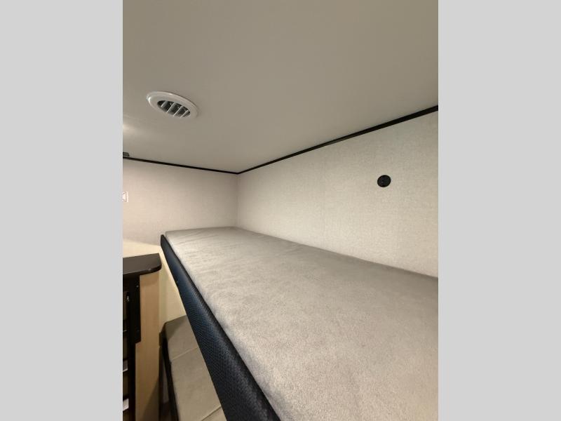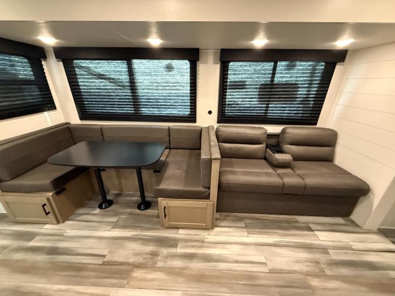 It's time to ditch that old tent and upgrade to this spacious travel trailer! There is a rear private bunkhouse includes a flip-up bunk over a 28" x 76" bunk, plus a bunk across the room and a wardrobe. You'll enjoy the front private bedroom all to yourselves with a queen bed and dual wardrobes, and the full bath is close by for easy nighttime use. A U-shaped dinette slide and sofa in the main living area provide your crew with space to relax and dine together, and the fully equipped kitchen lets you cook up your best meals. Outside, you'll find exterior storage, an 18' power awning, plus an outdoor refrigerator, shelf, and TV prep!