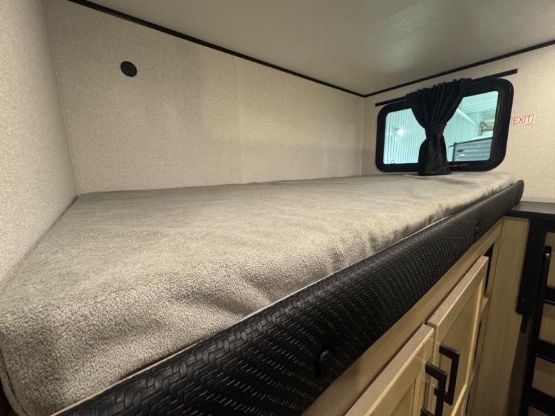 It's time to ditch that old tent and upgrade to this spacious travel trailer! There is a rear private bunkhouse includes a flip-up bunk over a 28" x 76" bunk, plus a bunk across the room and a wardrobe. You'll enjoy the front private bedroom all to yourselves with a queen bed and dual wardrobes, and the full bath is close by for easy nighttime use. A U-shaped dinette slide and sofa in the main living area provide your crew with space to relax and dine together, and the fully equipped kitchen lets you cook up your best meals. Outside, you'll find exterior storage, an 18' power awning, plus an outdoor refrigerator, shelf, and TV prep!