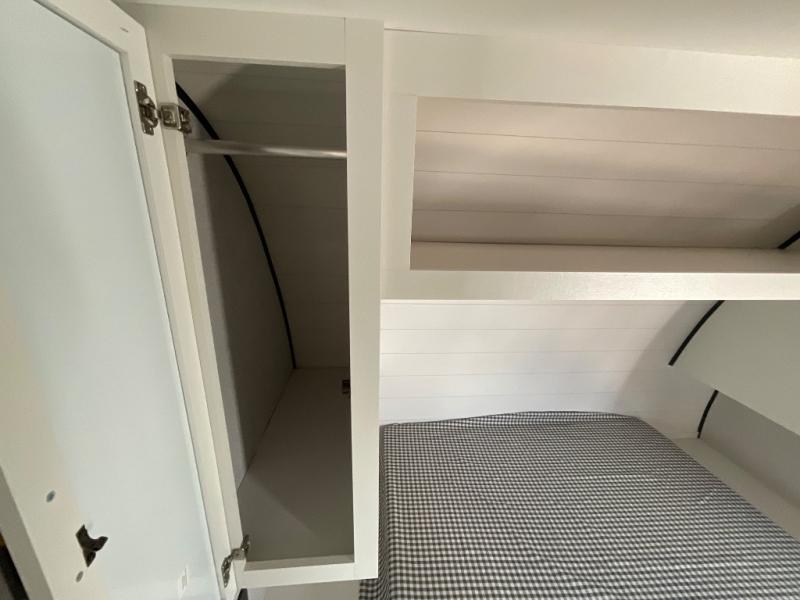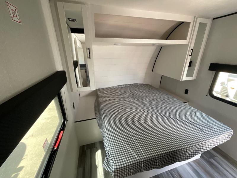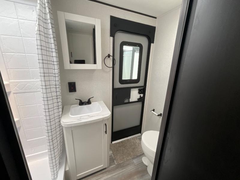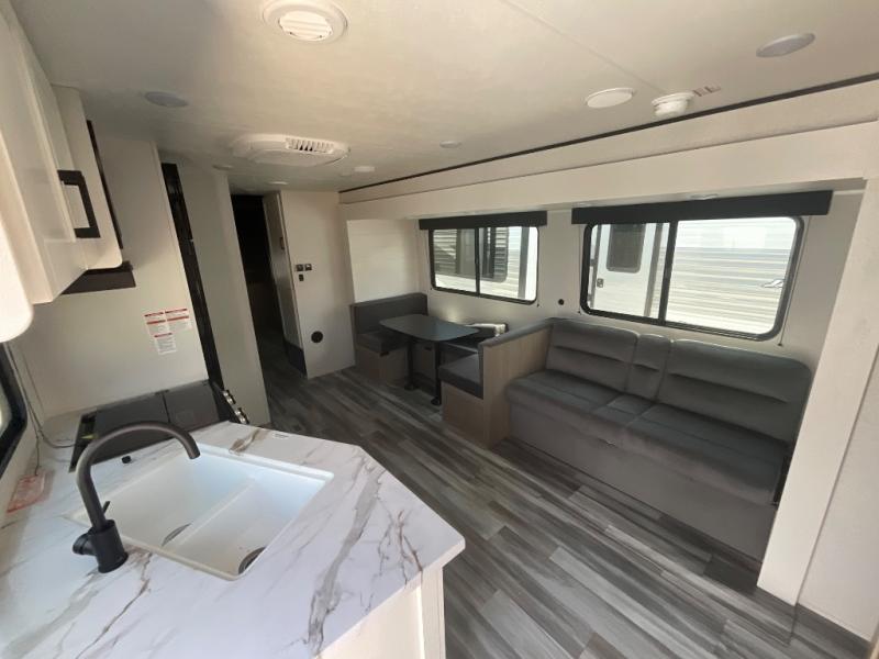 The whole gang can join along on camping trips in this double slide out travel trailer! There is a rear private bunkhouse with a bunk bed and J-cube futon sofa below plus two additional bunks across the room. You'll find your own space in the front private bedroom, which also includes an RV queen bed and dual wardrobes. The middle kitchen and living room will be a favorite place to come together since there is a jack-knife sofa and U-shaped dinette plus a fully-equipped kitchen to make meals each day. This model also includes a full bath with one of the dual entry doors for added convenience!