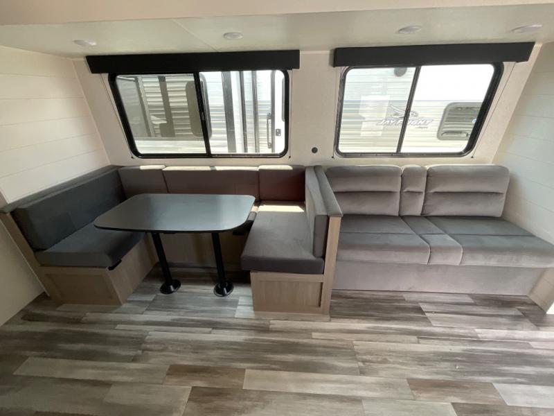 The Jayco Jay Flight SLX travel trailer is quite easy to own because it is lightweight for an easier towing experience. Built on a fully integrated A-frame with galvanized-steel, impact-resistant wheel wells, the Jay Flight SLX has quality at its very foundation. That quality continues on to the electric self-adjusting brakes, easy-lube hubs, Magnum Truss roof system, and LP quick connect. Some of what the mandatory Customer Value Package includes is backup camera prep, Keyed-Alike entry and baggage doors, and an on-demand tankless water heater.