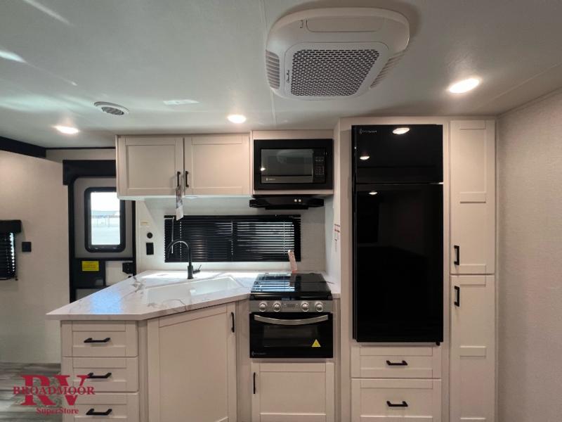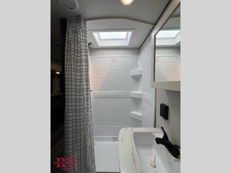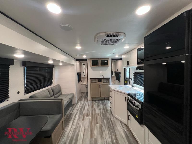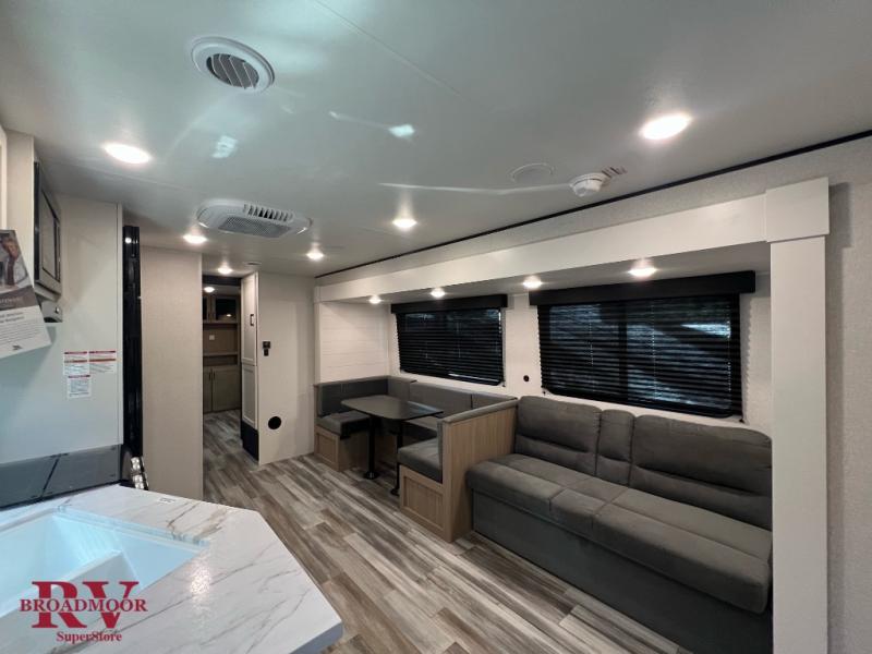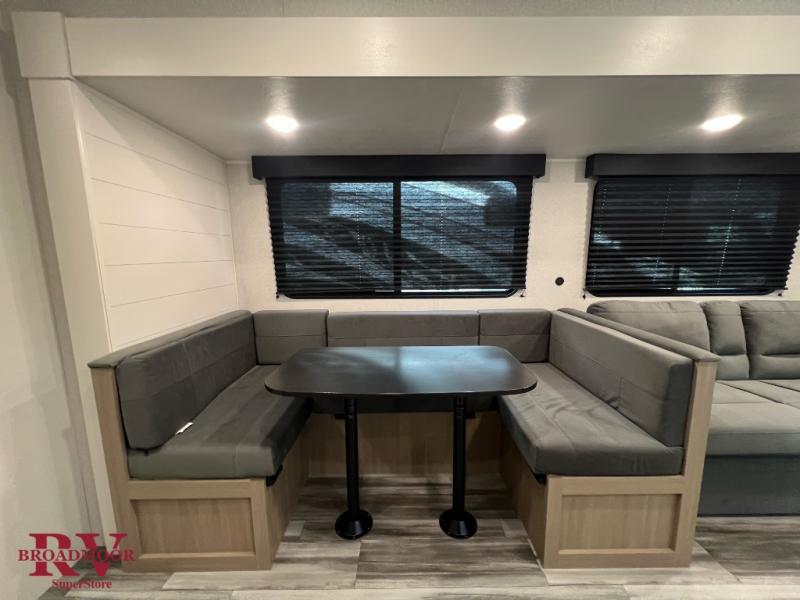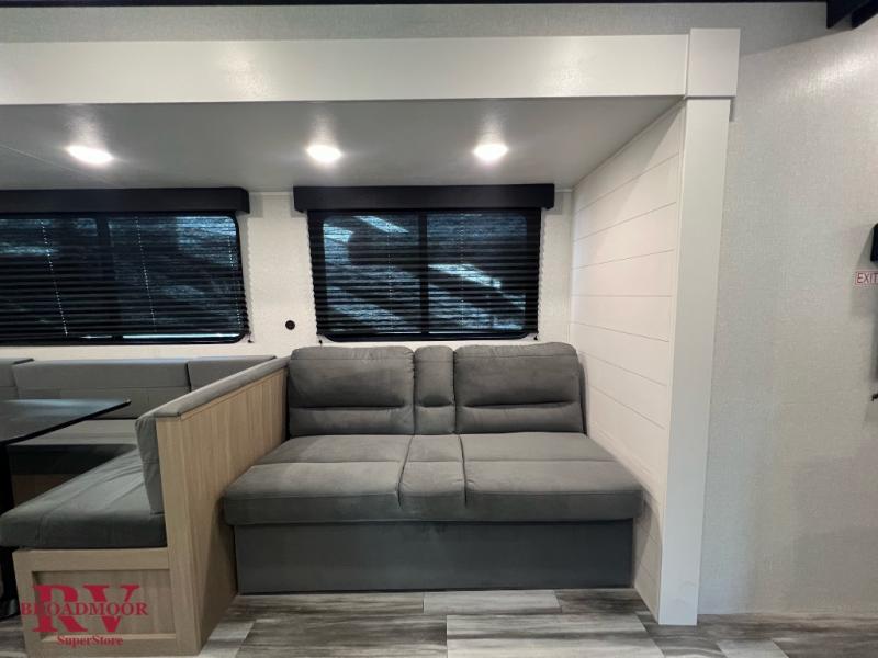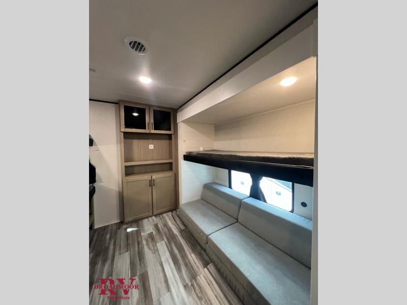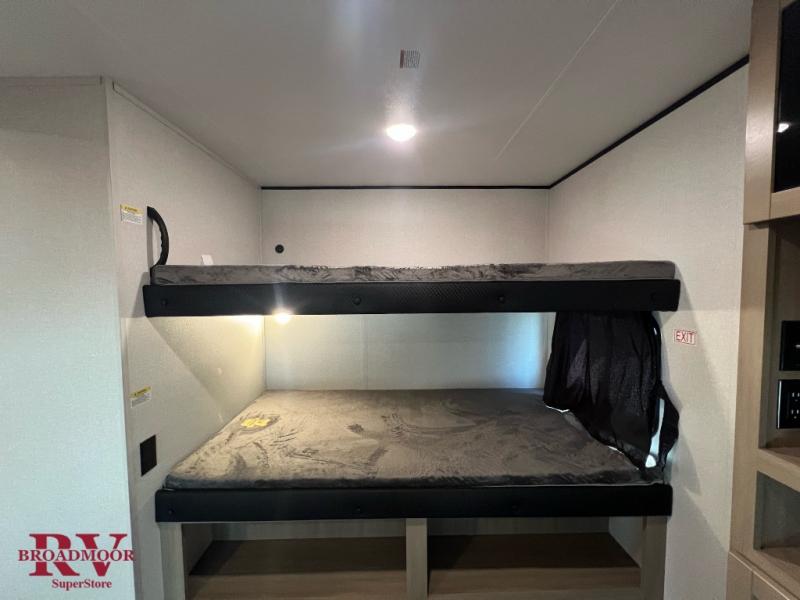 The whole gang can join along on camping trips in this double slide out travel trailer! There is a rear private bunkhouse with a bunk bed and J-cube futon sofa below plus two additional bunks across the room. You'll find your own space in the front private bedroom, which also includes an RV queen bed and dual wardrobes. The middle kitchen and living room will be a favorite place to come together since there is a jack-knife sofa and U-shaped dinette plus a fully-equipped kitchen to make meals each day. This model also includes a full bath with one of the dual entry doors for added convenience!
