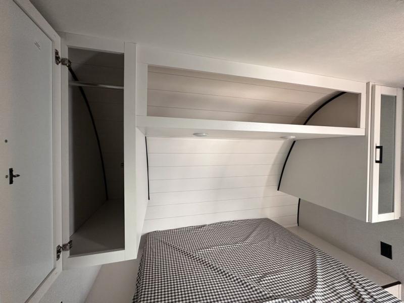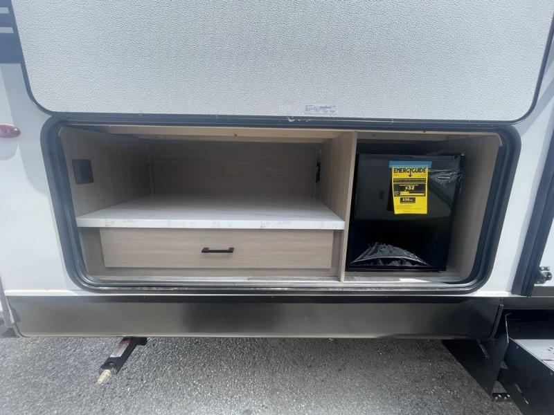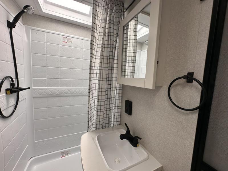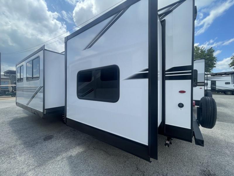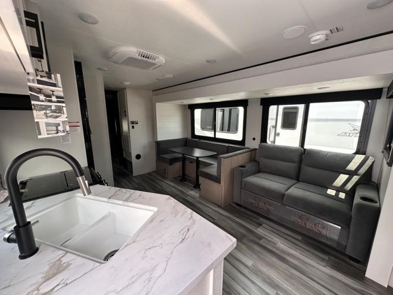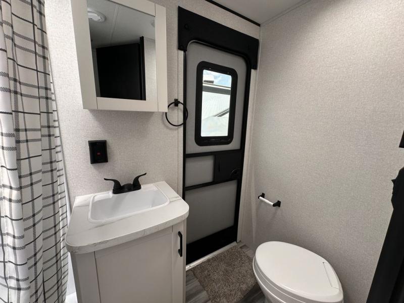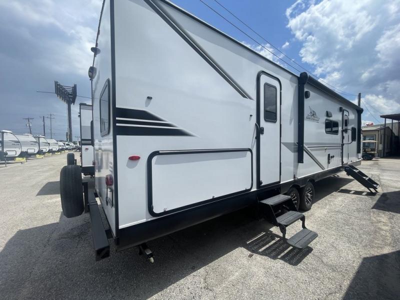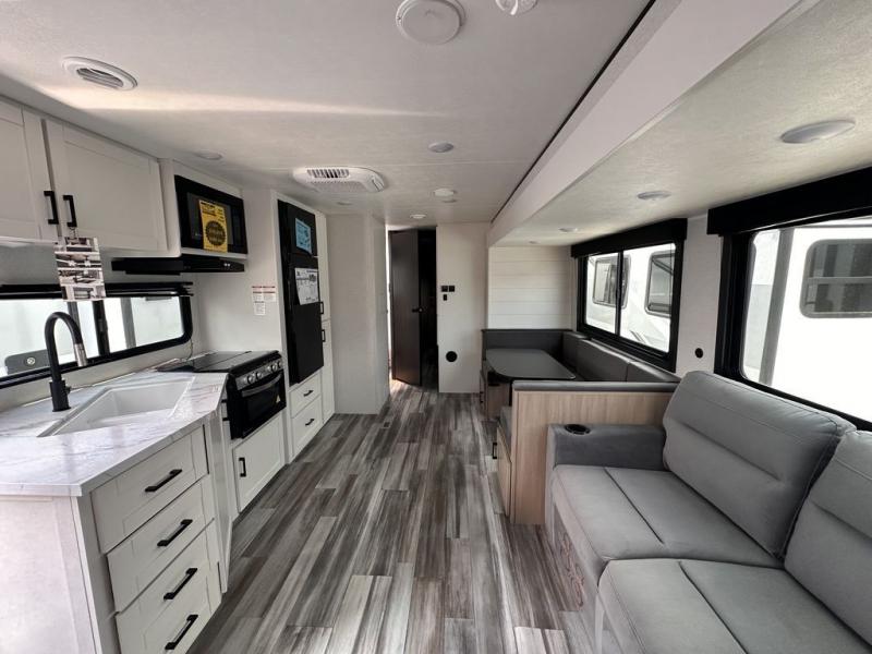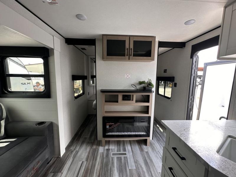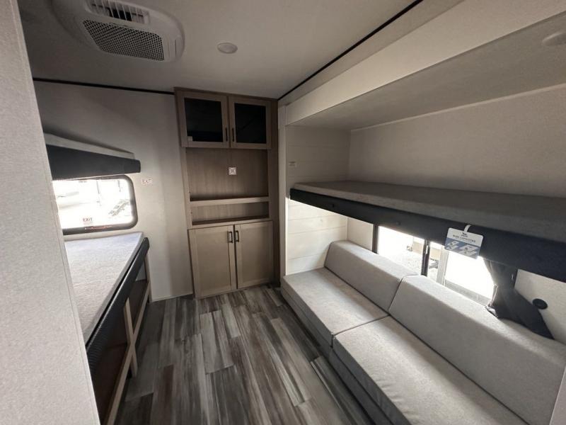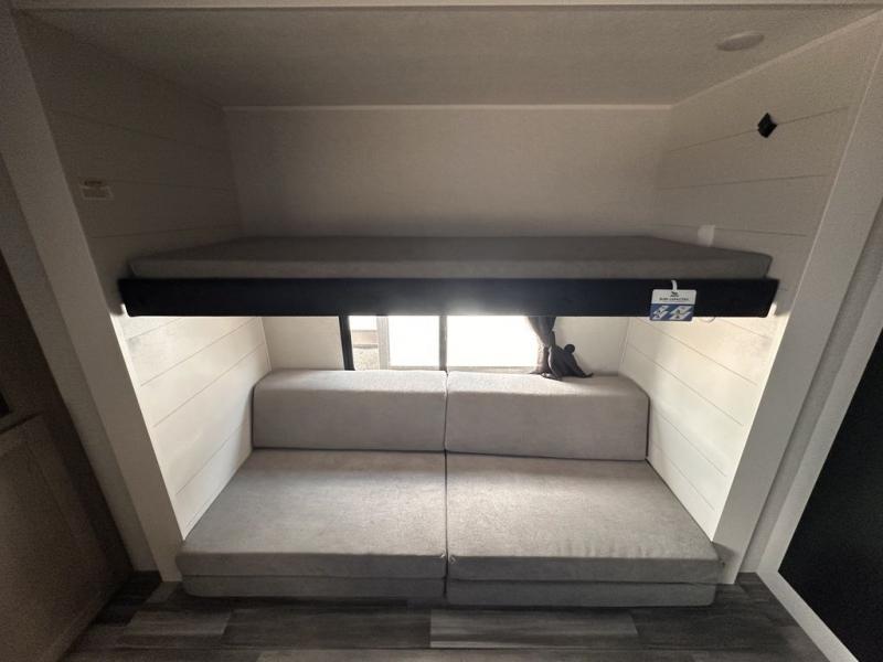 The whole gang can join along on camping trips in this double slide out travel trailer! There is a rear private bunkhouse with a bunk bed and J-cube futon sofa below plus two additional bunks across the room. You'll find your own space in the front private bedroom, which also includes an RV queen bed and dual wardrobes. The middle kitchen and living room will be a favorite place to come together since there is a jack-knife sofa and U-shaped dinette plus a fully-equipped kitchen to make meals each day. This model also includes a full bath with one of the dual entry doors for added convenience!