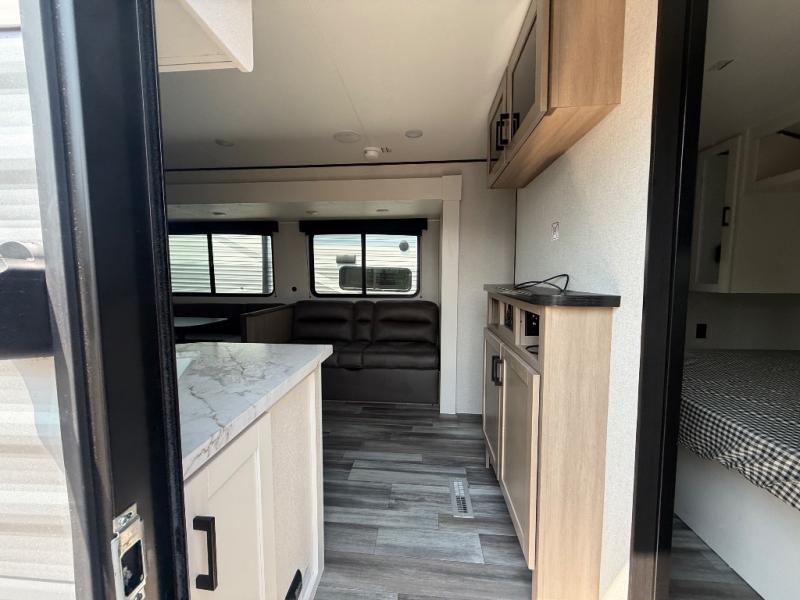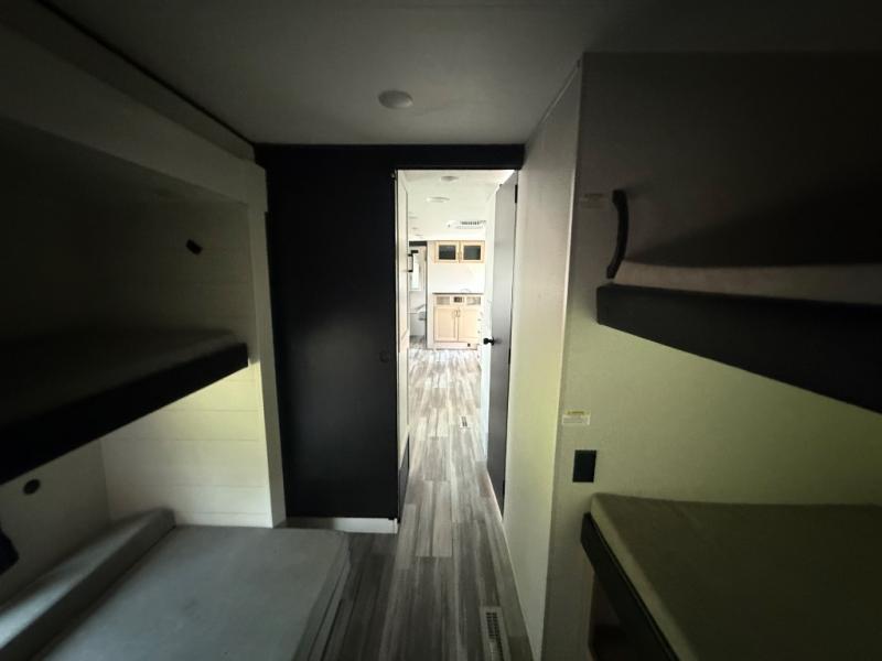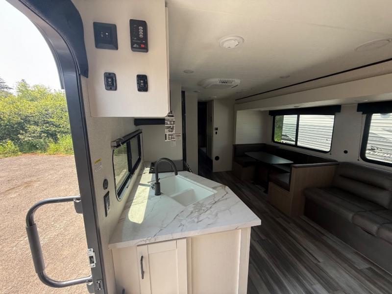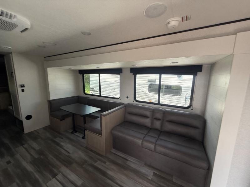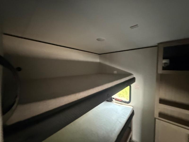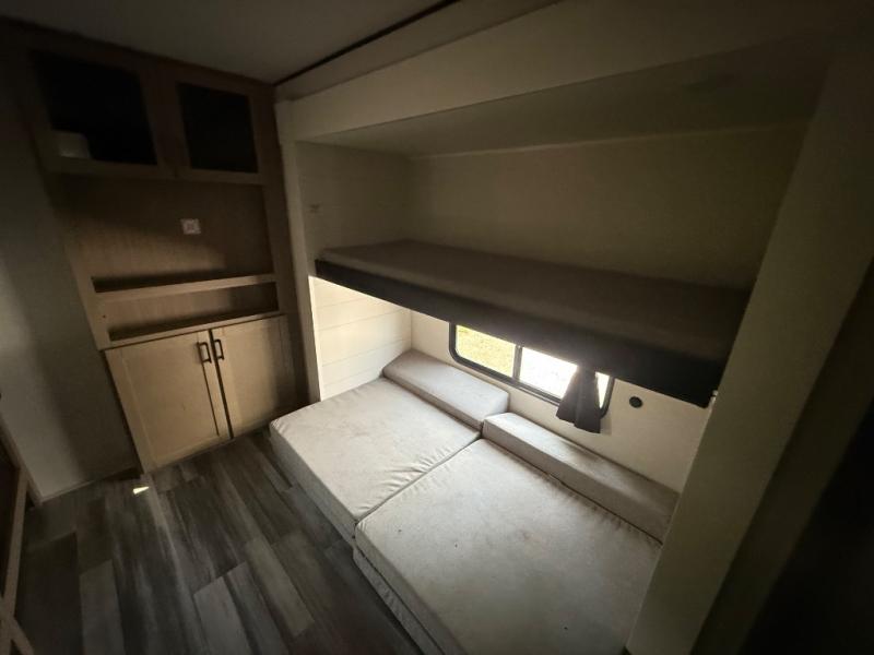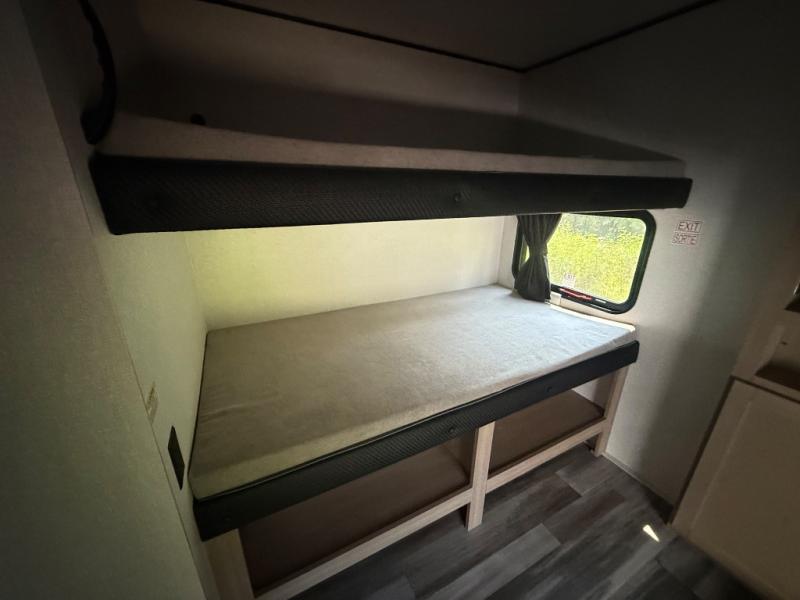 The whole gang can join along on camping trips in this double slide out travel trailer! There is a rear private bunkhouse with a bunk bed and J-cube futon sofa below plus two additional bunks across the room. You'll find your own space in the front private bedroom, which also includes an RV queen bed and dual wardrobes. The middle kitchen and living room will be a favorite place to come together since there is a jack-knife sofa and U-shaped dinette plus a fully-equipped kitchen to make meals each day. This model also includes a full bath with one of the dual entry doors for added convenience!