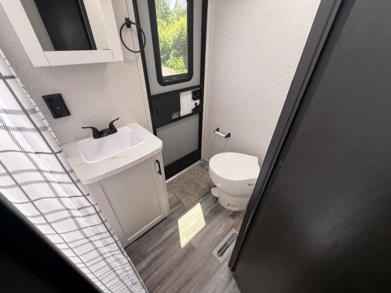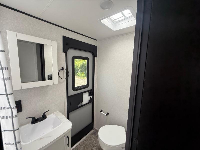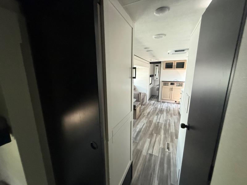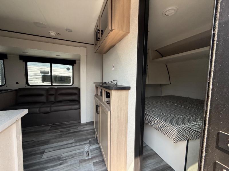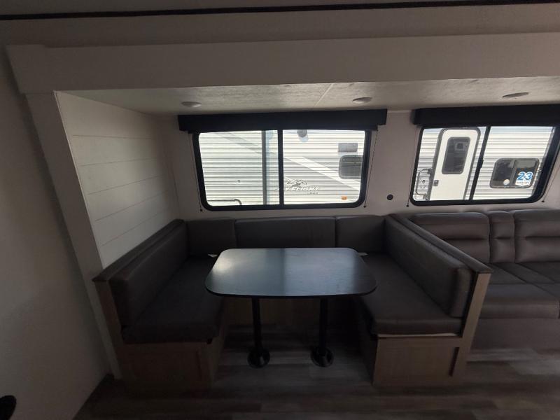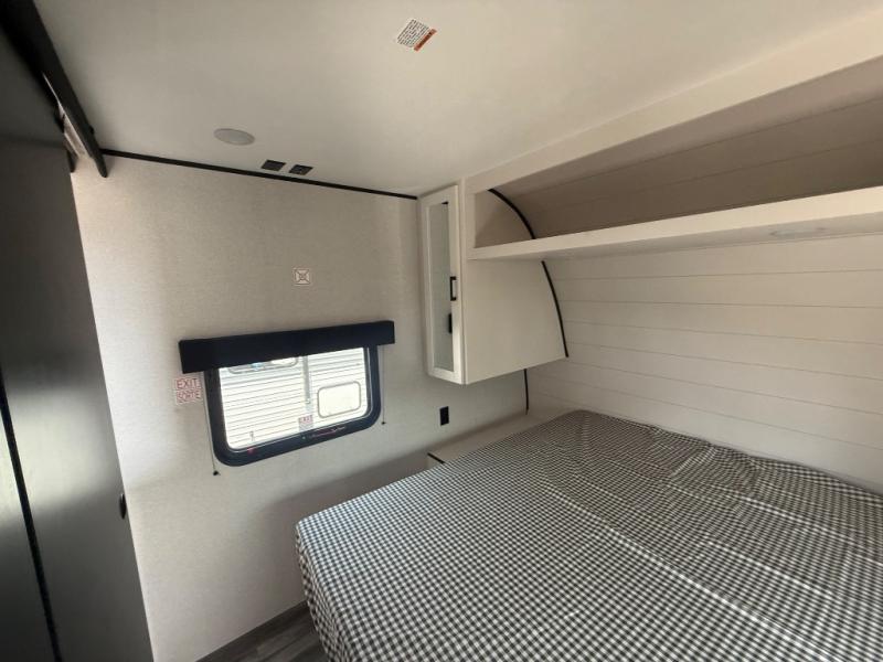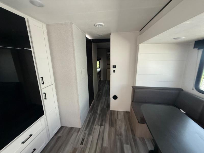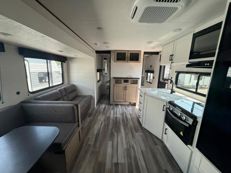 The whole gang can join along on camping trips in this double slide out travel trailer! There is a rear private bunkhouse with a bunk bed and J-cube futon sofa below plus two additional bunks across the room. You'll find your own space in the front private bedroom, which also includes an RV queen bed and dual wardrobes. The middle kitchen and living room will be a favorite place to come together since there is a jack-knife sofa and U-shaped dinette plus a fully-equipped kitchen to make meals each day. This model also includes a full bath with one of the dual entry doors for added convenience!