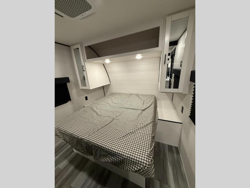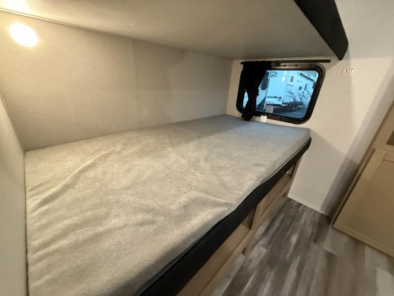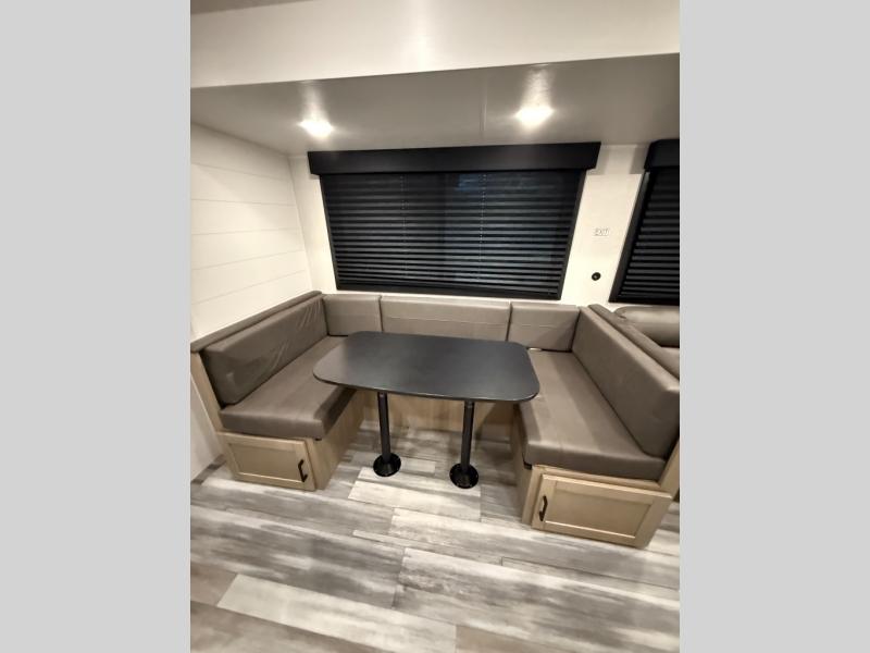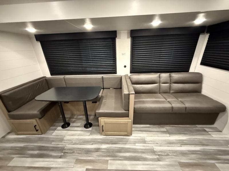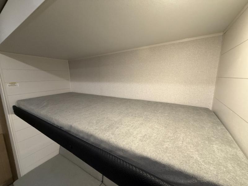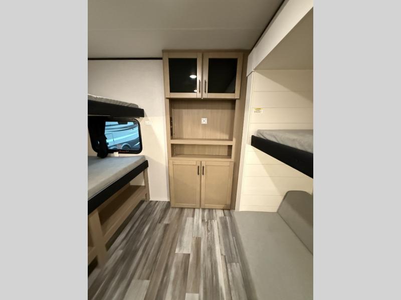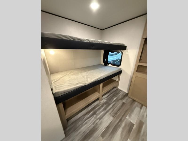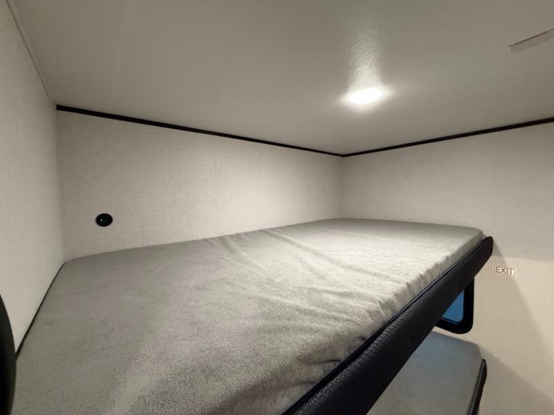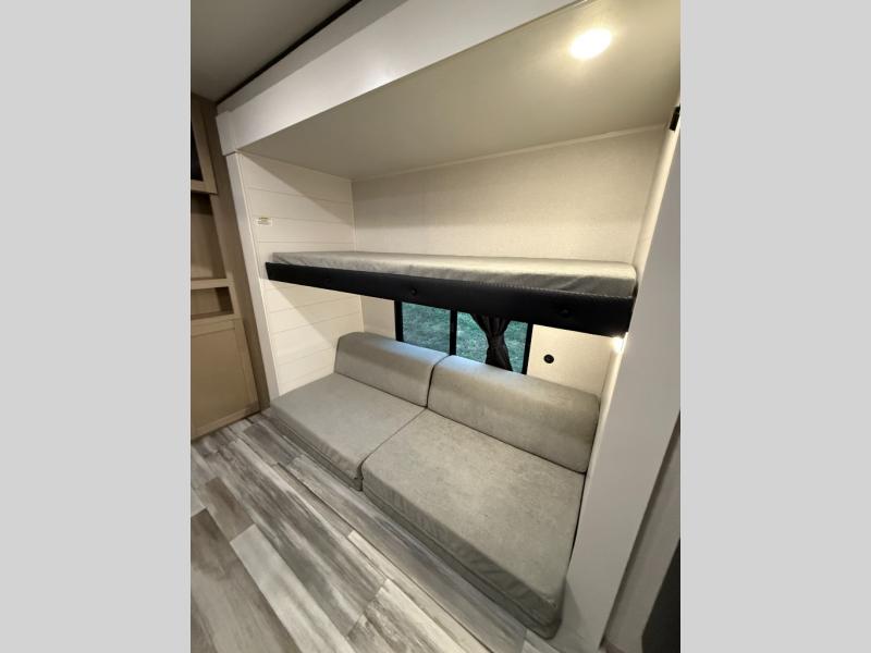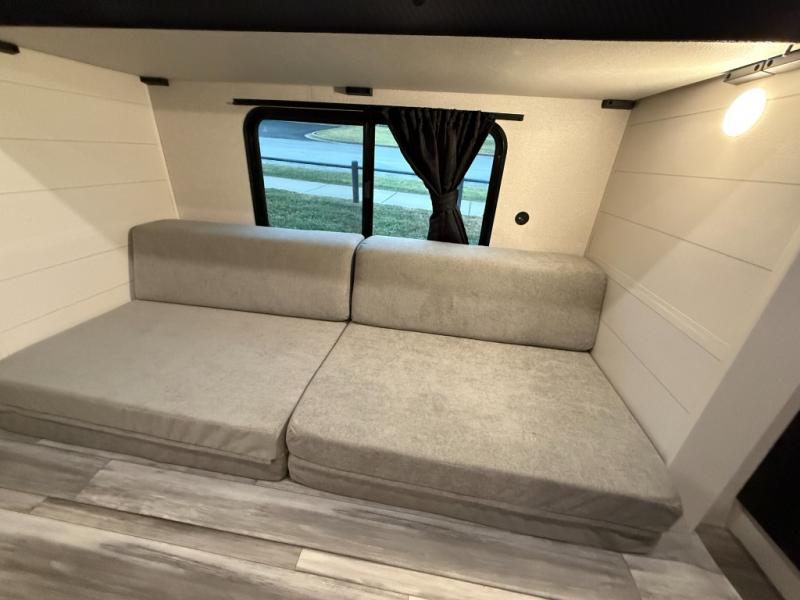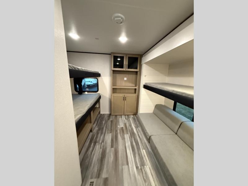 The whole gang can join along on camping trips in this double slide out travel trailer! There is a rear private bunkhouse with a bunk bed and J-cube futon sofa below plus two additional bunks across the room. You'll find your own space in the front private bedroom, which also includes an RV queen bed and dual wardrobes. The middle kitchen and living room will be a favorite place to come together since there is a jack-knife sofa and U-shaped dinette plus a fully-equipped kitchen to make meals each day. This model also includes a full bath with one of the dual entry doors for added convenience!