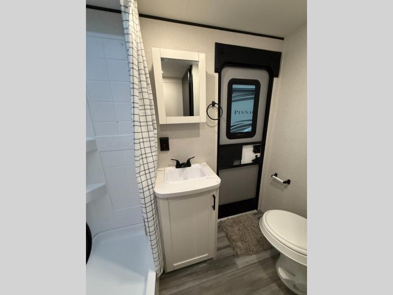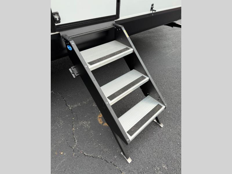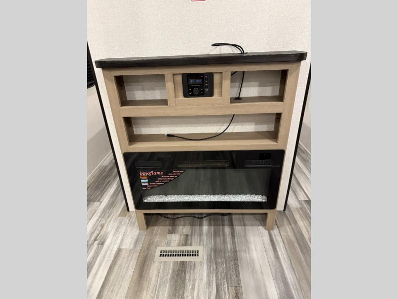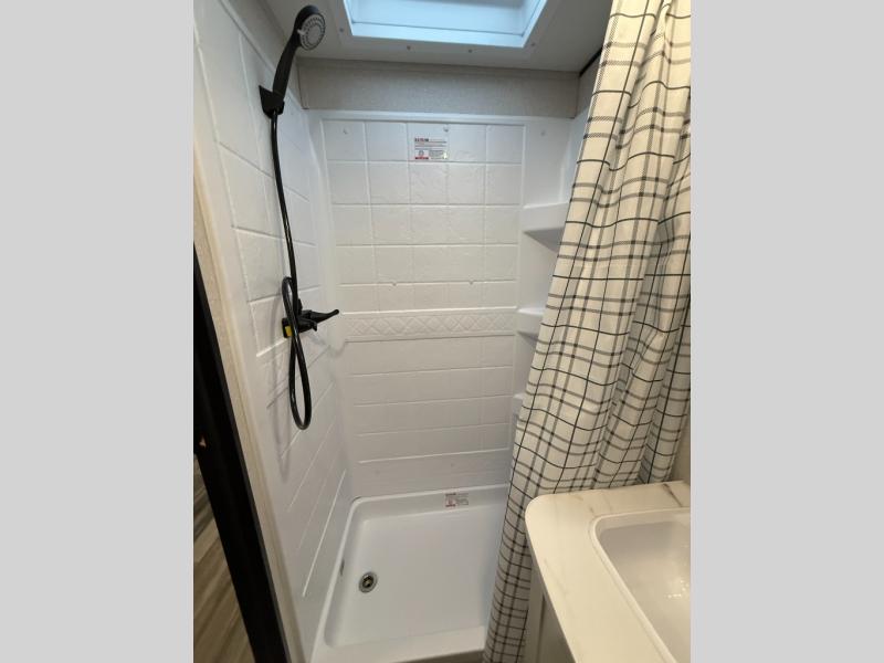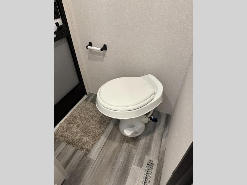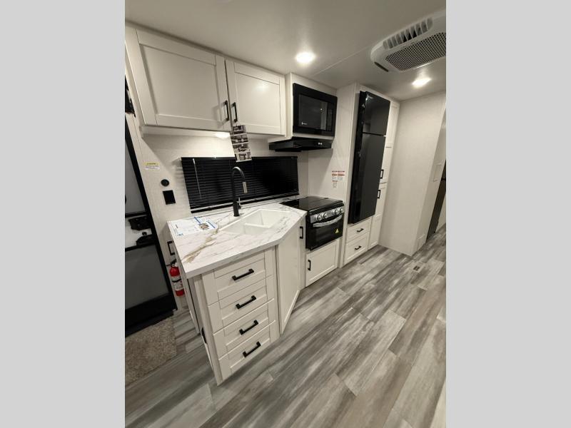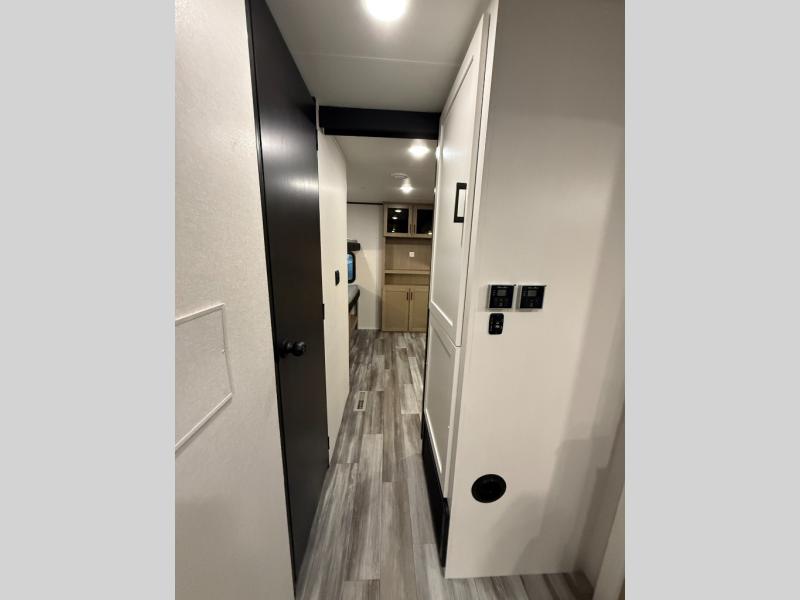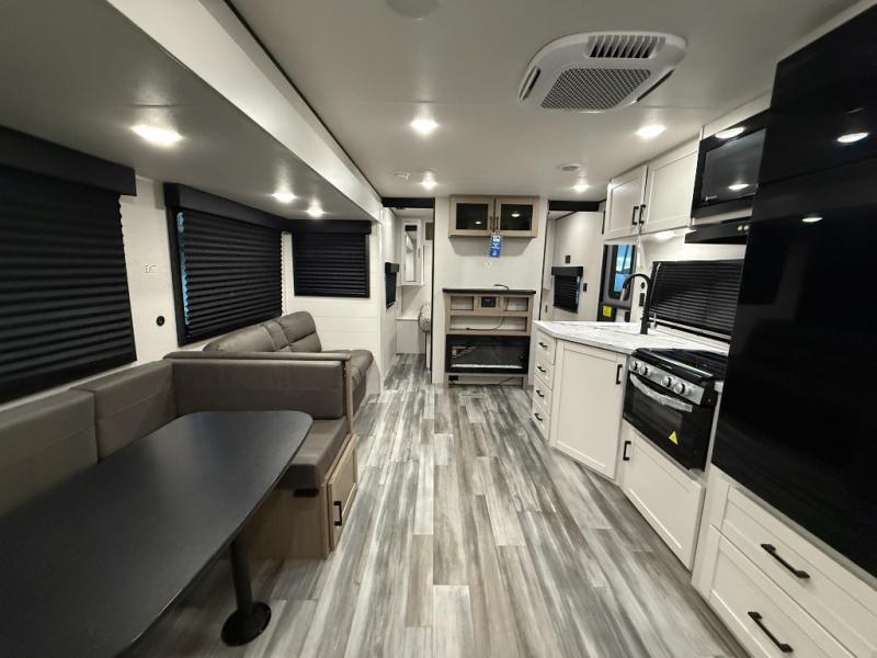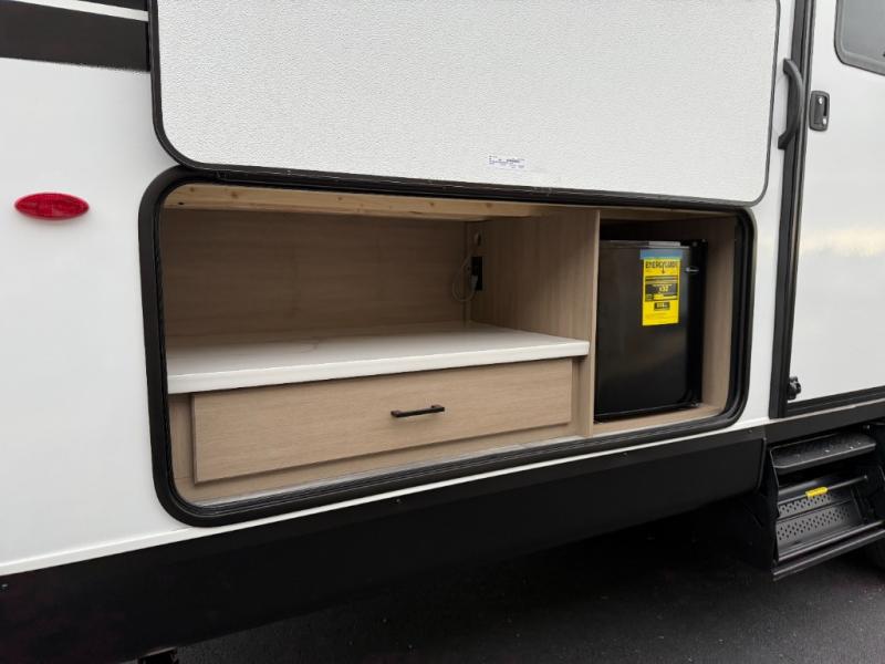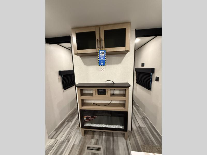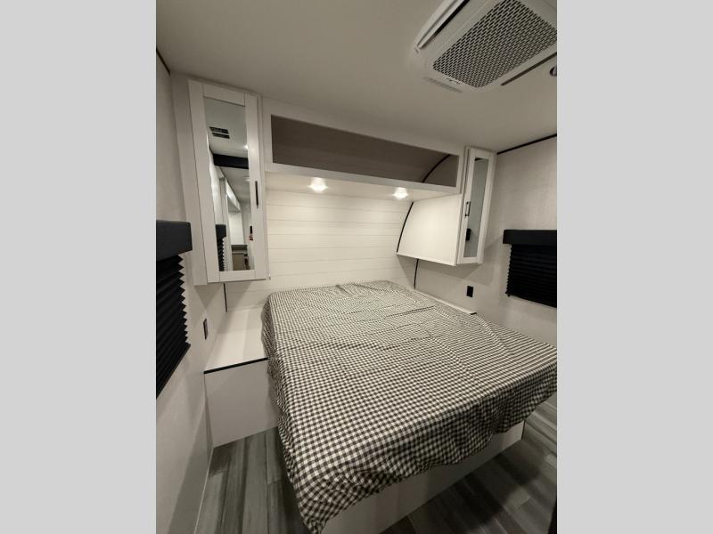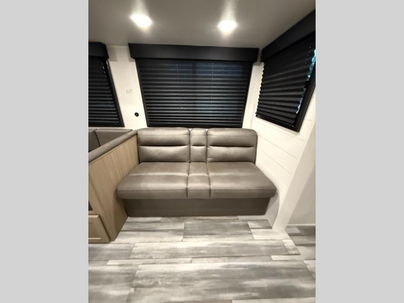 The whole gang can join along on camping trips in this double slide out travel trailer! There is a rear private bunkhouse with a bunk bed and J-cube futon sofa below plus two additional bunks across the room. You'll find your own space in the front private bedroom, which also includes an RV queen bed and dual wardrobes. The middle kitchen and living room will be a favorite place to come together since there is a jack-knife sofa and U-shaped dinette plus a fully-equipped kitchen to make meals each day. This model also includes a full bath with one of the dual entry doors for added convenience!