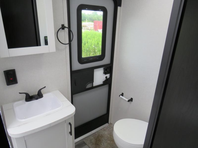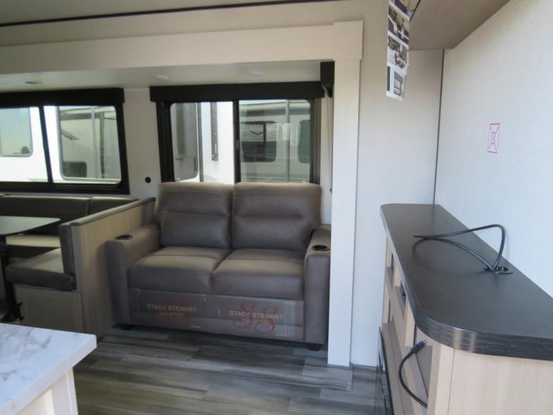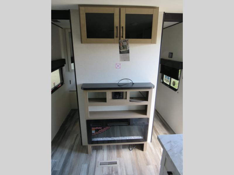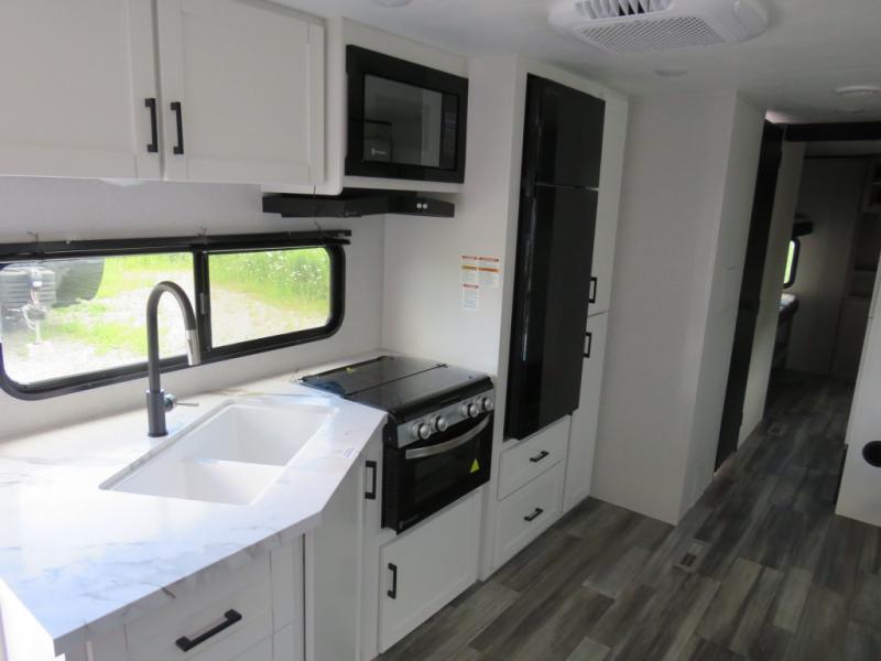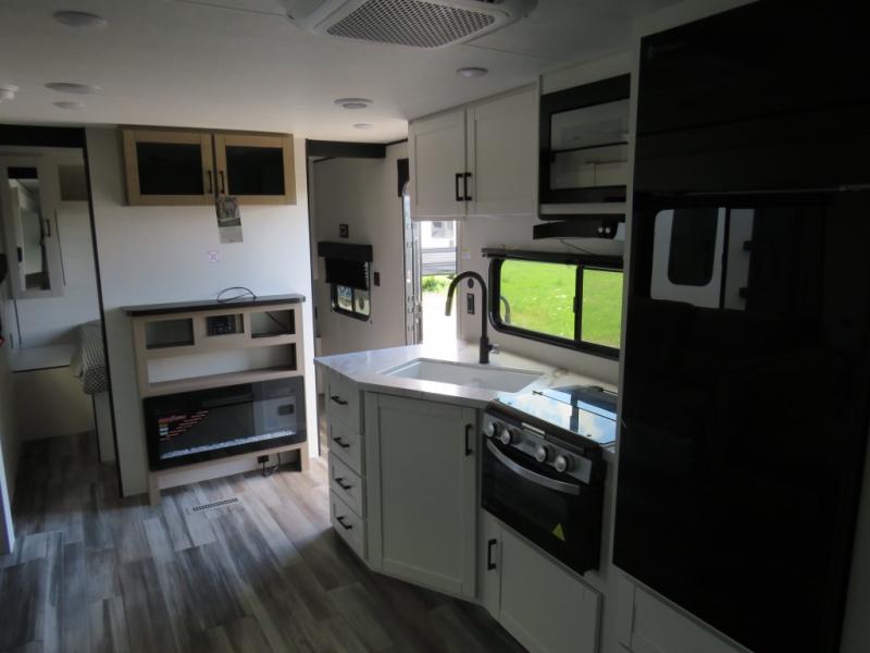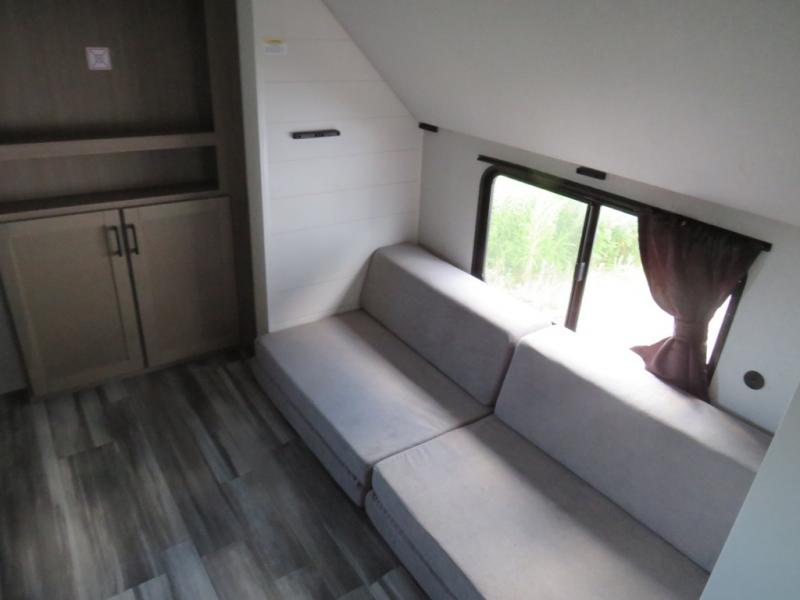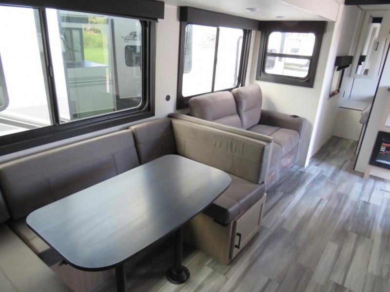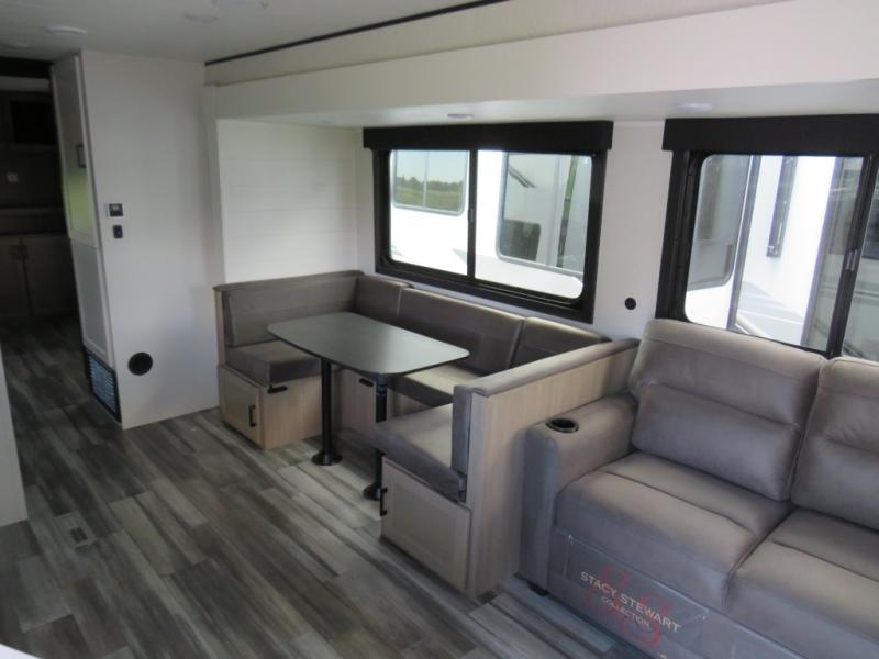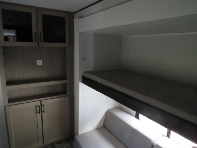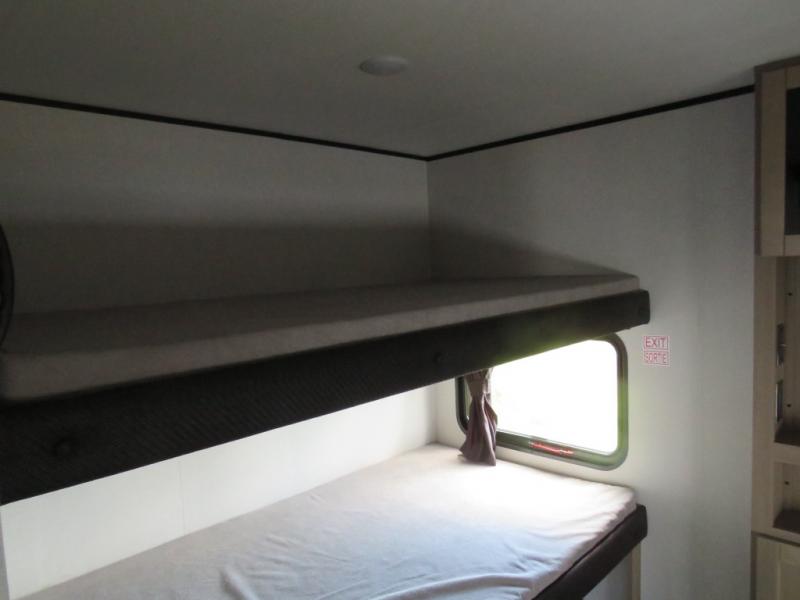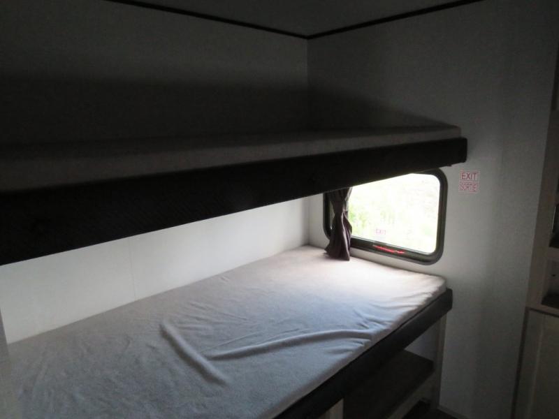 The whole gang can join along on camping trips in this double slide out travel trailer! There is a rear private bunkhouse with a bunk bed and J-cube futon sofa below plus two additional bunks across the room. You'll find your own space in the front private bedroom, which also includes an RV queen bed and dual wardrobes. The middle kitchen and living room will be a favorite place to come together since there is a jack-knife sofa and U-shaped dinette plus a fully-equipped kitchen to make meals each day. This model also includes a full bath with one of the dual entry doors for added convenience!