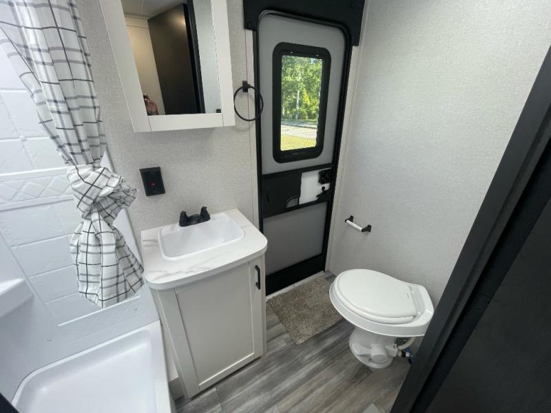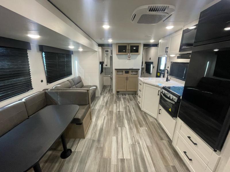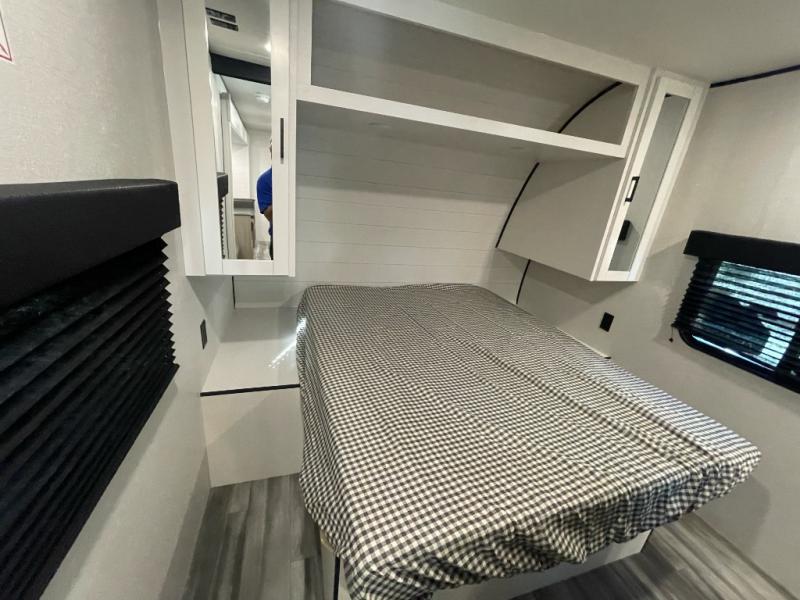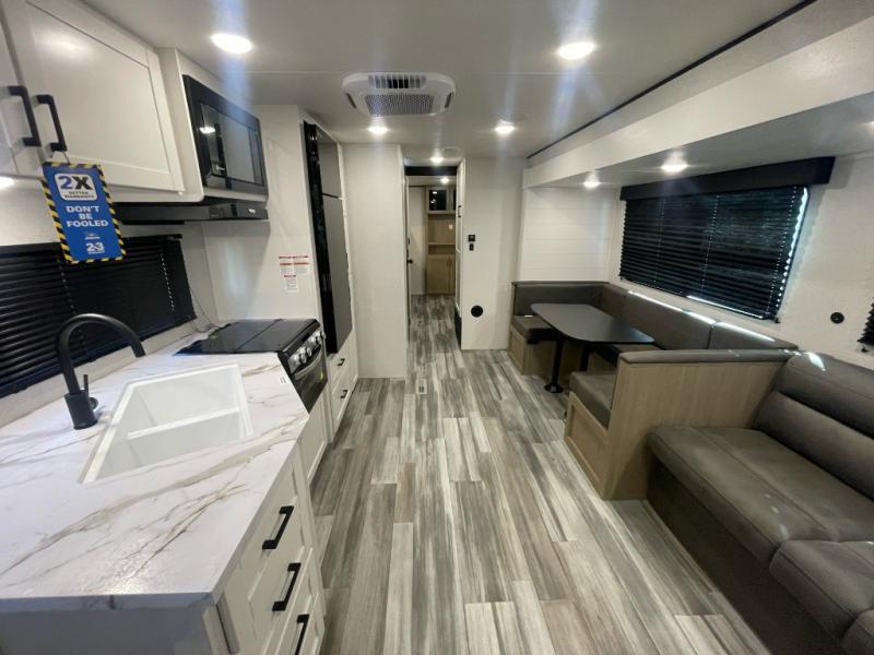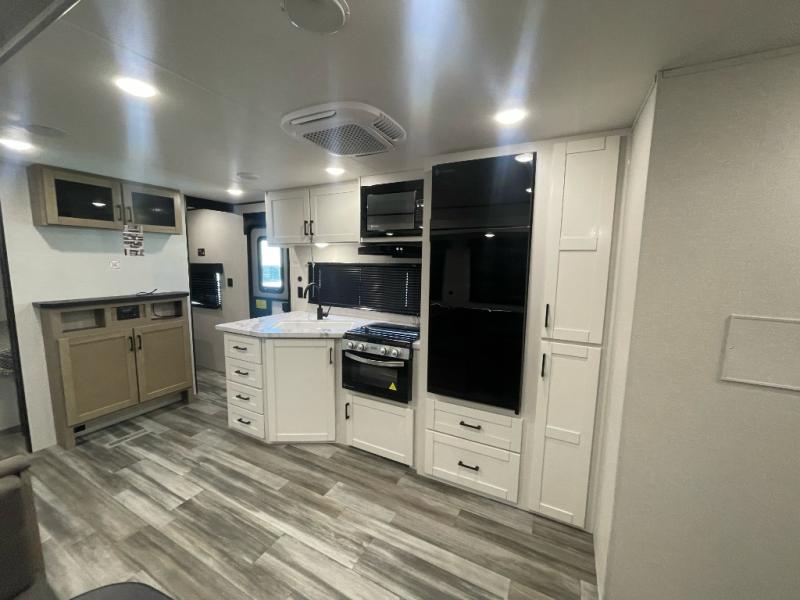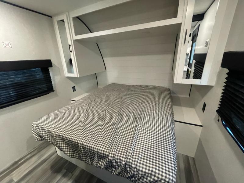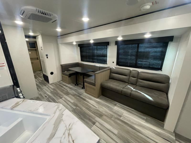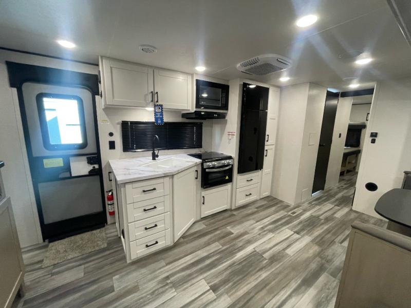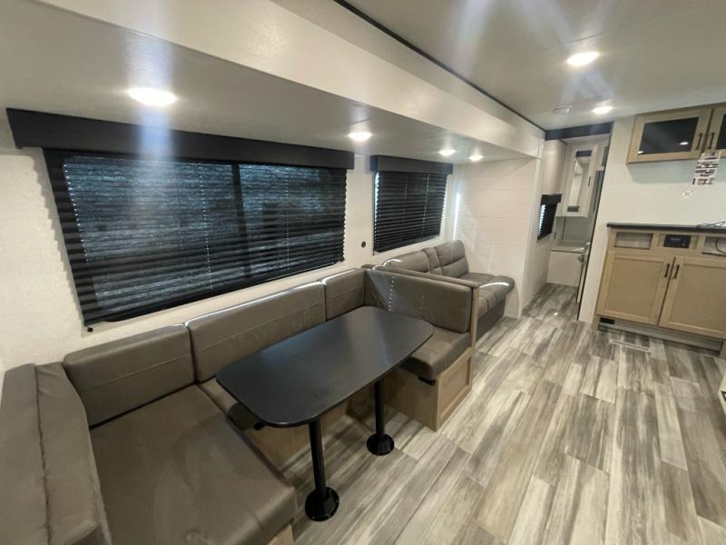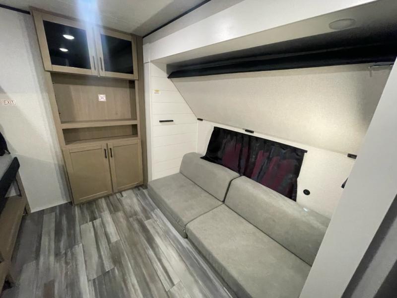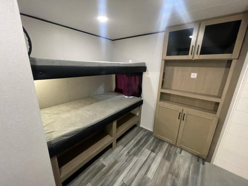 The whole gang can join along on camping trips in this double slide out travel trailer! There is a rear private bunkhouse with a bunk bed and J-cube futon sofa below plus two additional bunks across the room. You'll find your own space in the front private bedroom, which also includes an RV queen bed and dual wardrobes. The middle kitchen and living room will be a favorite place to come together since there is a jack-knife sofa and U-shaped dinette plus a fully-equipped kitchen to make meals each day. This model also includes a full bath with one of the dual entry doors for added convenience!