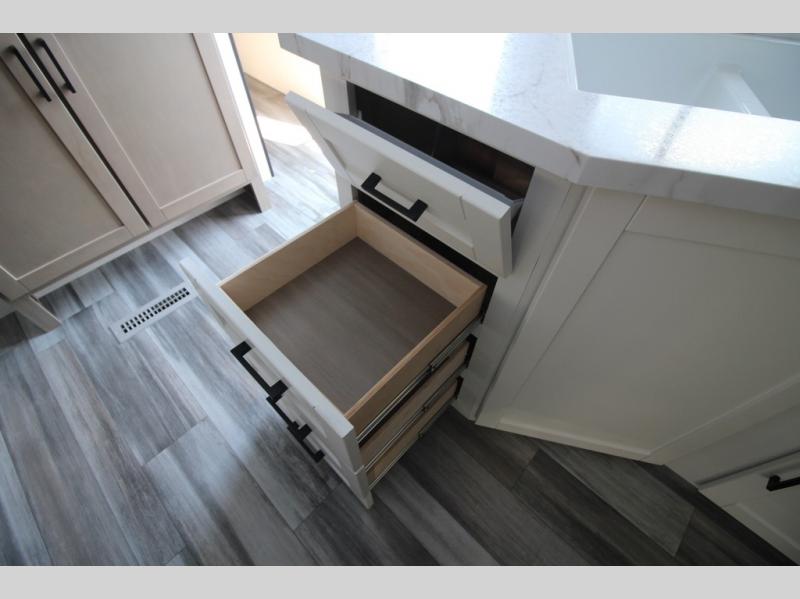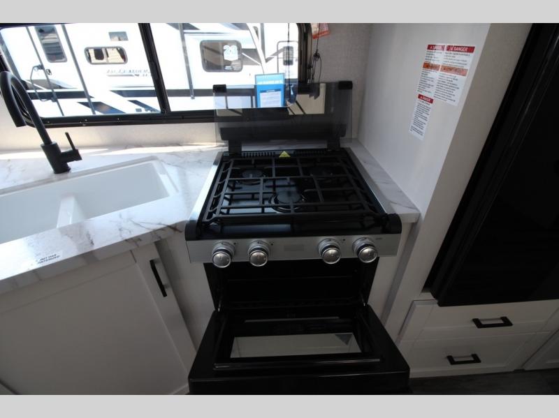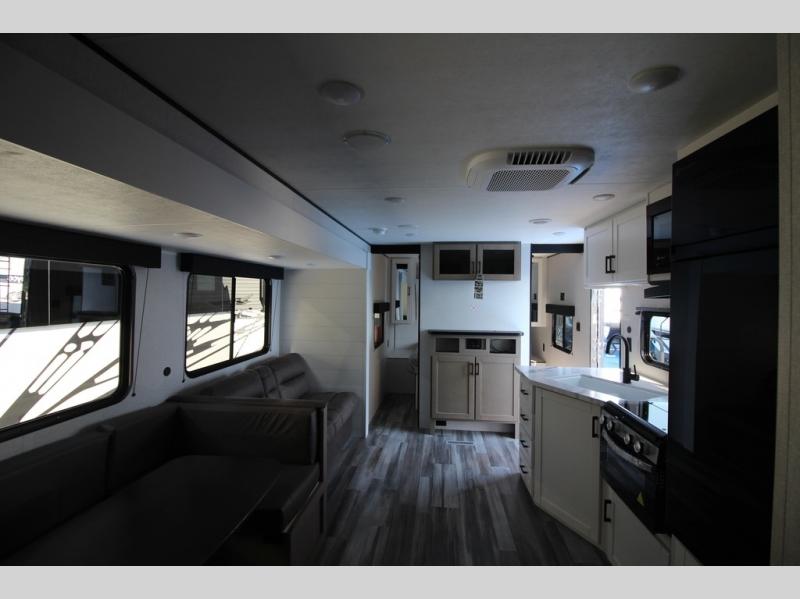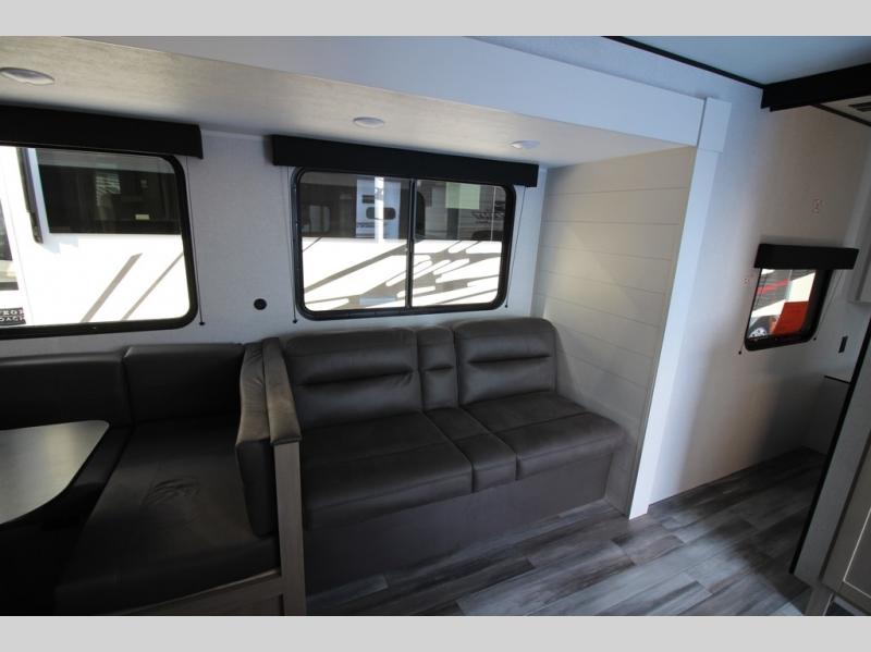 The whole gang can join along on camping trips in this double slide out travel trailer! There is a rear private bunkhouse with a bunk bed and J-cube futon sofa below plus two additional bunks across the room. You'll find your own space in the front private bedroom, which also includes an RV queen bed and dual wardrobes. The middle kitchen and living room will be a favorite place to come together since there is a jack-knife sofa and U-shaped dinette plus a fully-equipped kitchen to make meals each day. This model also includes a full bath with one of the dual entry doors for added convenience!