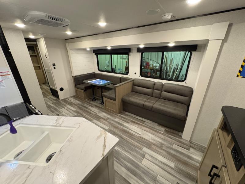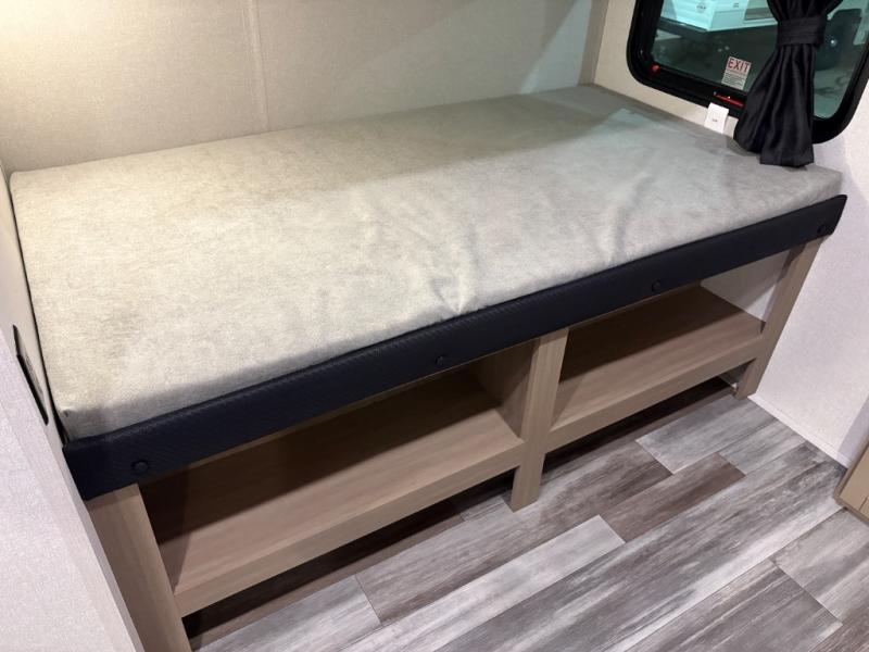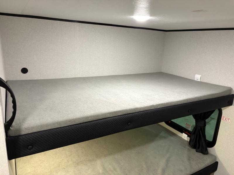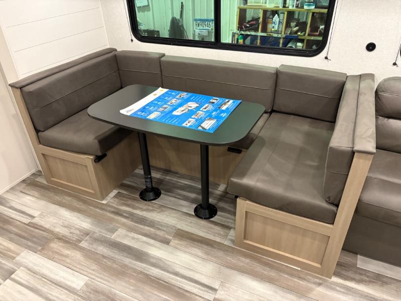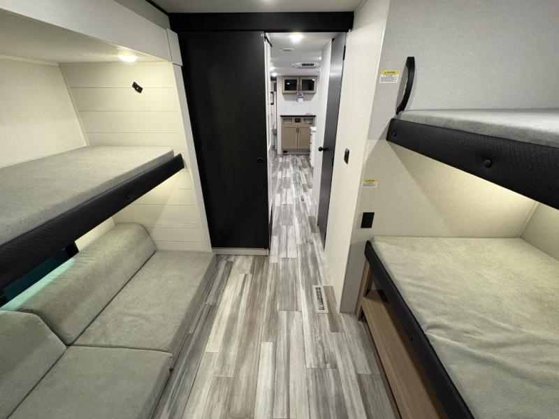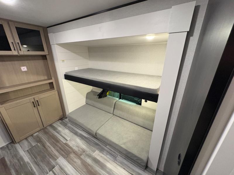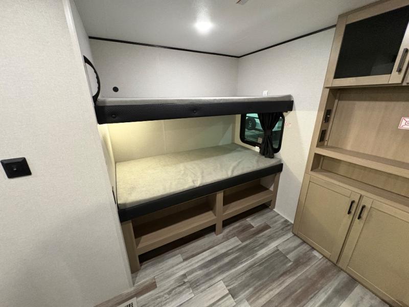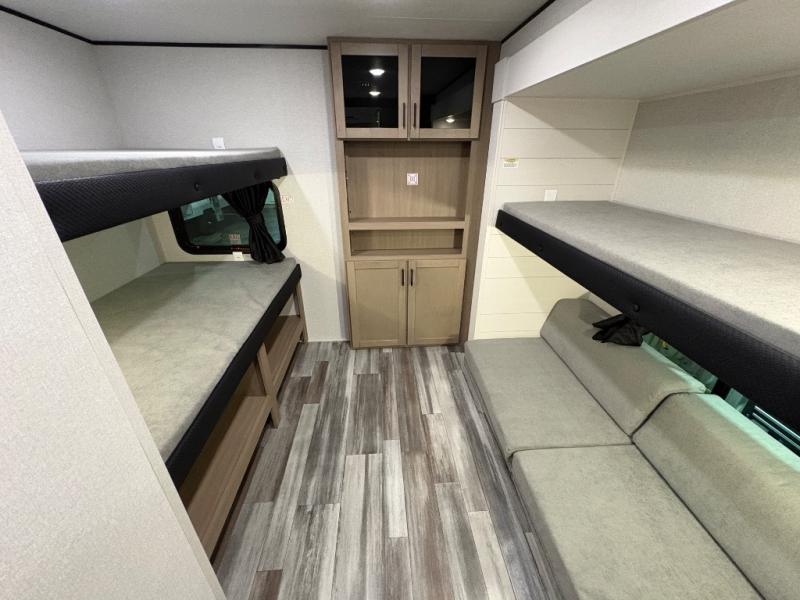 The whole gang can join along on camping trips in this double slide out travel trailer! There is a rear private bunkhouse with a bunk bed and J-cube futon sofa below plus two additional bunks across the room. You'll find your own space in the front private bedroom, which also includes an RV queen bed and dual wardrobes. The middle kitchen and living room will be a favorite place to come together since there is a jack-knife sofa and U-shaped dinette plus a fully-equipped kitchen to make meals each day. This model also includes a full bath with one of the dual entry doors for added convenience!