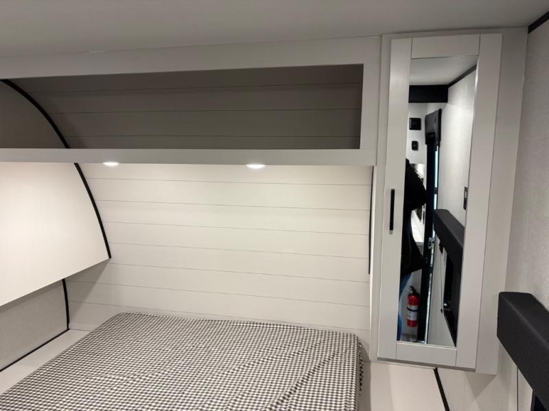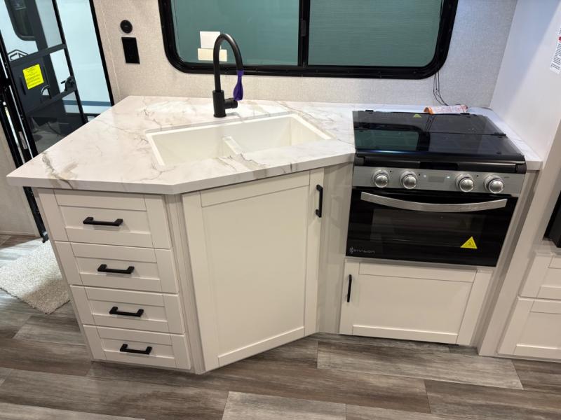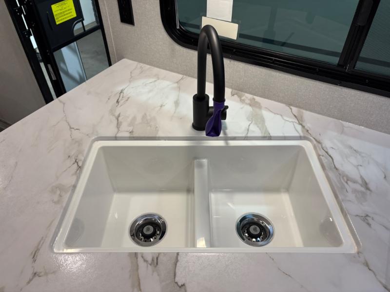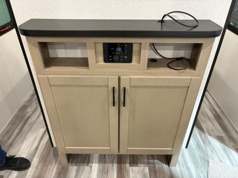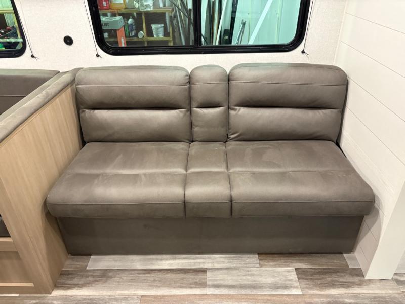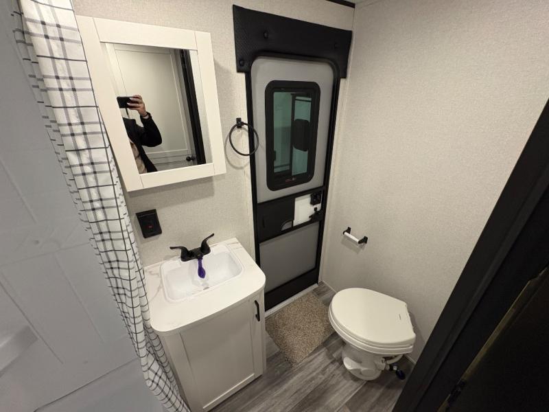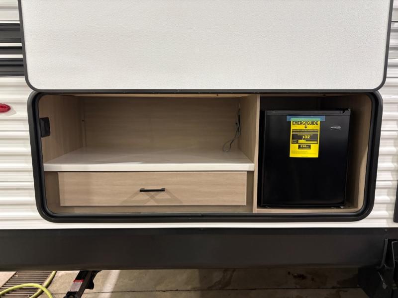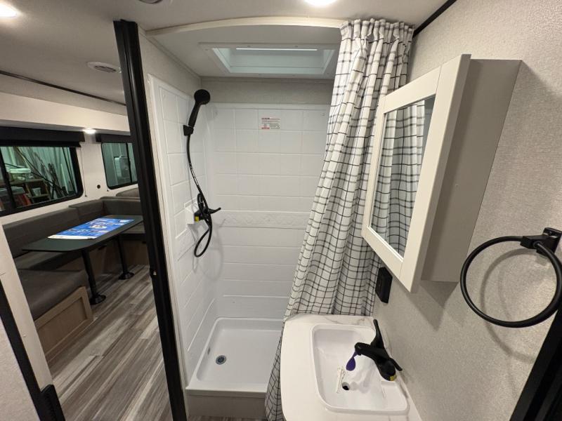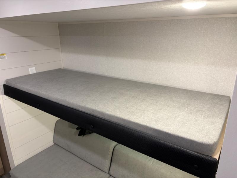 The whole gang can join along on camping trips in this double slide out travel trailer! There is a rear private bunkhouse with a bunk bed and J-cube futon sofa below plus two additional bunks across the room. You'll find your own space in the front private bedroom, which also includes an RV queen bed and dual wardrobes. The middle kitchen and living room will be a favorite place to come together since there is a jack-knife sofa and U-shaped dinette plus a fully-equipped kitchen to make meals each day. This model also includes a full bath with one of the dual entry doors for added convenience!