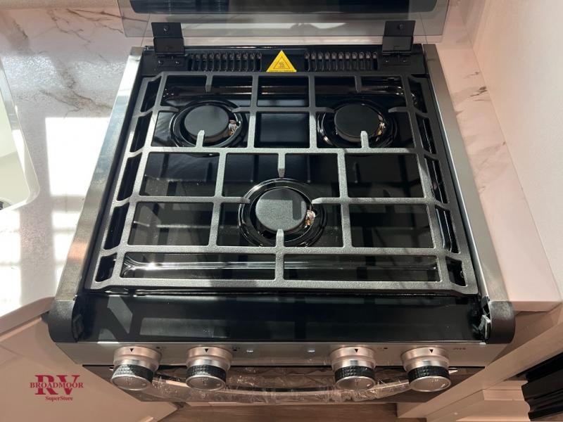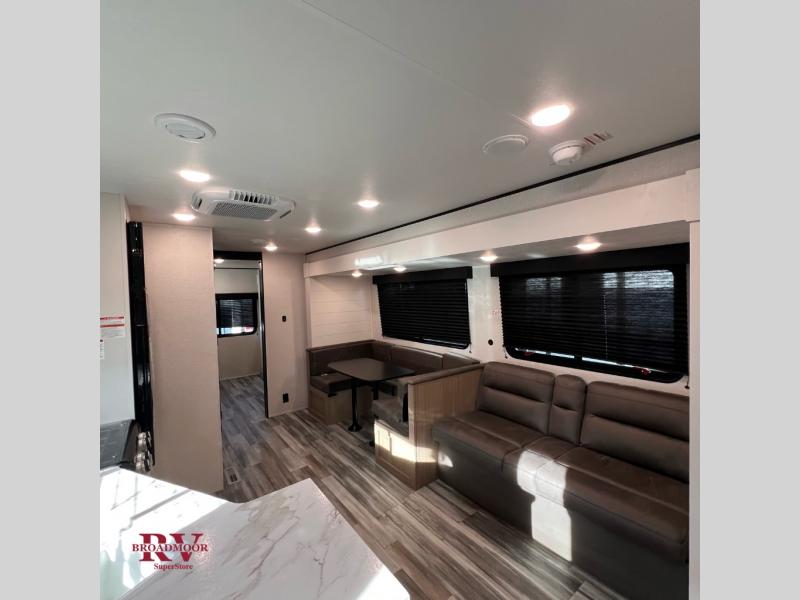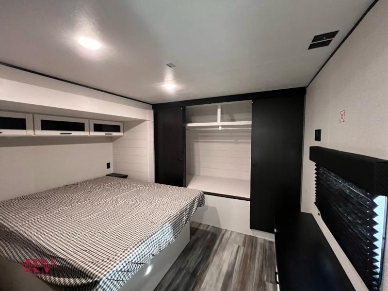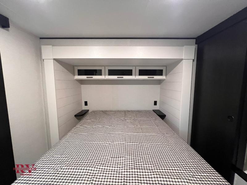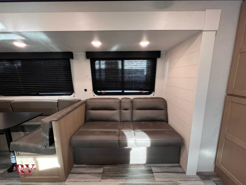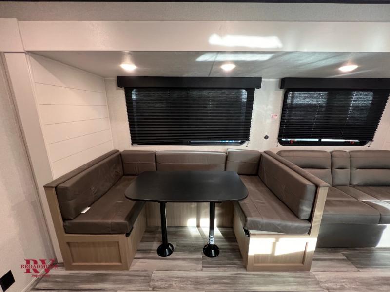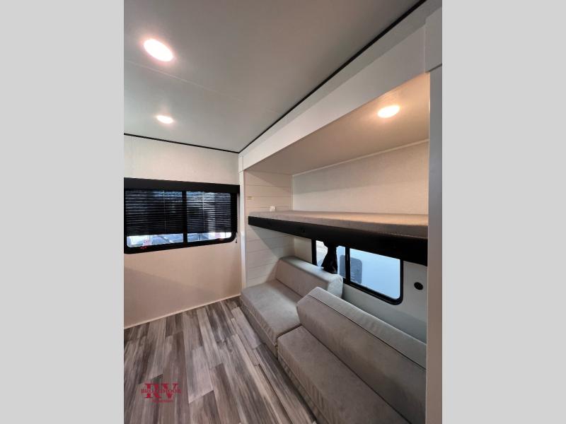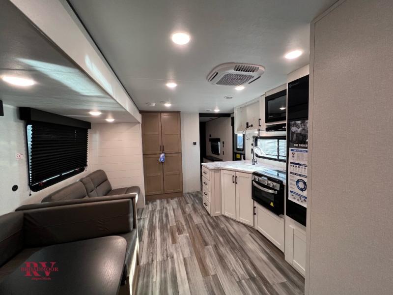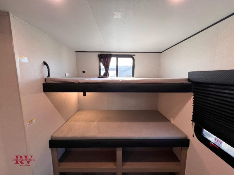 The whole gang can join along on camping trips in this triple slide out travel trailer! There is a rear private bunkhouse with a bunk bed and J-cube futon sofa below plus two additional bunks across the room. You'll find your own space in the front private bedroom, which also includes a queen bed slide out, a dresser, plus a front wardrobe and washer/dryer prep. The middle kitchen and living room will be a favorite place to come together since there is a jack-knife sofa and U-shaped dinette plus a fully equipped kitchen to make meals each day.