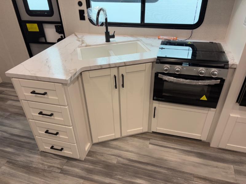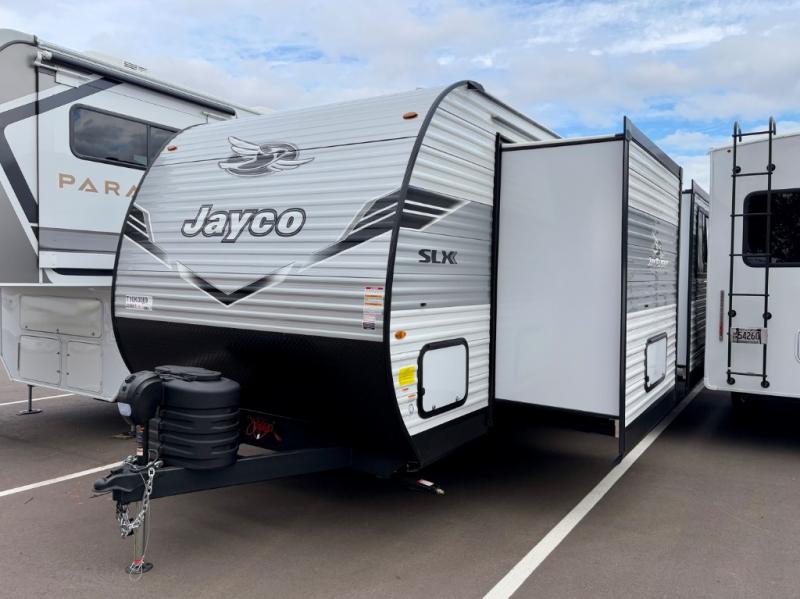 The Jayco Jay Flight SLX travel trailer is quite easy to own because it is lightweight for an easier towing experience. Built on a fully integrated A-frame with galvanized-steel, impact-resistant wheel wells, the Jay Flight SLX has quality at its very foundation. That quality continues on to the electric self-adjusting brakes, easy-lube hubs, Magnum Truss roof system, and LP quick connect. Some of what the mandatory Customer Value Package includes is backup camera prep, Keyed-Alike entry and baggage doors, and an on-demand tankless water heater.