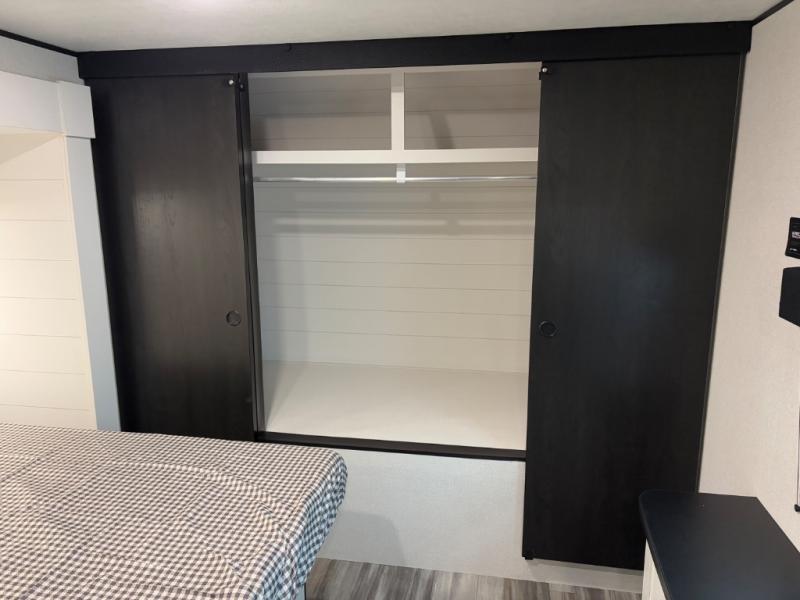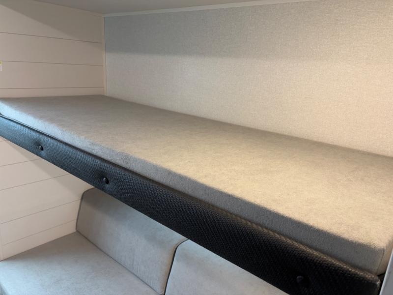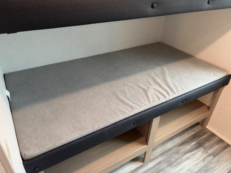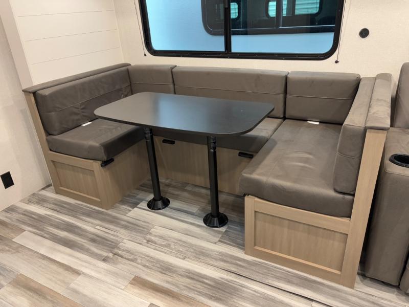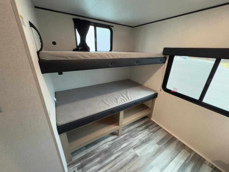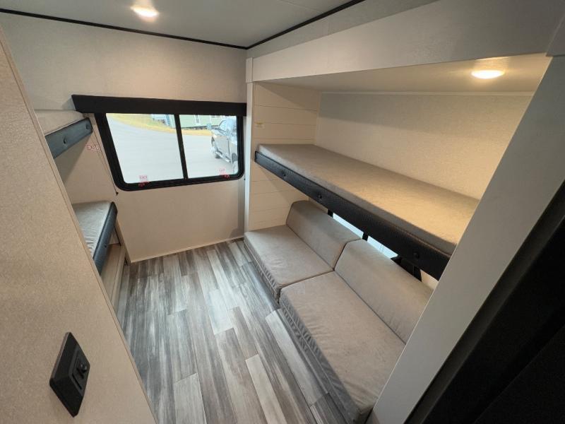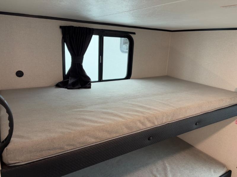 The whole gang can join along on camping trips in this triple slide out travel trailer! There is a rear private bunkhouse with a bunk bed and J-cube futon sofa below plus two additional bunks across the room. You'll find your own space in the front private bedroom, which also includes a queen bed slide out, a dresser, plus a front wardrobe and washer/dryer prep. The middle kitchen and living room will be a favorite place to come together since there is a jack-knife sofa and U-shaped dinette plus a fully equipped kitchen to make meals each day.