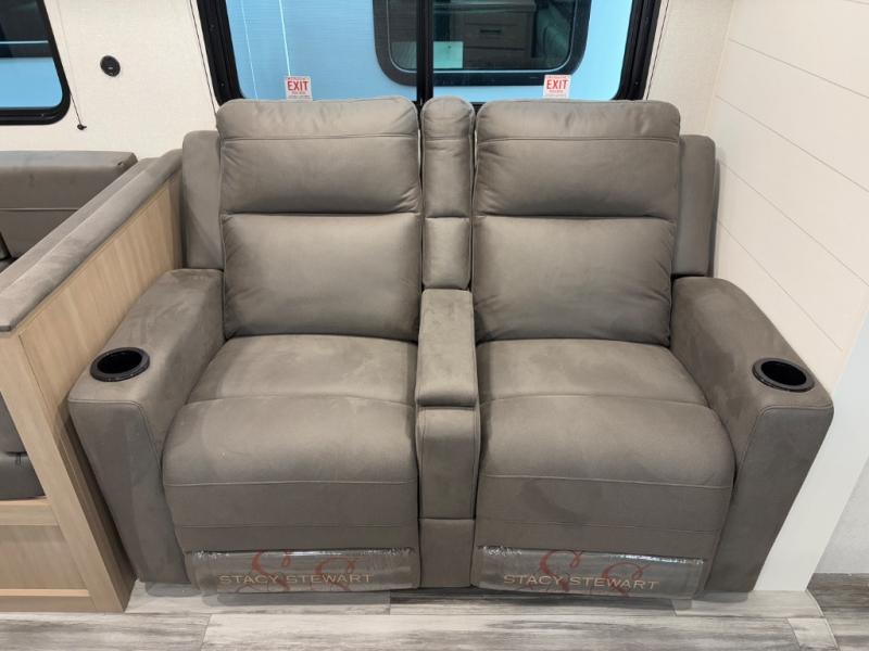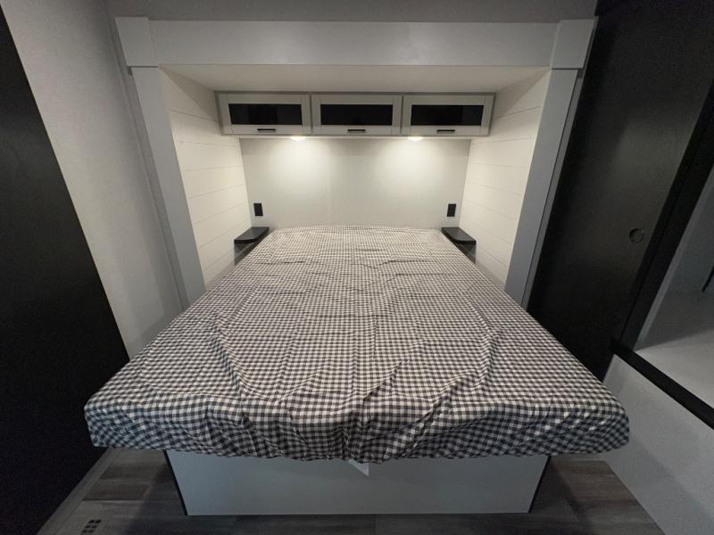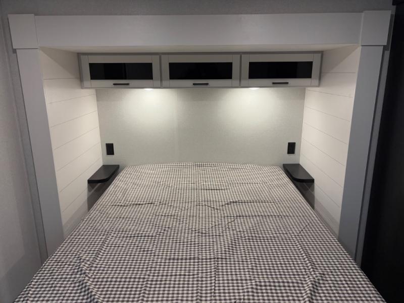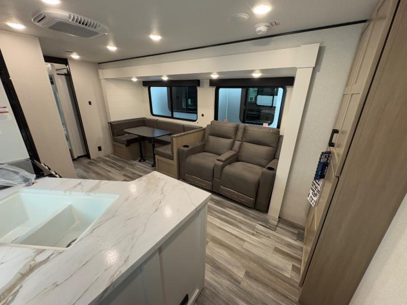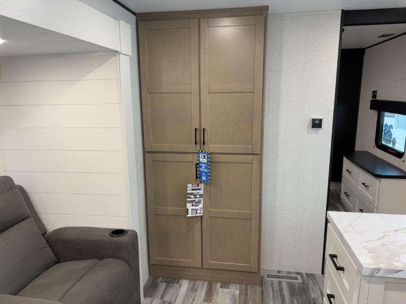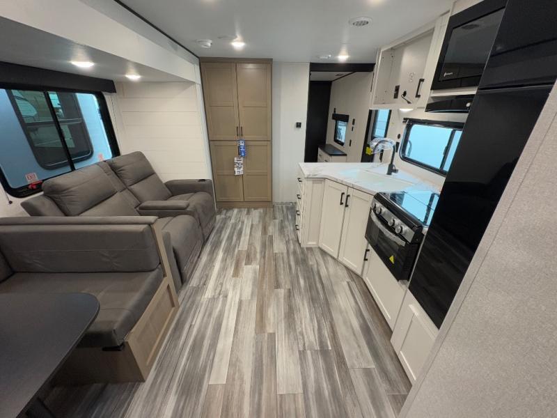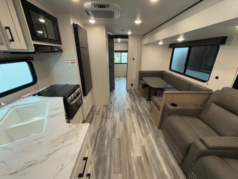 The whole gang can join along on camping trips in this triple slide out travel trailer! There is a rear private bunkhouse with a bunk bed and J-cube futon sofa below plus two additional bunks across the room. You'll find your own space in the front private bedroom, which also includes a queen bed slide out, a dresser, plus a front wardrobe and washer/dryer prep. The middle kitchen and living room will be a favorite place to come together since there is a jack-knife sofa and U-shaped dinette plus a fully equipped kitchen to make meals each day.