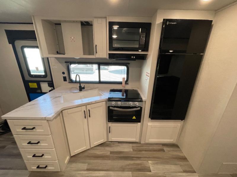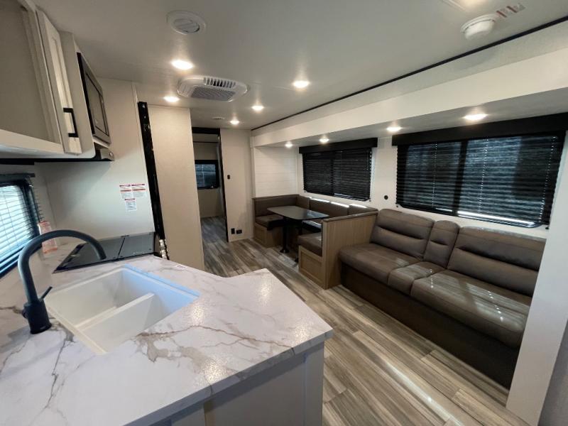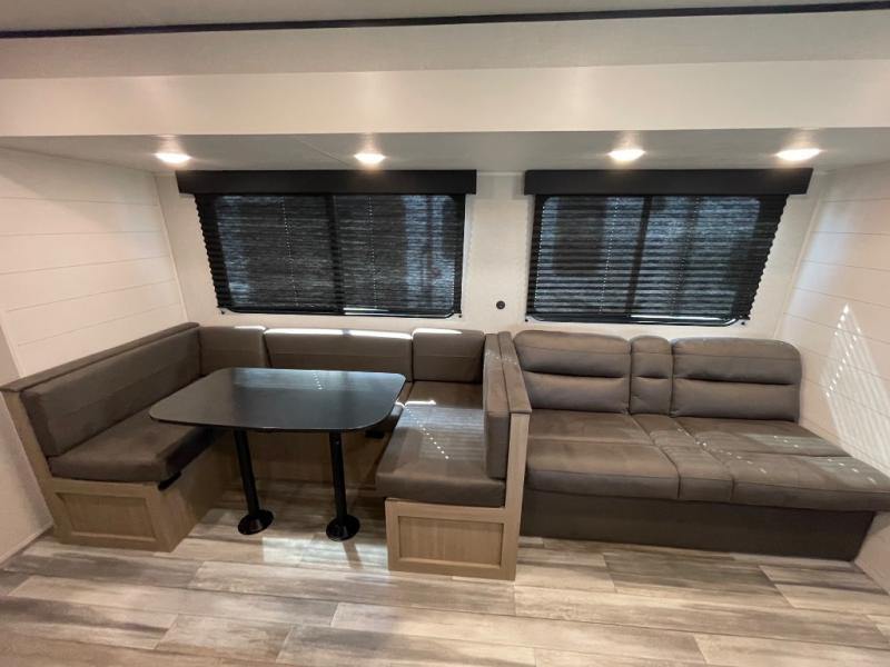 The whole gang can join along on camping trips in this triple slide out travel trailer! There is a rear private bunkhouse with a bunk bed and J-cube futon sofa below plus two additional bunks across the room. You'll find your own space in the front private bedroom, which also includes a queen bed slide out, a dresser, plus a front wardrobe and washer/dryer prep. The middle kitchen and living room will be a favorite place to come together since there is a jack-knife sofa and U-shaped dinette plus a fully equipped kitchen to make meals each day.
