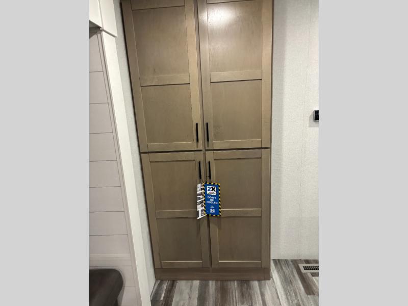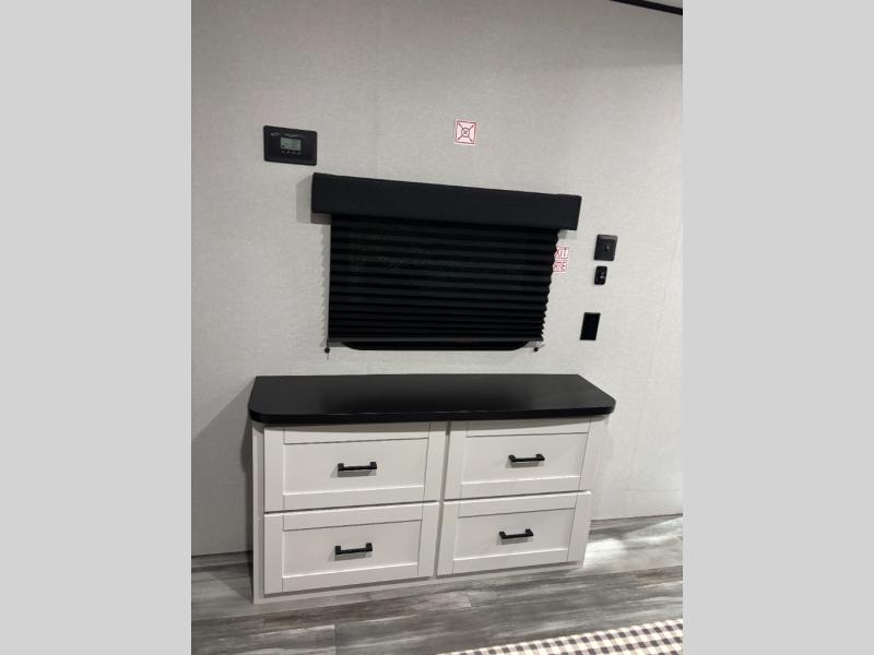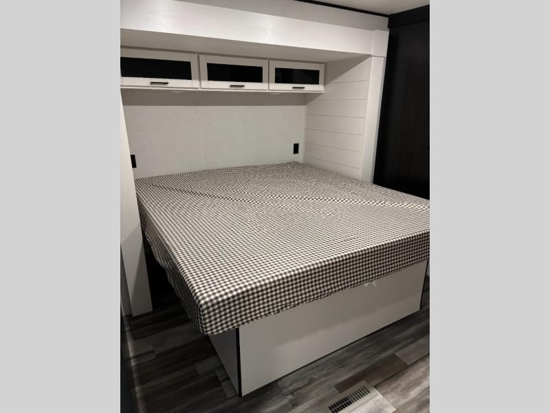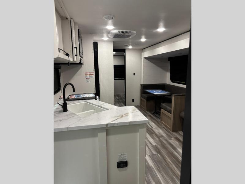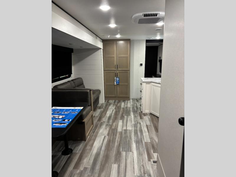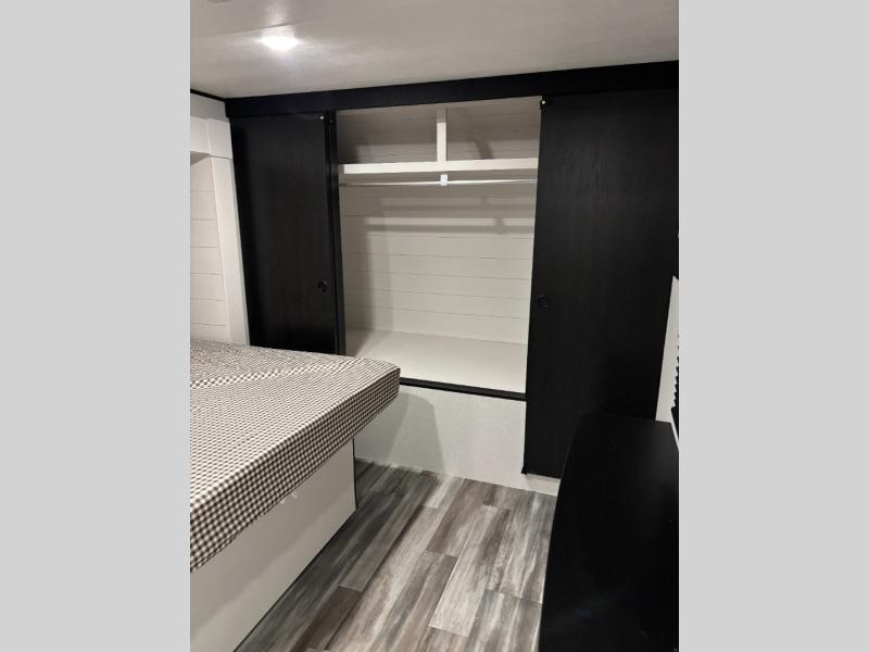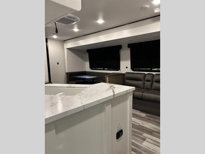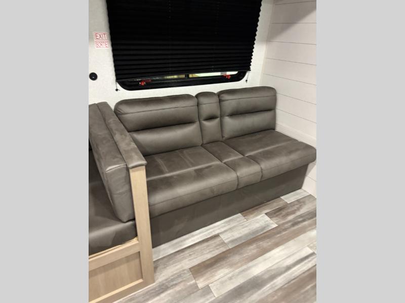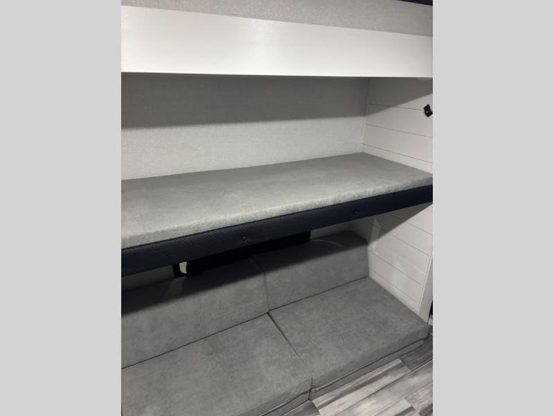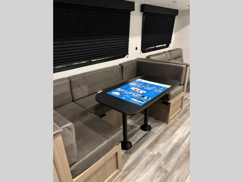 The whole gang can join along on camping trips in this triple slide out travel trailer! There is a rear private bunkhouse with a bunk bed and J-cube futon sofa below plus two additional bunks across the room. You'll find your own space in the front private bedroom, which also includes a queen bed slide out, a dresser, plus a front wardrobe and washer/dryer prep. The middle kitchen and living room will be a favorite place to come together since there is a jack-knife sofa and U-shaped dinette plus a fully equipped kitchen to make meals each day.