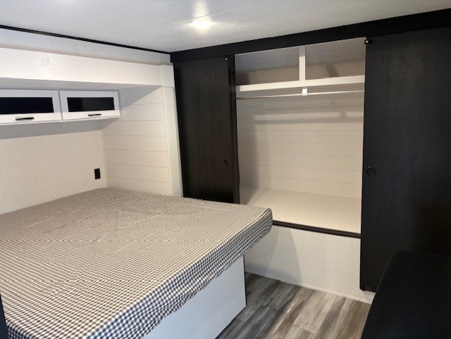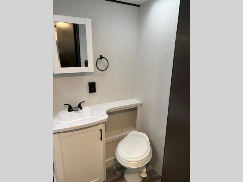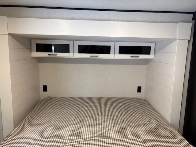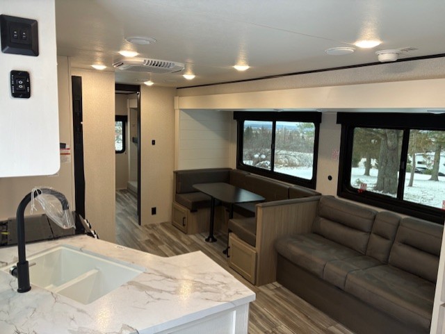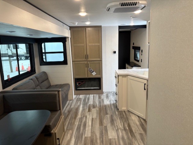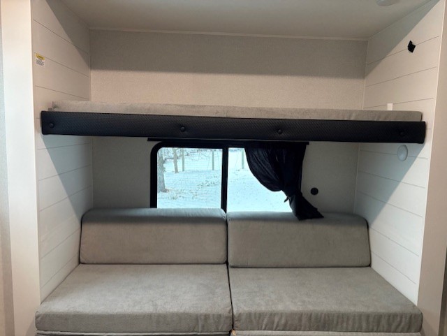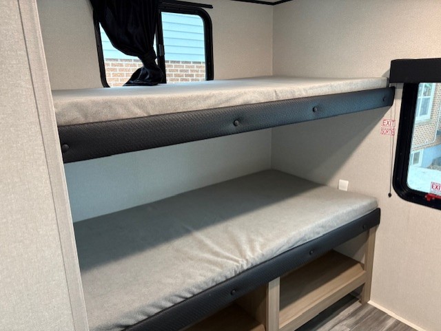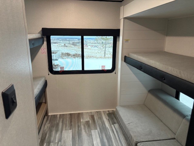 The whole gang can join along on camping trips in this triple slide out travel trailer! There is a rear private bunkhouse with a bunk bed and J-cube futon sofa below plus two additional bunks across the room. You'll find your own space in the front private bedroom, which also includes a queen bed slide out, a dresser, plus a front wardrobe and washer/dryer prep. The middle kitchen and living room will be a favorite place to come together since there is a jack-knife sofa and U-shaped dinette plus a fully equipped kitchen to make meals each day.