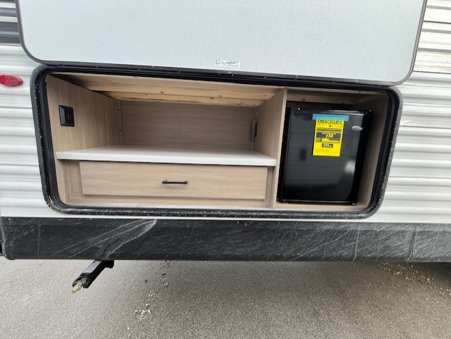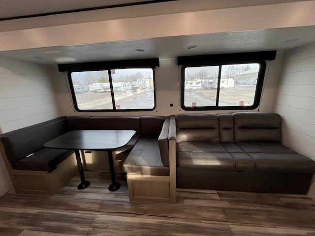 The whole gang can join along on camping trips in this triple slide out travel trailer! There is a rear private bunkhouse with a bunk bed and J-cube futon sofa below plus two additional bunks across the room. You'll find your own space in the front private bedroom, which also includes a queen bed slide out, a dresser, plus a front wardrobe and washer/dryer prep. The middle kitchen and living room will be a favorite place to come together since there is a jack-knife sofa and U-shaped dinette plus a fully equipped kitchen to make meals each day.