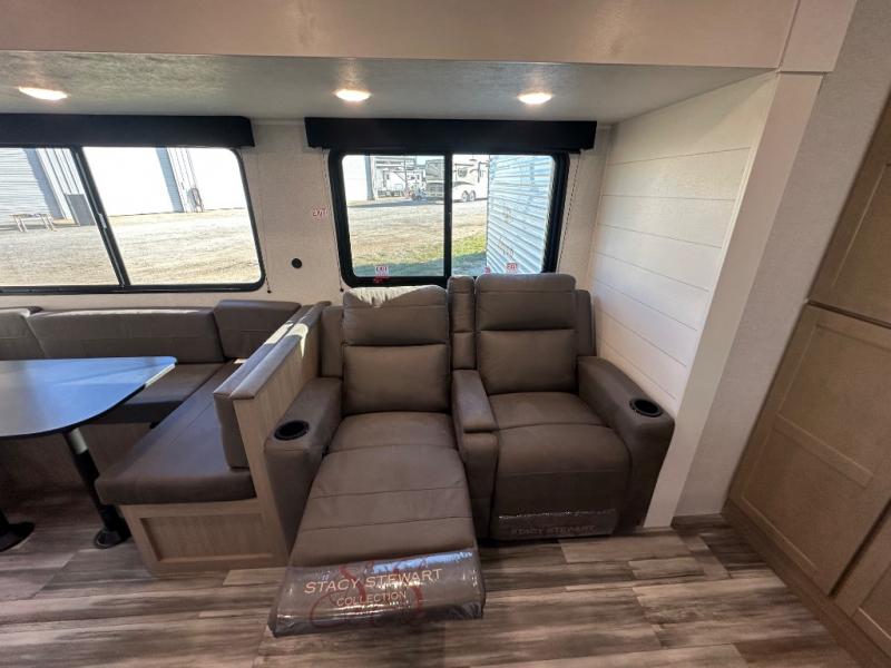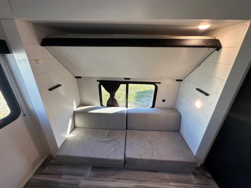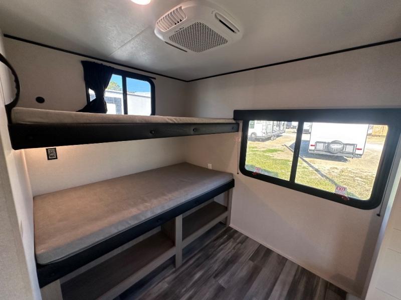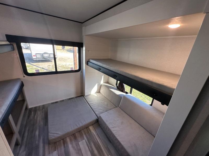 The whole gang can join along on camping trips in this triple slide out travel trailer! There is a rear private bunkhouse with a bunk bed and J-cube futon sofa below plus two additional bunks across the room. You'll find your own space in the front private bedroom, which also includes a queen bed slide out, a dresser, plus a front wardrobe and washer/dryer prep. The middle kitchen and living room will be a favorite place to come together since there is a jack-knife sofa and U-shaped dinette plus a fully equipped kitchen to make meals each day.