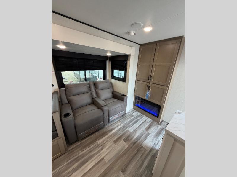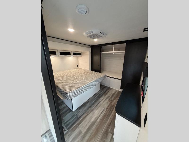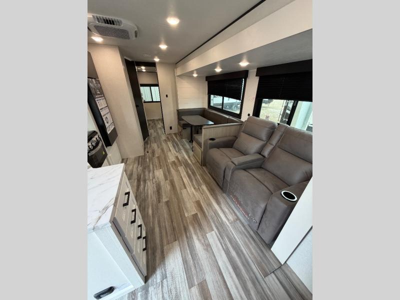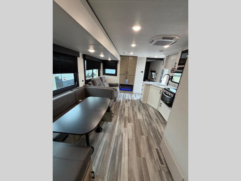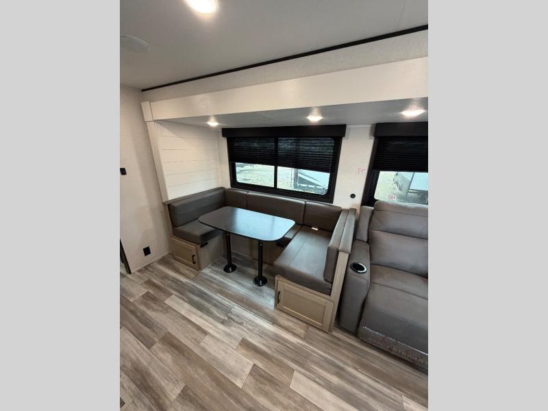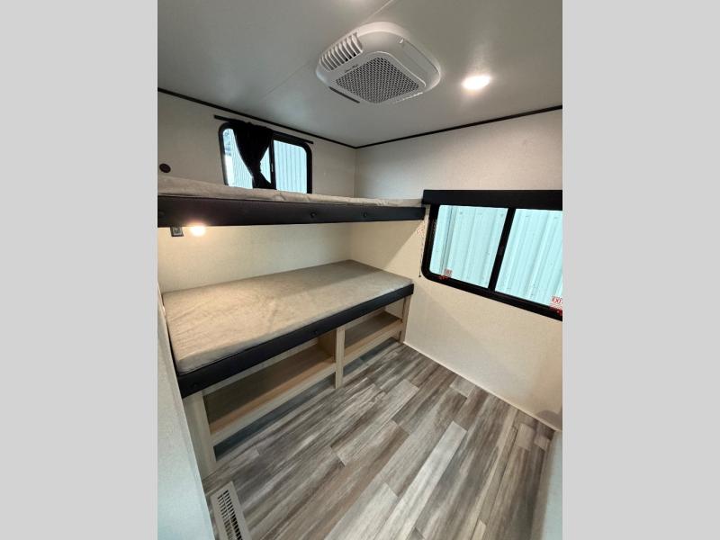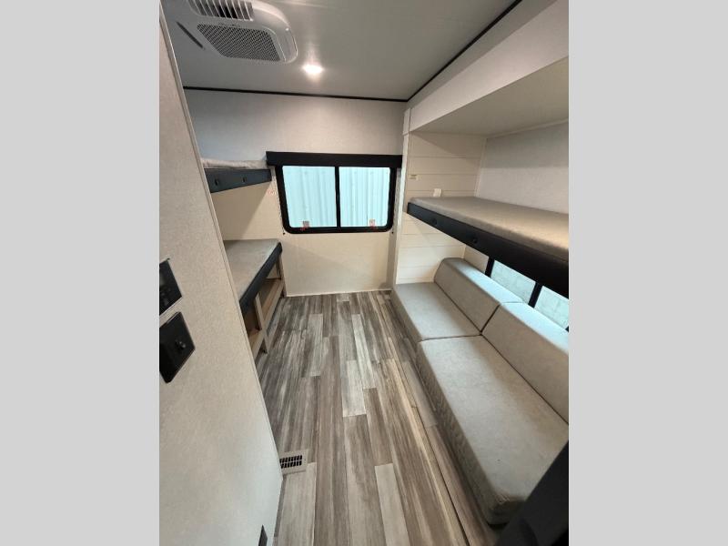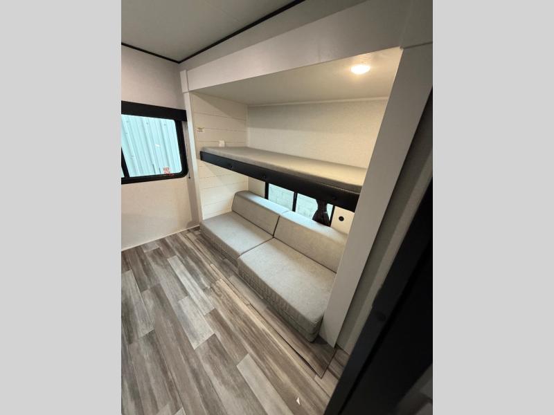 The whole gang can join along on camping trips in this triple slide out travel trailer! There is a rear private bunkhouse with a bunk bed and J-cube futon sofa below plus two additional bunks across the room. You'll find your own space in the front private bedroom, which also includes a queen bed slide out, a dresser, plus a front wardrobe and washer/dryer prep. The middle kitchen and living room will be a favorite place to come together since there is a jack-knife sofa and U-shaped dinette plus a fully equipped kitchen to make meals each day.