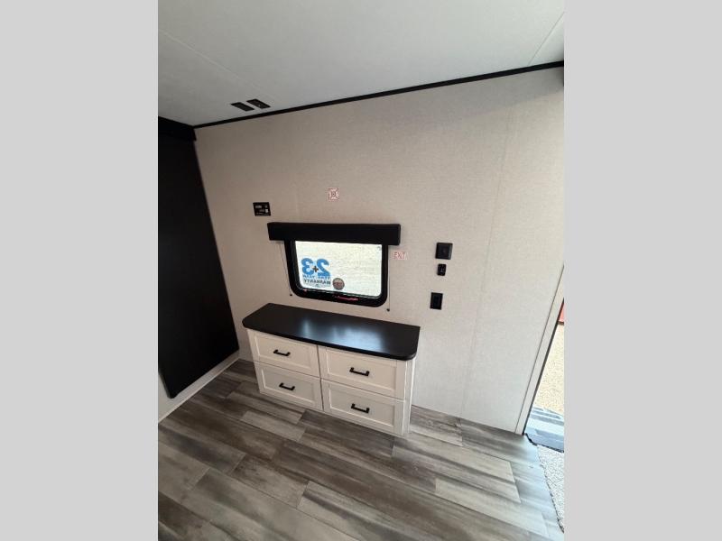 The Jayco Jay Flight SLX travel trailer is quite easy to own because it is lightweight for an easier towing experience. Built on a fully integrated A-frame with galvanized-steel, impact-resistant wheel wells, the Jay Flight SLX has quality at its very foundation. That quality continues on to the electric self-adjusting brakes, easy-lube hubs, Magnum Truss roof system, and LP quick connect. Some of what the mandatory Customer Value Package includes is backup camera prep, Keyed-Alike entry and baggage doors, and an on-demand tankless water heater.