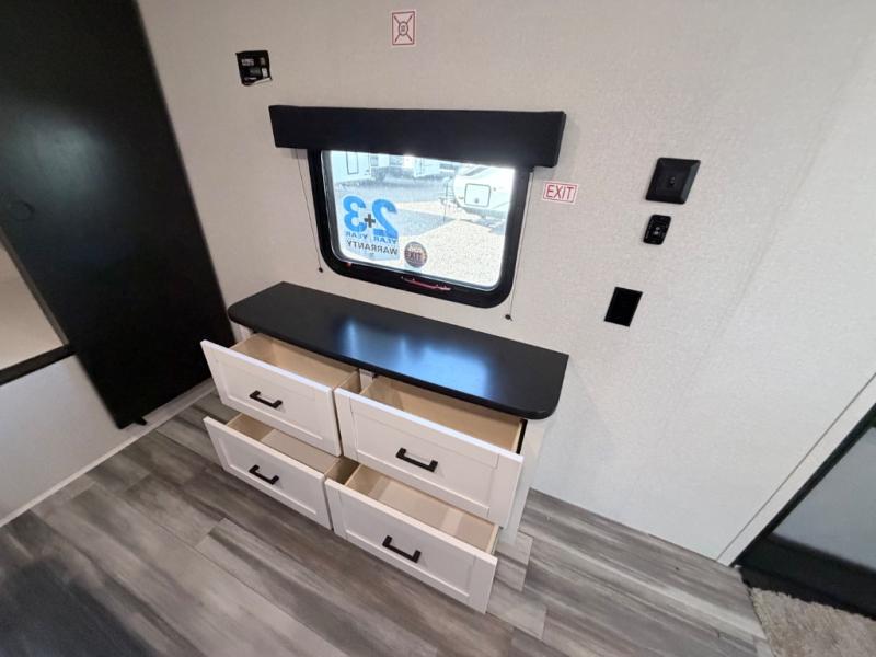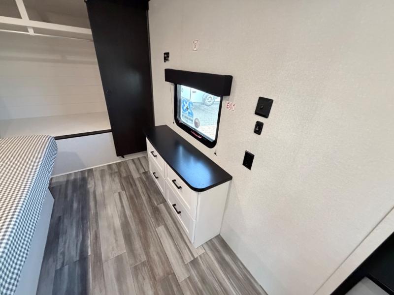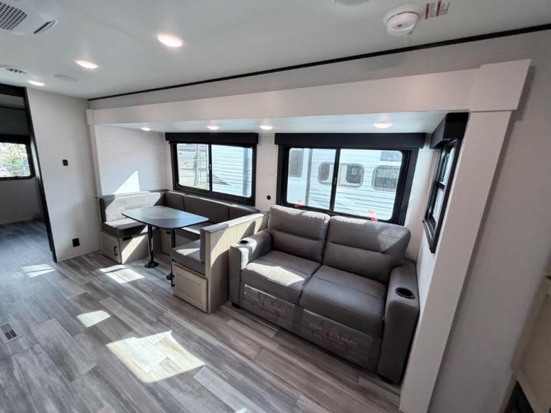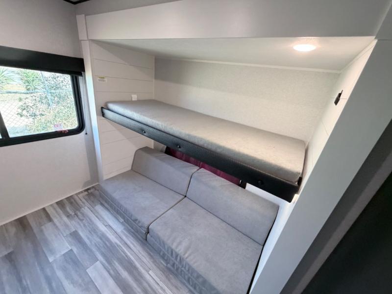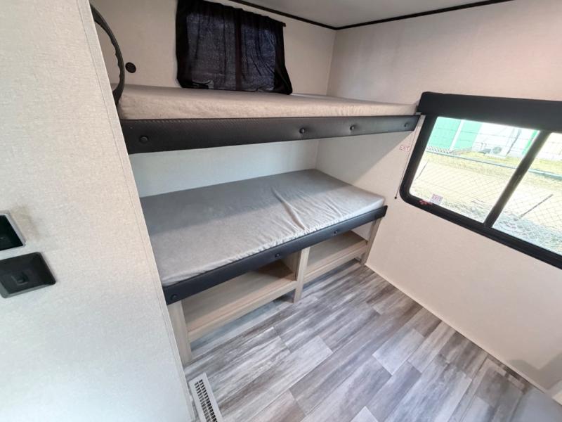 The whole gang can join along on camping trips in this triple slide out travel trailer! There is a rear private bunkhouse with a bunk bed and J-cube futon sofa below plus two additional bunks across the room. You'll find your own space in the front private bedroom, which also includes a queen bed slide out, a dresser, plus a front wardrobe and washer/dryer prep. The middle kitchen and living room will be a favorite place to come together since there is a jack-knife sofa and U-shaped dinette plus a fully equipped kitchen to make meals each day.
