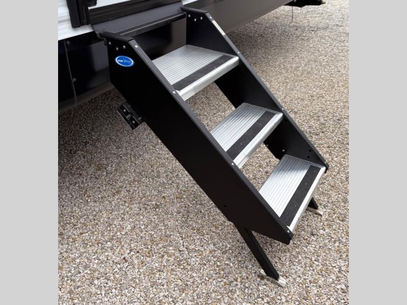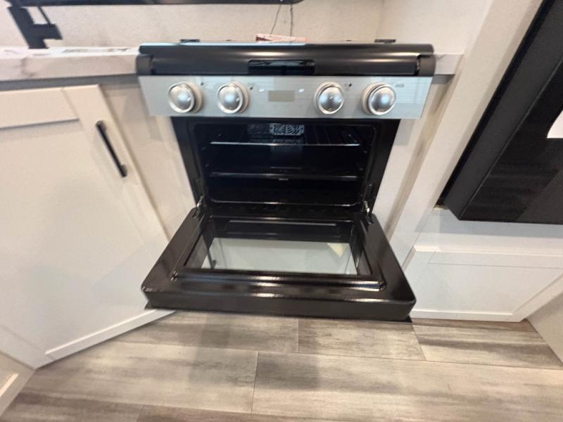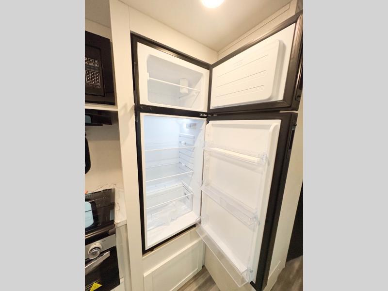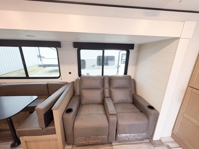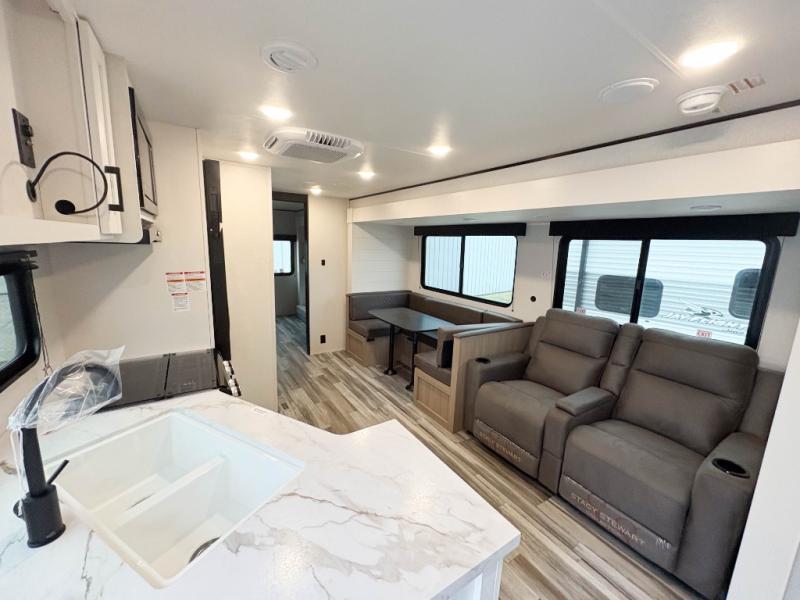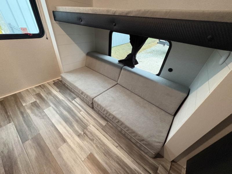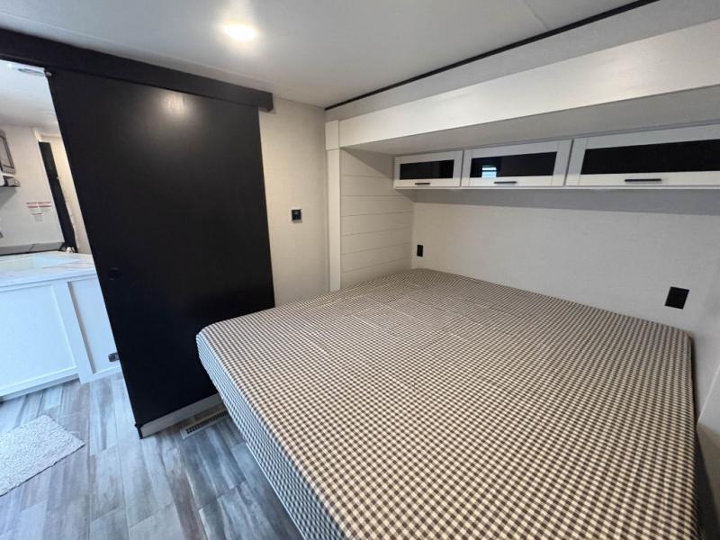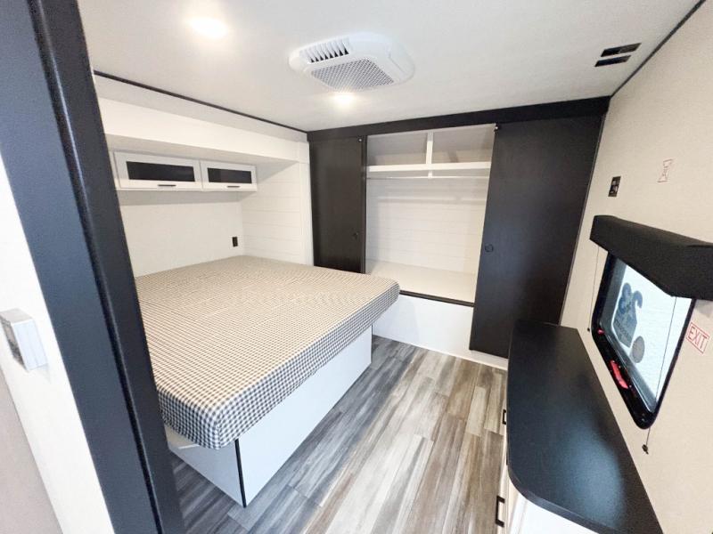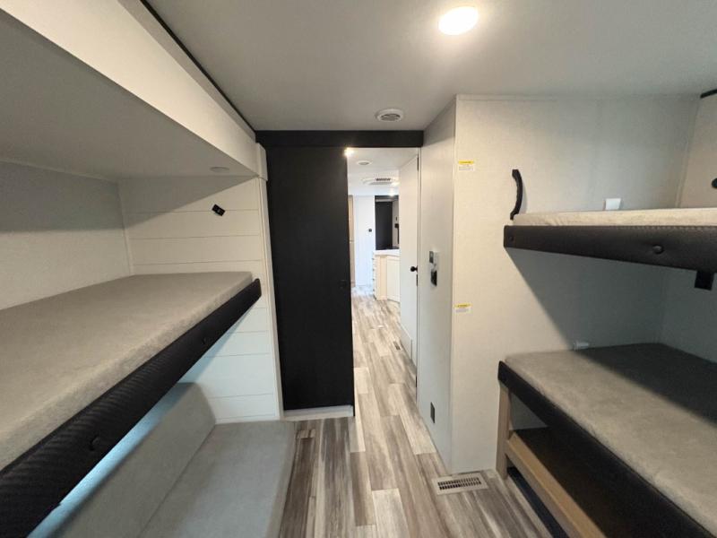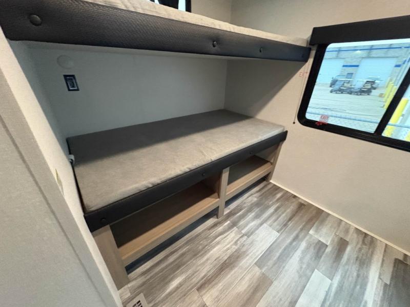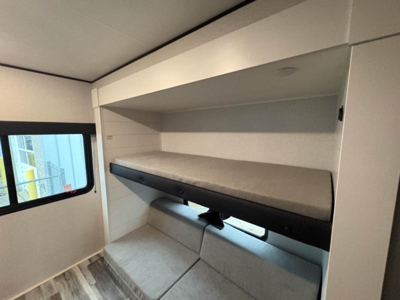 The whole gang can join along on camping trips in this triple slide out travel trailer! There is a rear private bunkhouse with a bunk bed and J-cube futon sofa below plus two additional bunks across the room. You'll find your own space in the front private bedroom, which also includes a queen bed slide out, a dresser, plus a front wardrobe and washer/dryer prep. The middle kitchen and living room will be a favorite place to come together since there is a jack-knife sofa and U-shaped dinette plus a fully equipped kitchen to make meals each day.