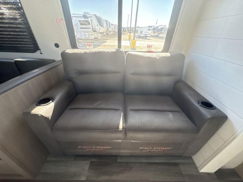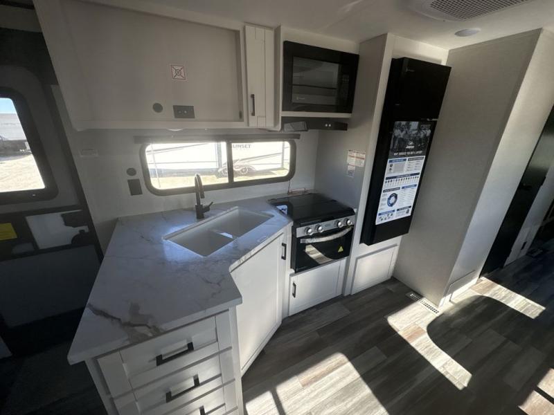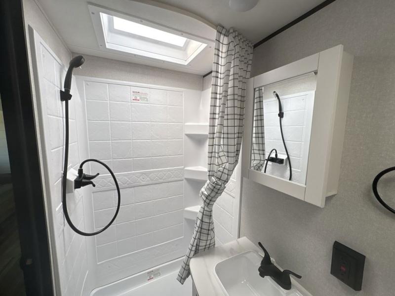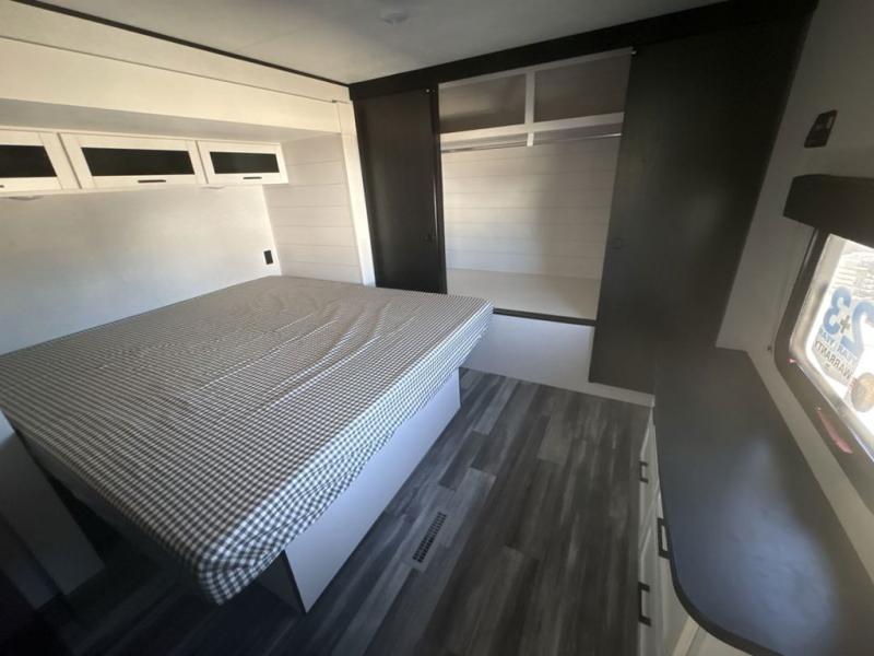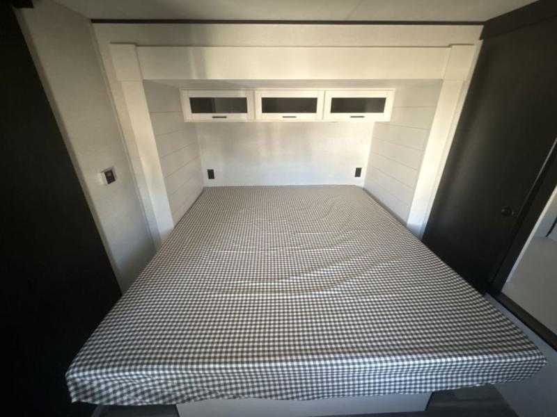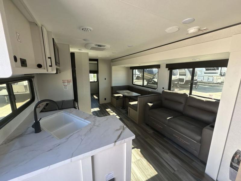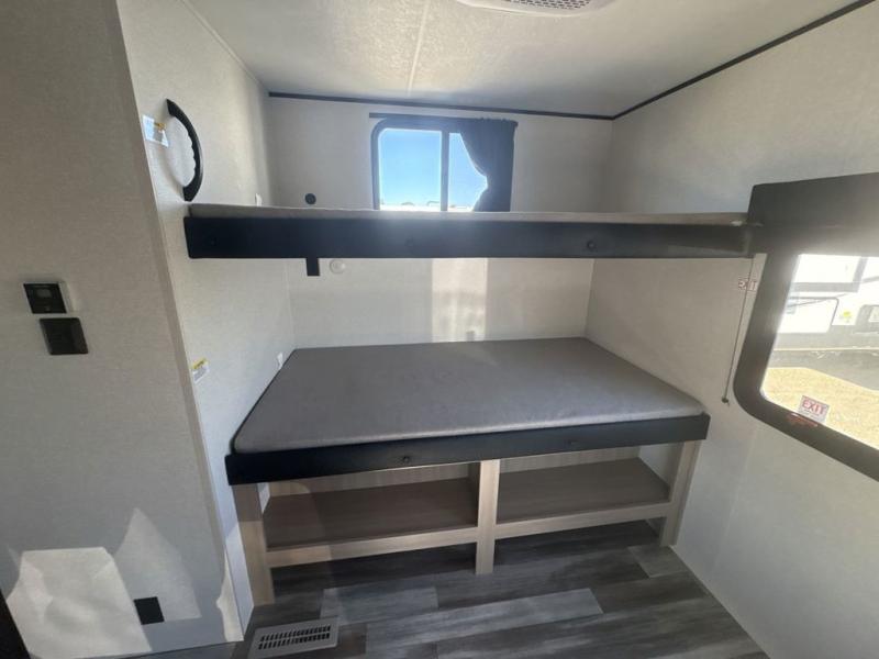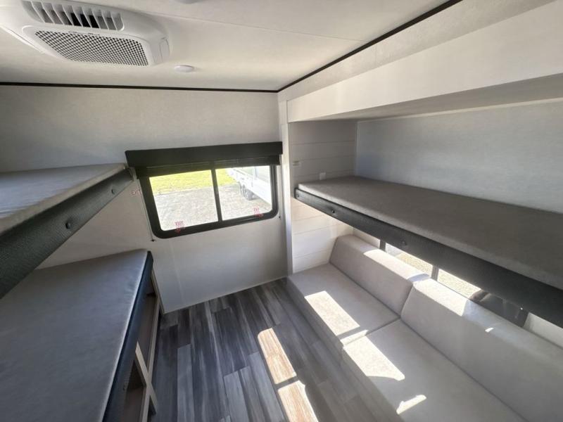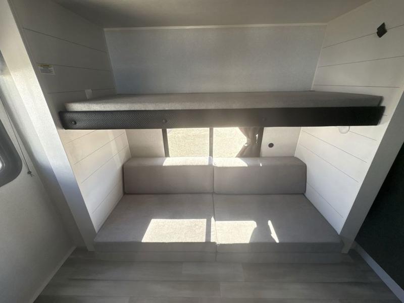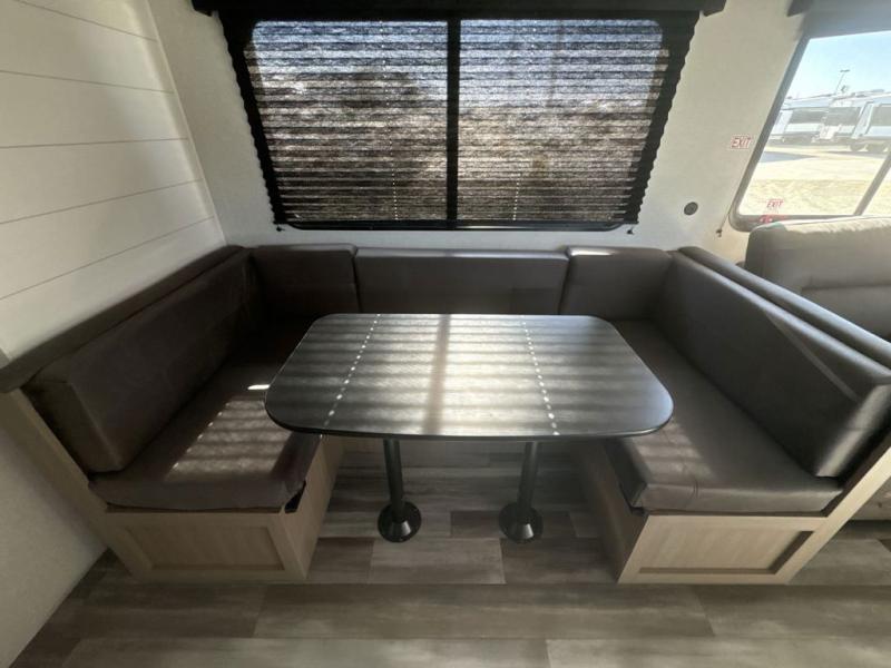 The whole gang can join along on camping trips in this triple slide out travel trailer! There is a rear private bunkhouse with a bunk bed and J-cube futon sofa below plus two additional bunks across the room. You'll find your own space in the front private bedroom, which also includes a queen bed slide out, a dresser, plus a front wardrobe and washer/dryer prep. The middle kitchen and living room will be a favorite place to come together since there is a jack-knife sofa and U-shaped dinette plus a fully equipped kitchen to make meals each day.