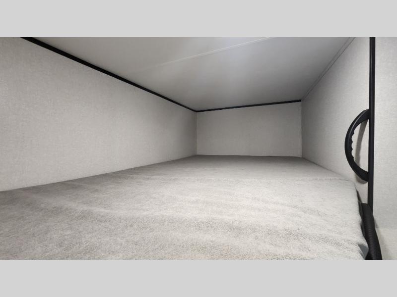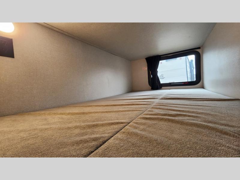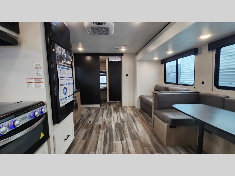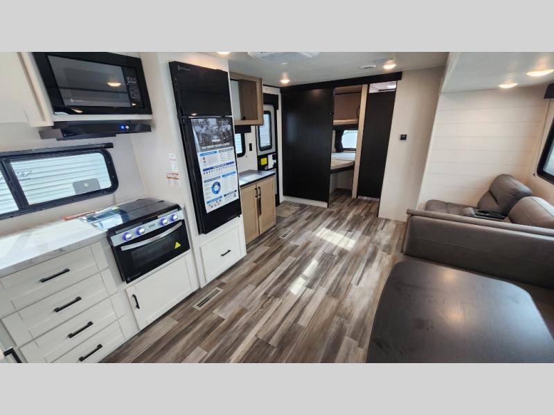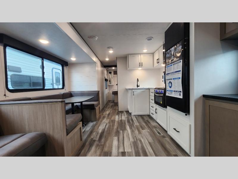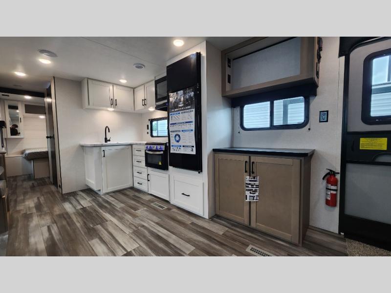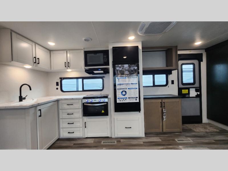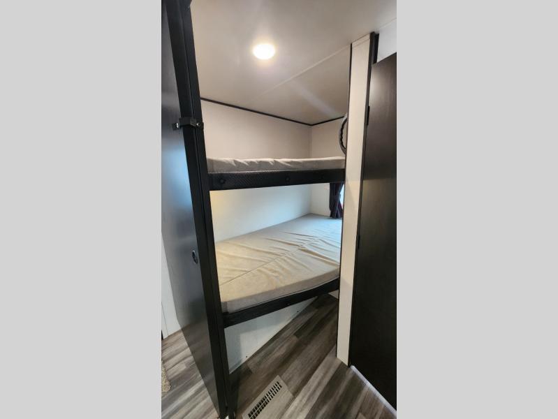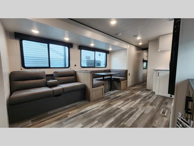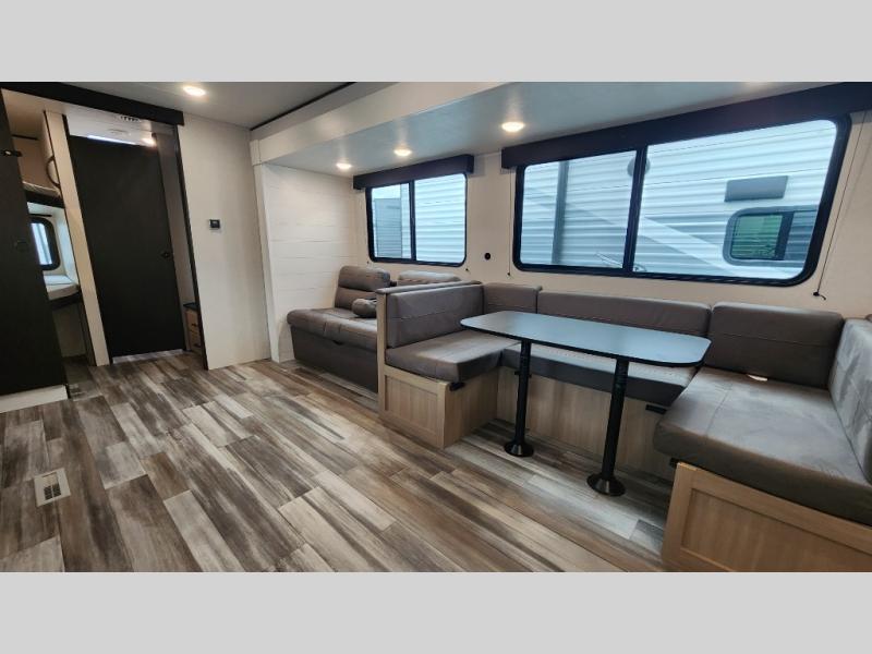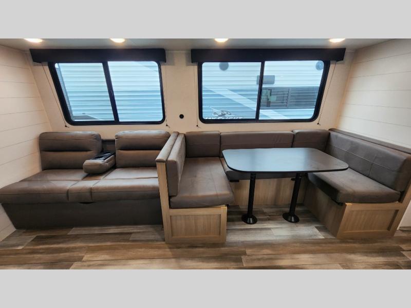 It's time to ditch that old tent and upgrade to this spacious travel trailer! The little ones or your guests will love the double-size bunks in the rear bunkhouse, along with a half bath and storage space for their things. You'll enjoy the front private bedroom all to yourselves with a queen bed and dual wardrobes, and the full bath is close by for easy nighttime use. A U-shaped dinette slide and sofa in the main living area provide your crew with space to relax and dine together, and the fully equipped kitchen lets you cook up your best meals. Outside, you'll find exterior storage, a 20' power awning, plus an outdoor kitchen to enjoy a sunrise breakfast!