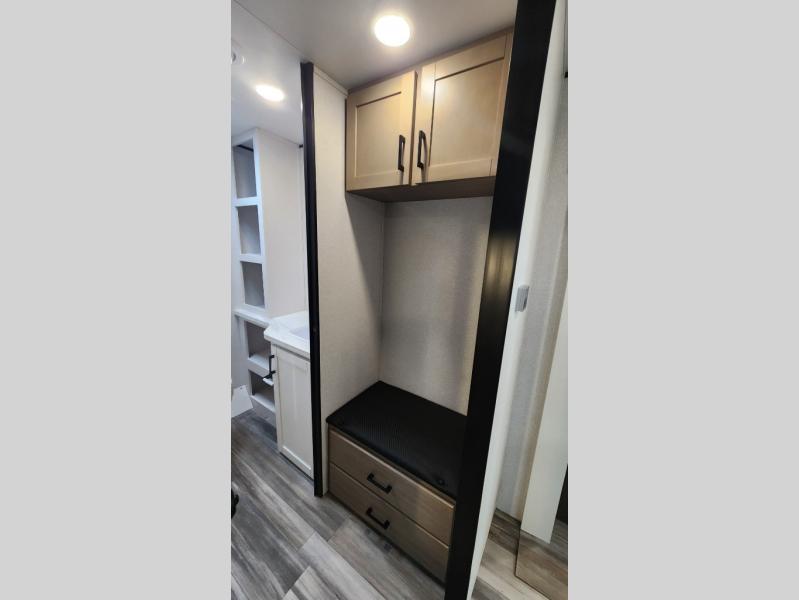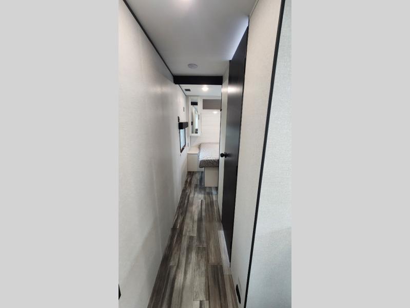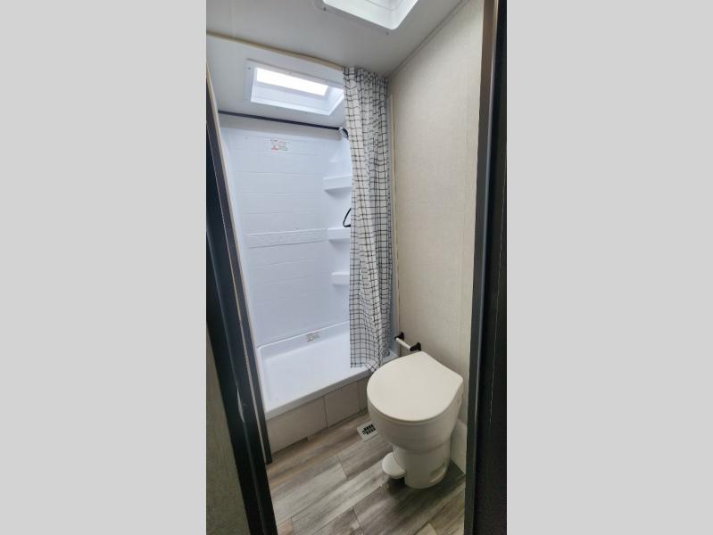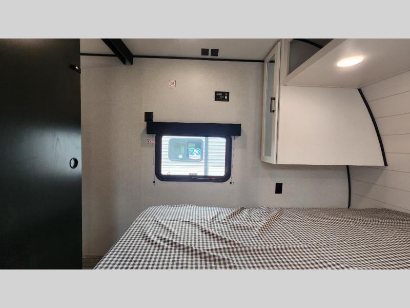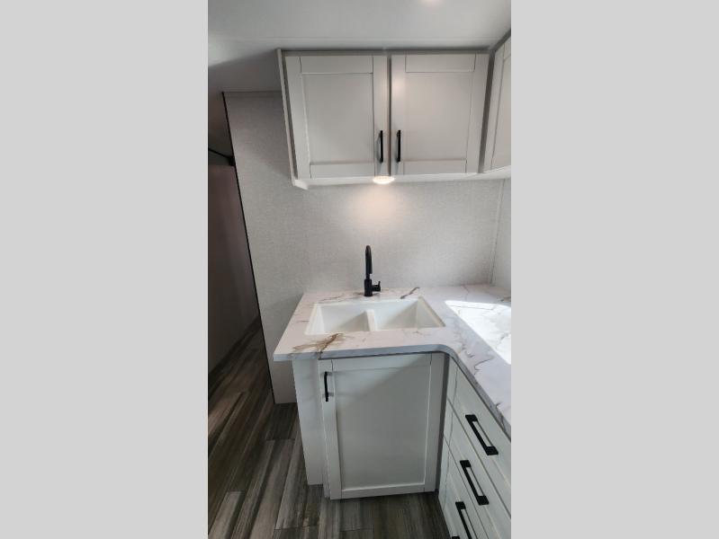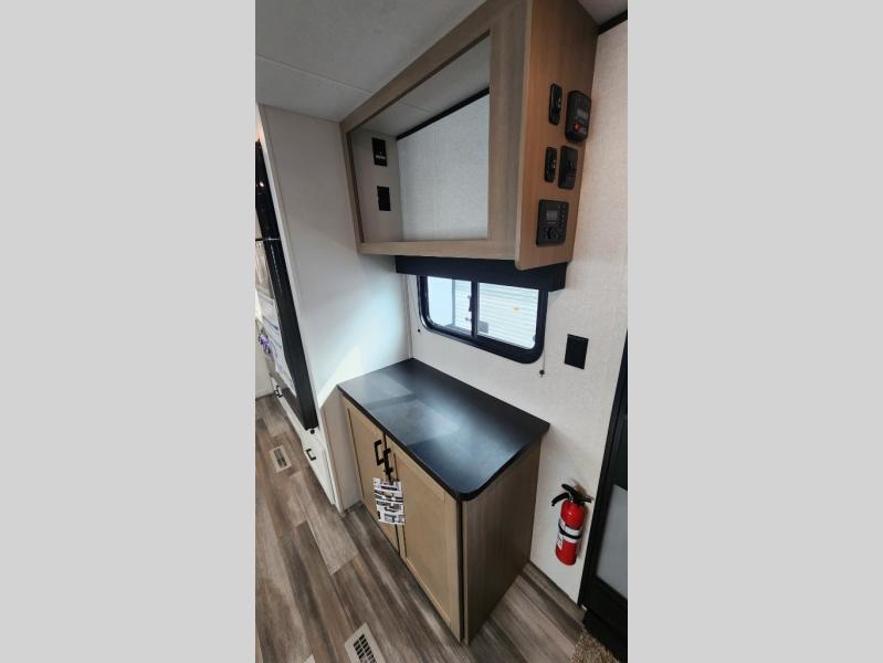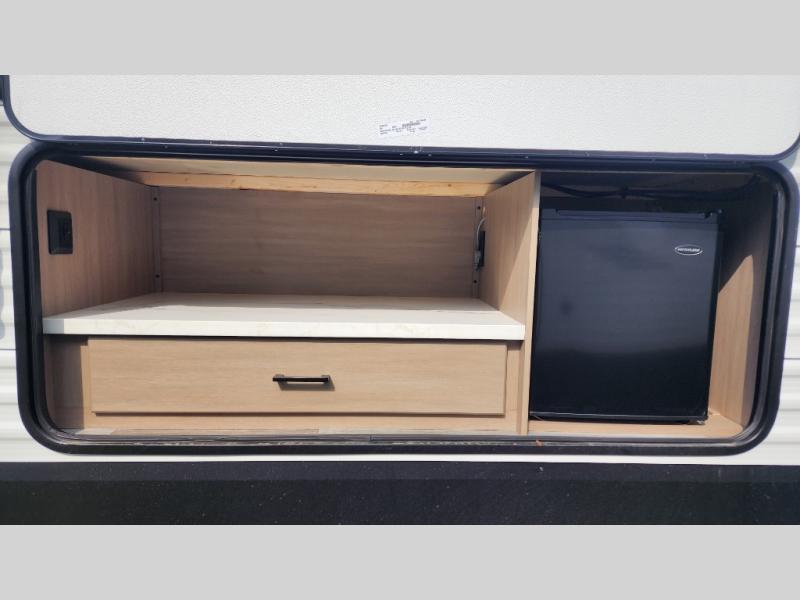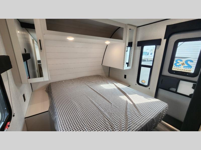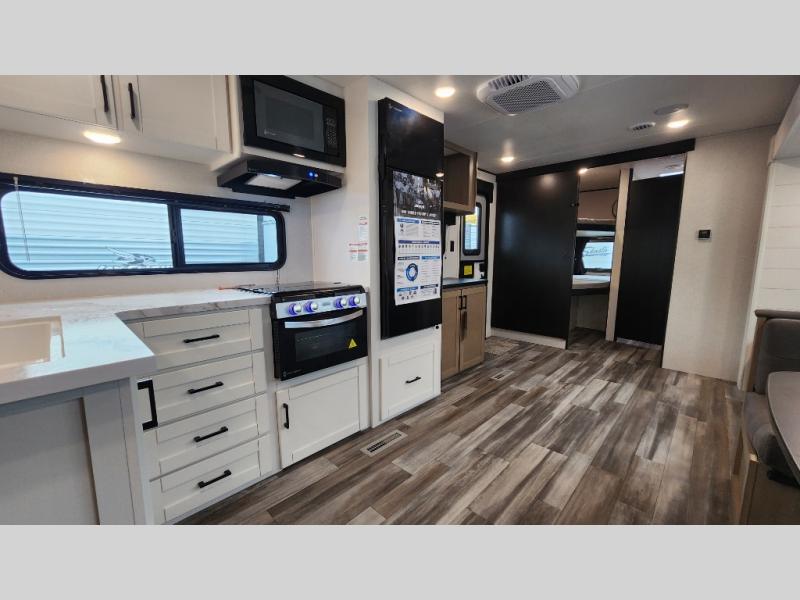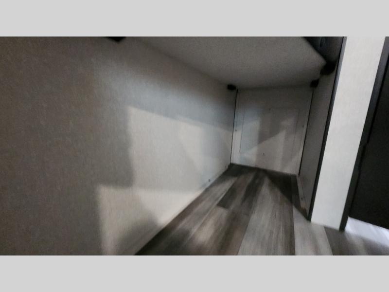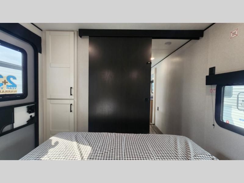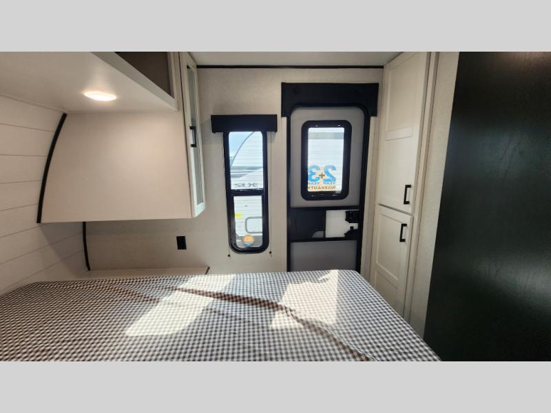 It's time to ditch that old tent and upgrade to this spacious travel trailer! The little ones or your guests will love the double-size bunks in the rear bunkhouse, along with a half bath and storage space for their things. You'll enjoy the front private bedroom all to yourselves with a queen bed and dual wardrobes, and the full bath is close by for easy nighttime use. A U-shaped dinette slide and sofa in the main living area provide your crew with space to relax and dine together, and the fully equipped kitchen lets you cook up your best meals. Outside, you'll find exterior storage, a 20' power awning, plus an outdoor kitchen to enjoy a sunrise breakfast!