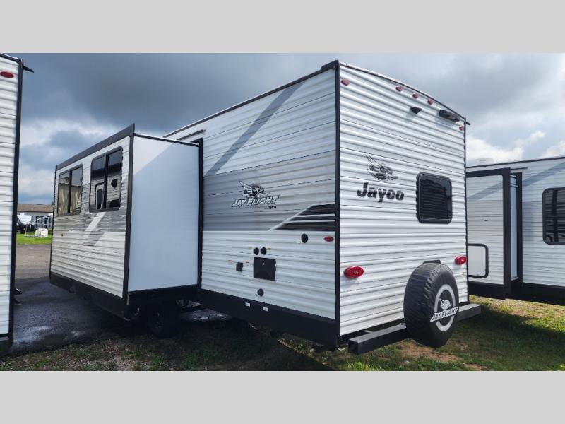 The Jayco Jay Flight SLX travel trailer is quite easy to own because it is lightweight for an easier towing experience. Built on a fully integrated A-frame with galvanized-steel, impact-resistant wheel wells, the Jay Flight SLX has quality at its very foundation. That quality continues on to the electric self-adjusting brakes, easy-lube hubs, Magnum Truss roof system, and LP quick connect. Some of what the mandatory Customer Value Package includes is backup camera prep, Keyed-Alike entry and baggage doors, and an on-demand tankless water heater.